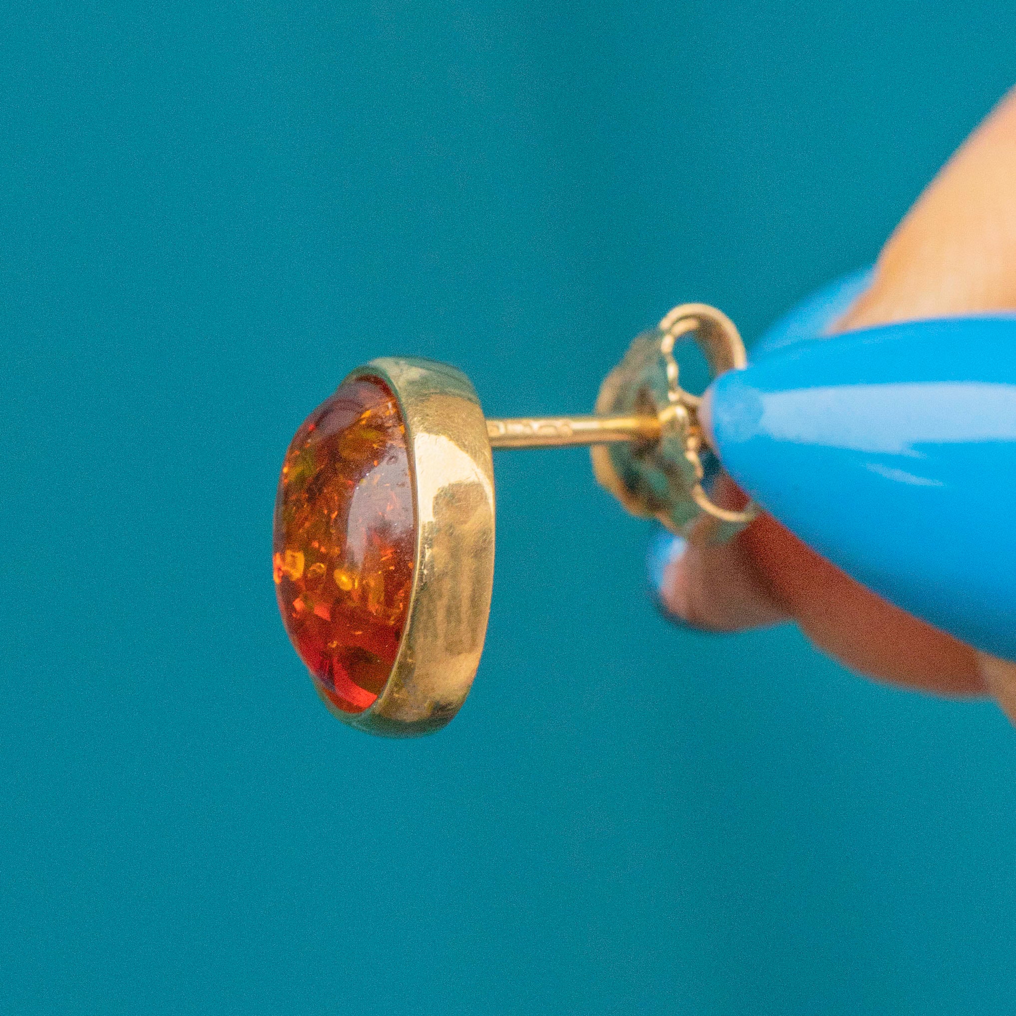 These 9ct Gold Amber stud earrings are akin to pools of marmalade! Smooth Amber cabochons flaunting tangy tangerine and Merigold sit snug within 9ct Gold bezel settings, flaunting beautiful natural inclusions at their core.