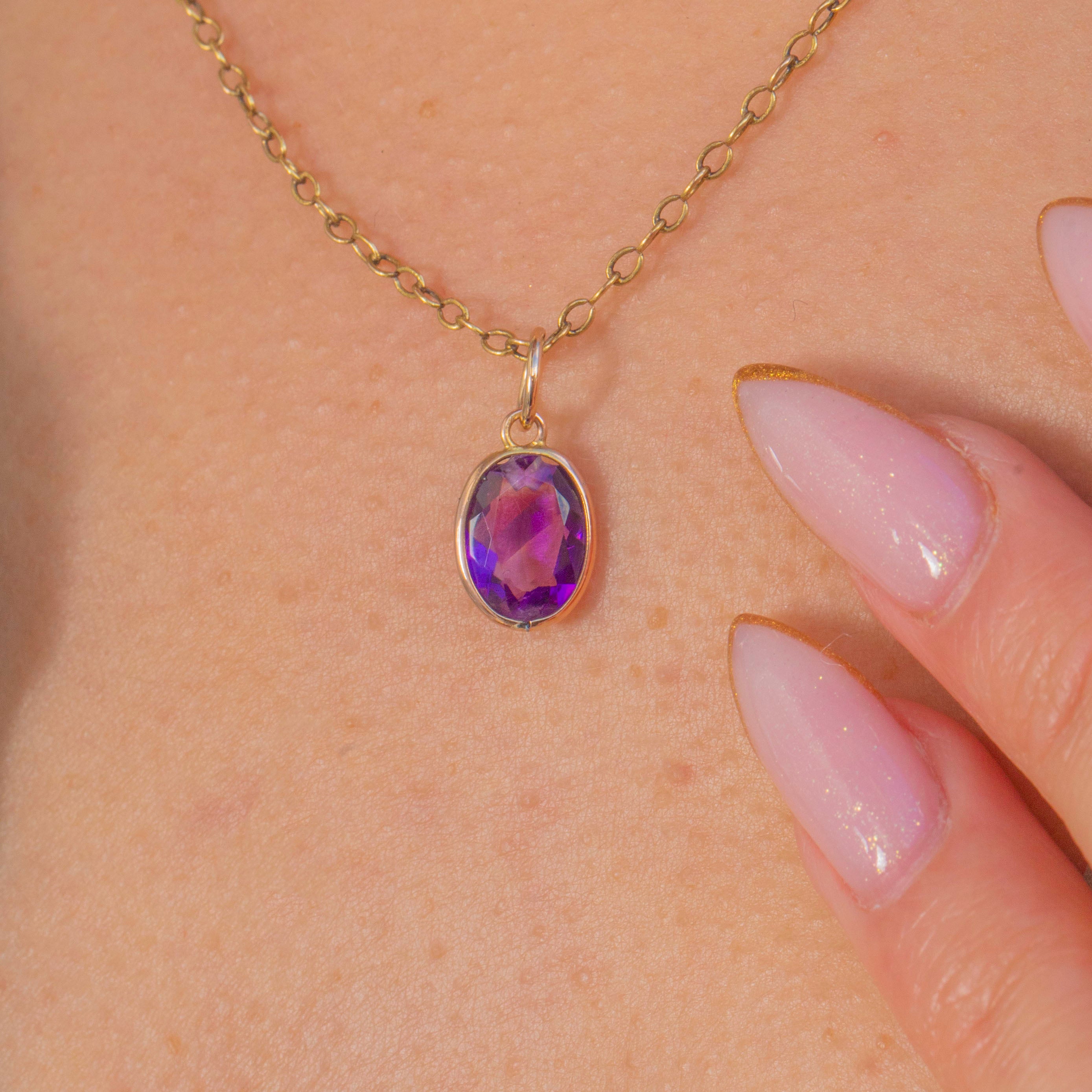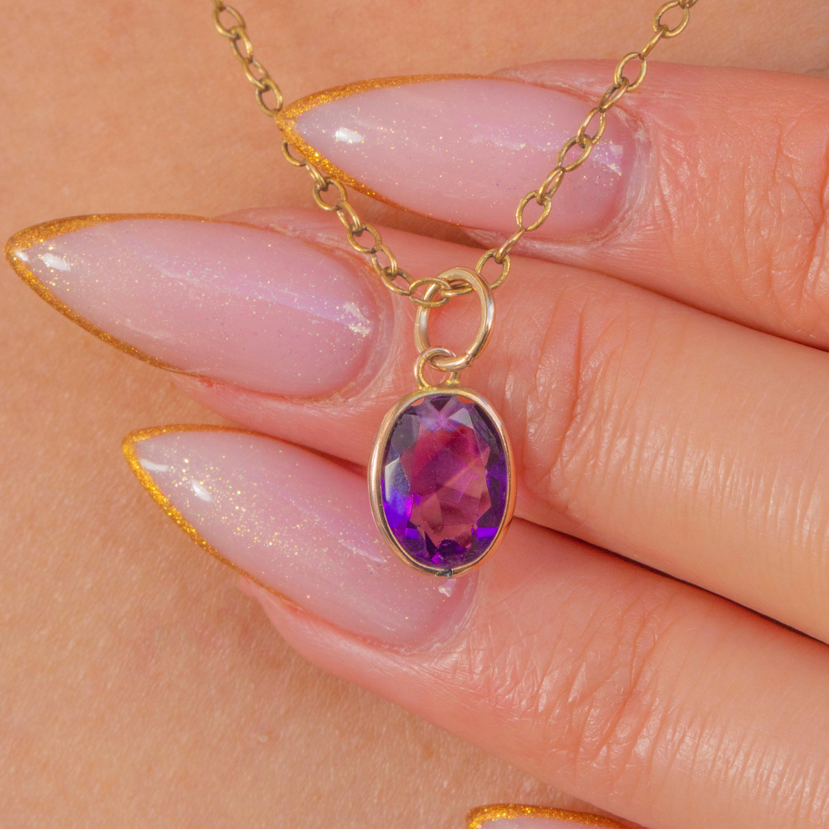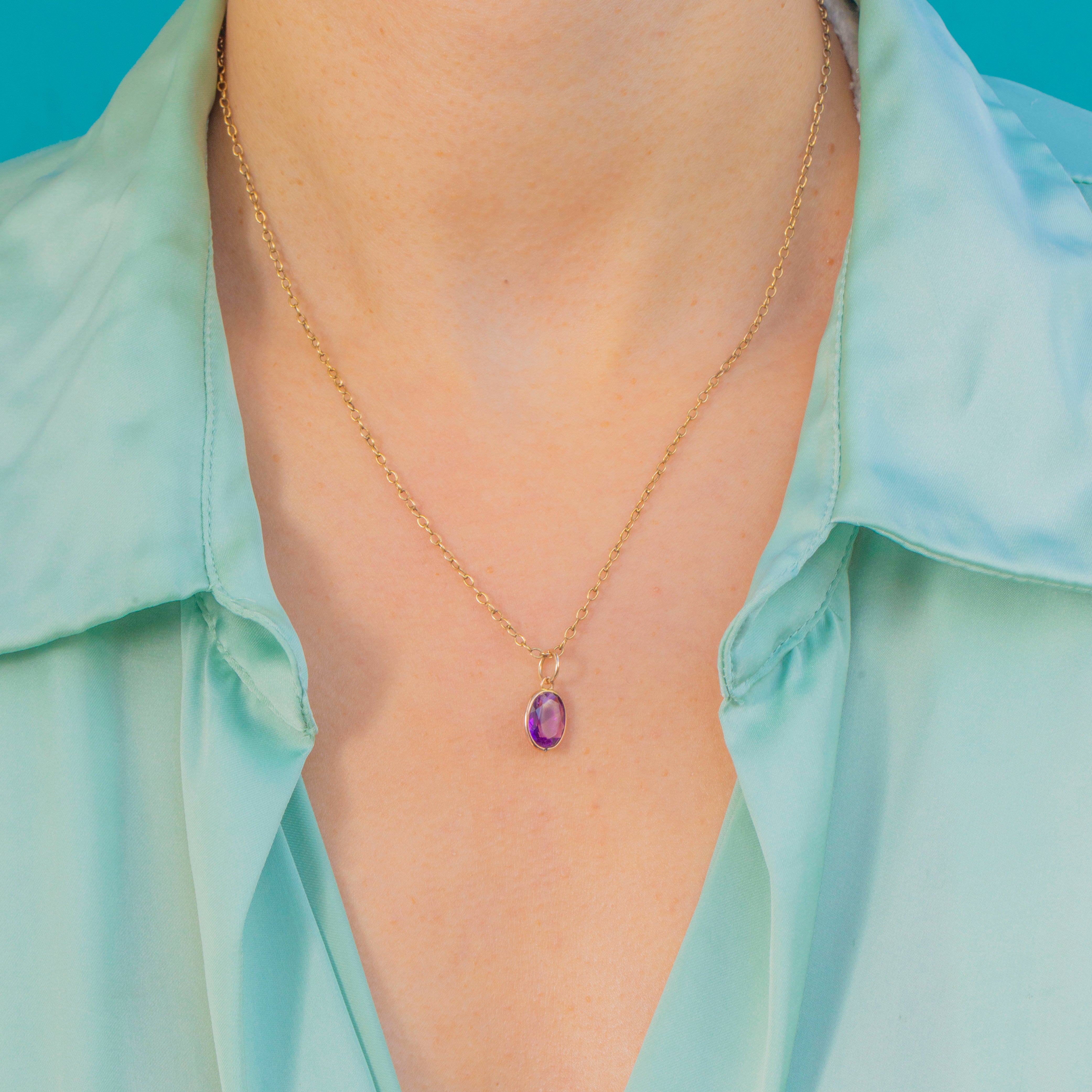 This charming Victorian Amethyst pendant is a beautiful example of how antique stones can be lovingly re-imagined. The oval Amethyst has a soft lilac-purple hue and a bright inner glow, framed in a clean 9ct Gold bezel that gives it a chic, contemporary feel while retaining its antique character.
