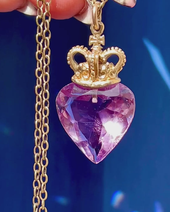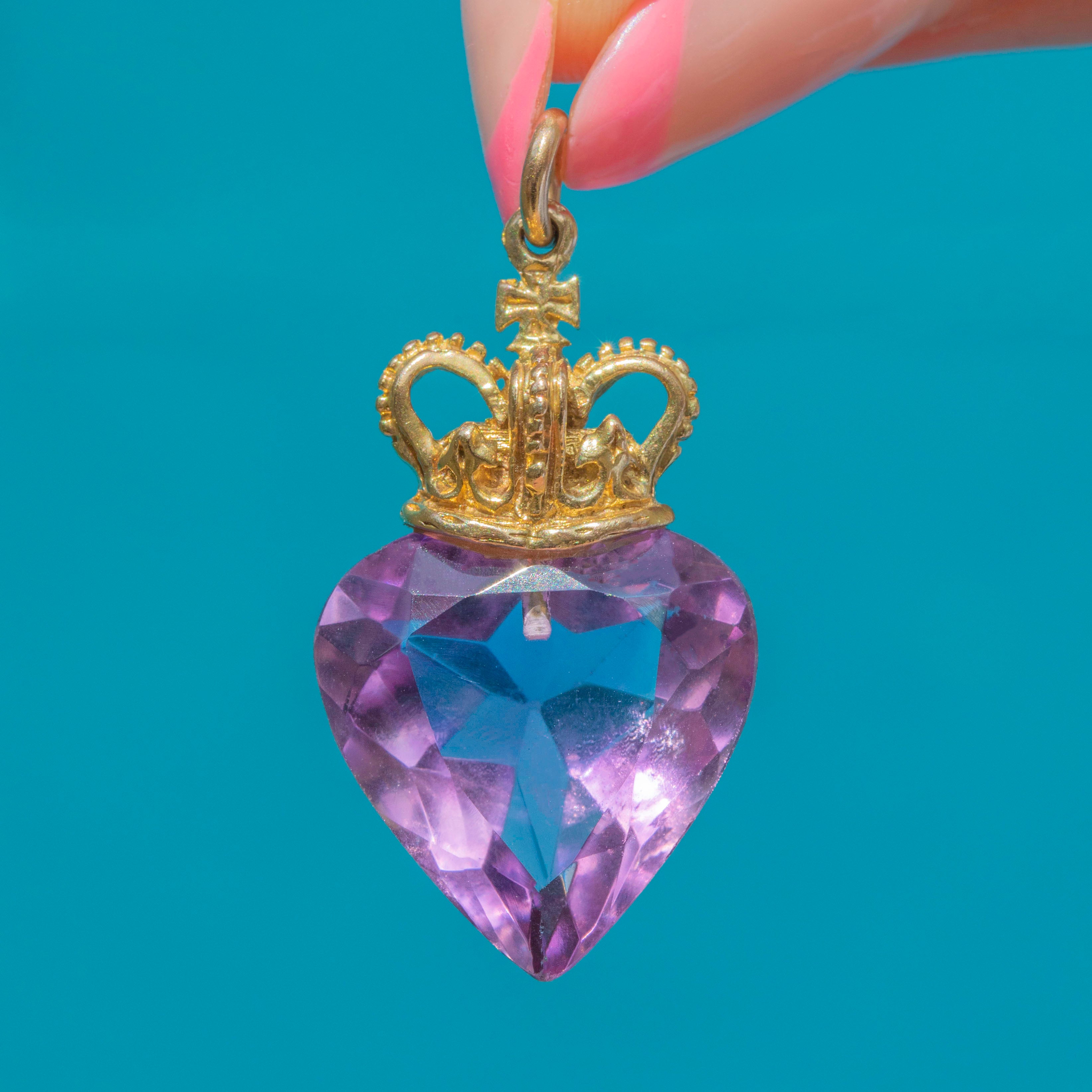 VERY GOOD: This 9ct Gold Amethyst crowned heart pendant is in very good condition. The Amethyst has a gorgeous lilac hue and has a crisp set of facets, with only minor fleabites visible under close inspection. The Gold is buttery and the crown has held its form well, with all details remaining defined. With so much wear potential, this mid-century Amethyst pendant is ready to be shown off!