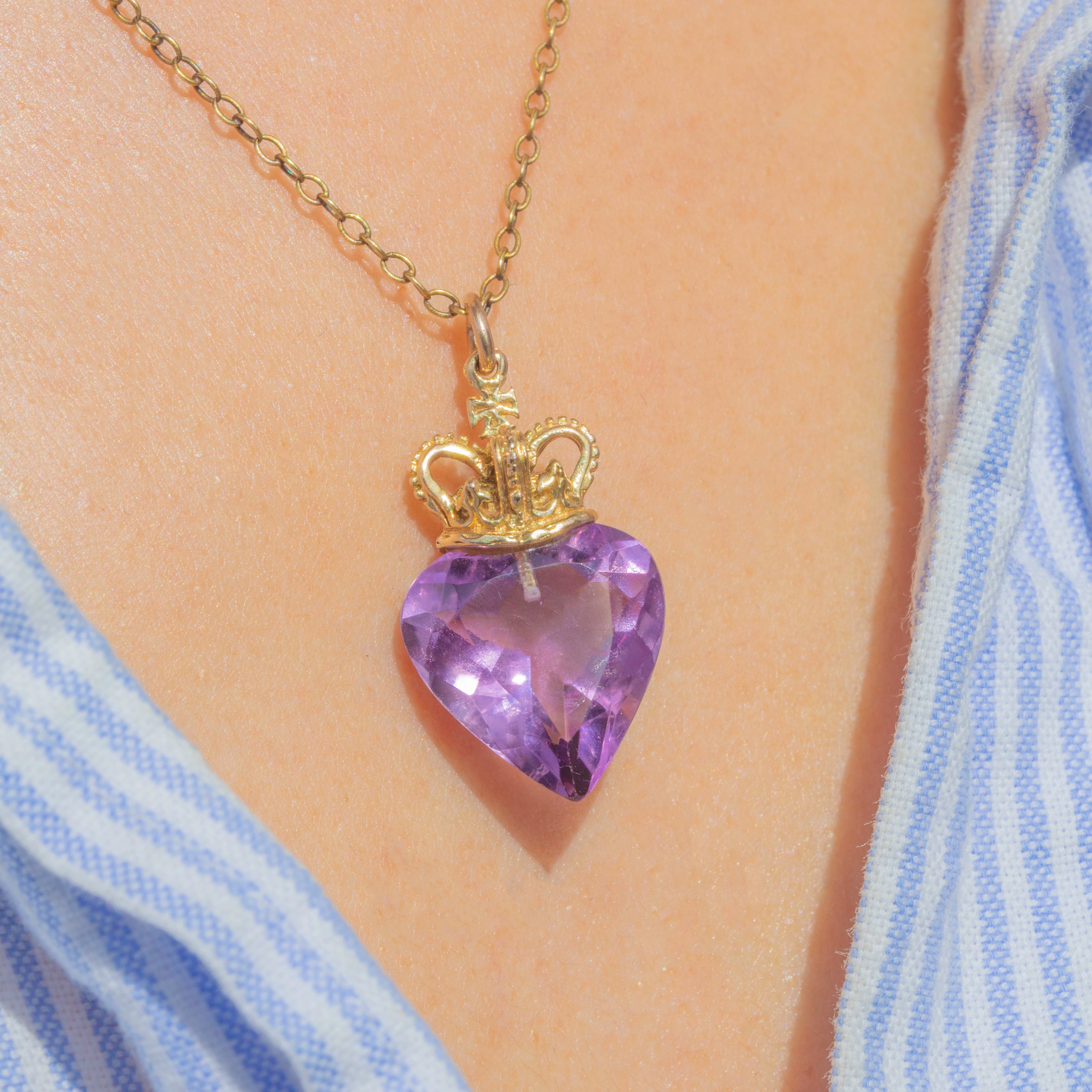 The heart-shaped Amethyst is topped with a lavish and ornately decorated solid Gold crown, giving this mid-century treat an undeniable regal allure. An exquisite addition to any treasure trove, don't hesitate to make this vintage Amethyst heart pendant your newest acquisition!