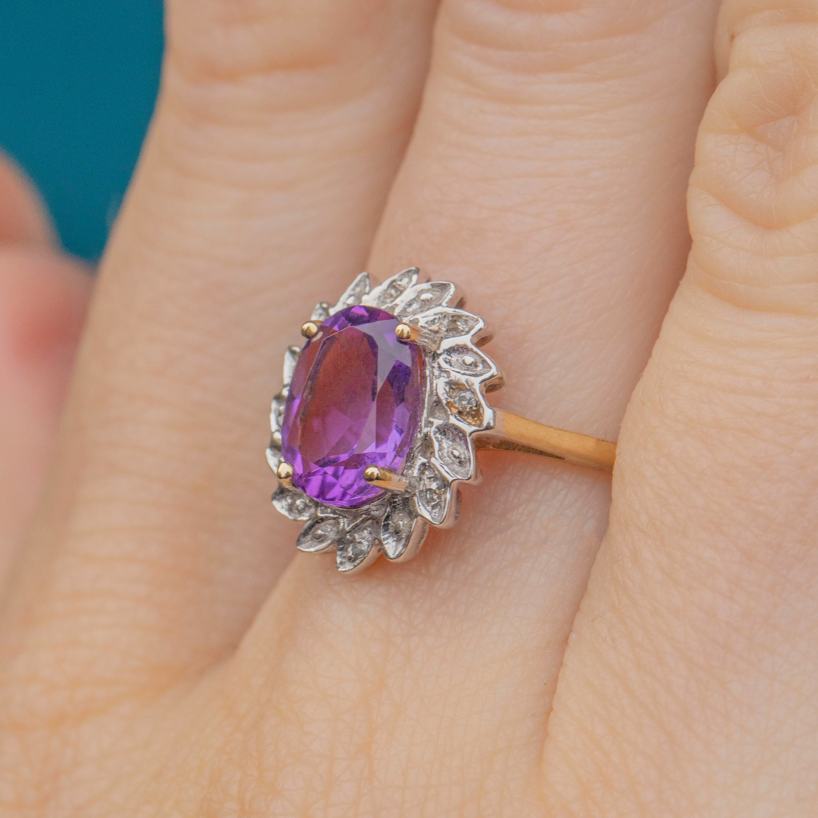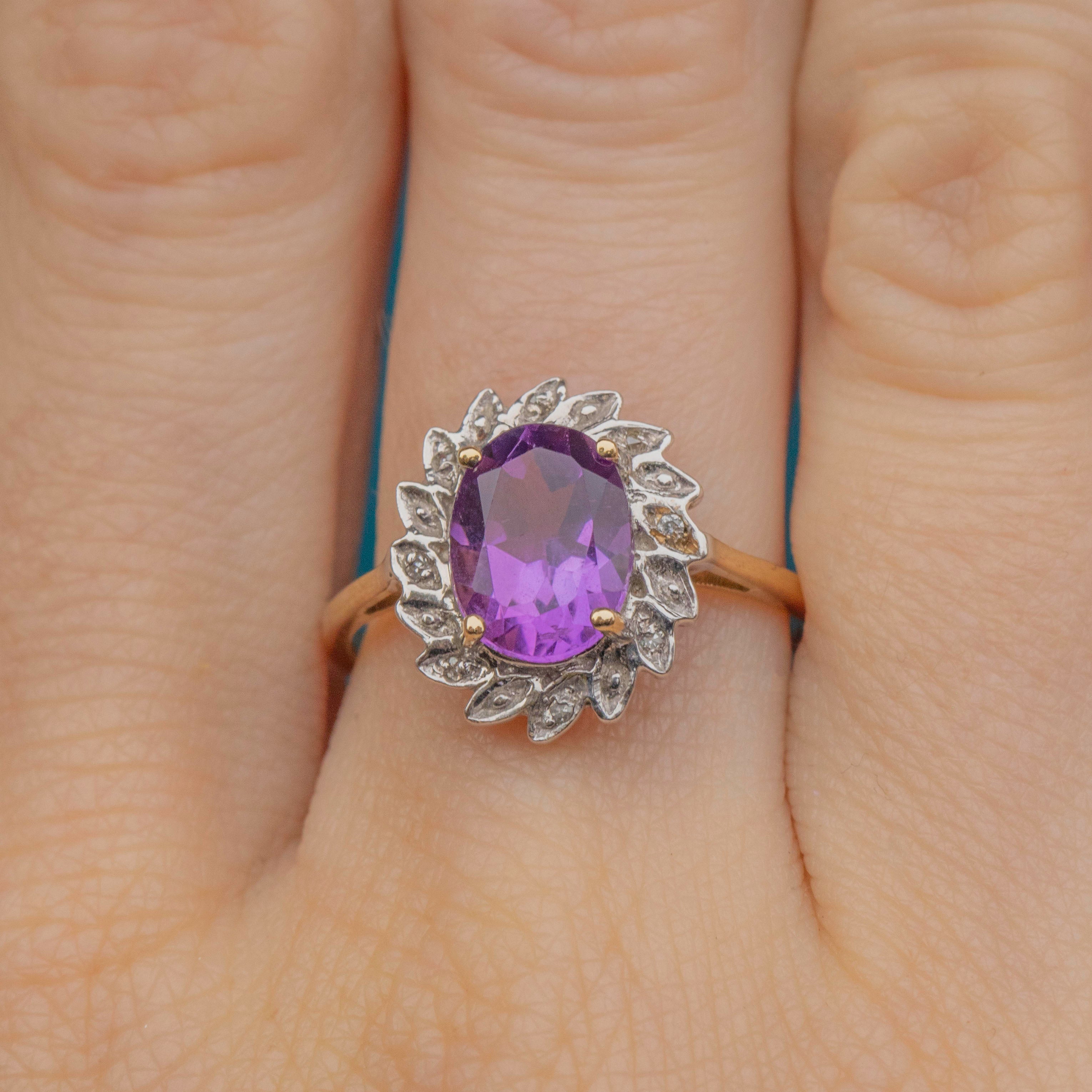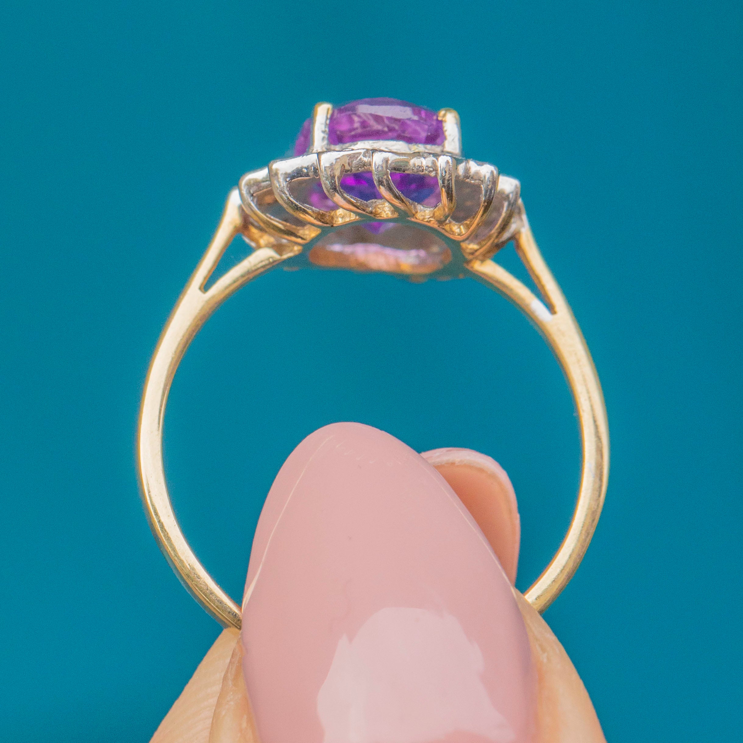 EXCELLENT. This 9ct Gold Amethyst Diamond cluster ring is in excellent condition. The Amethyst is pristine, with no chips, cracks or scratches to note, and is securely set. The dazzling Diamonds are present and securely nuzzled into 14ct White Gold settings. This ring is a true treasure!
