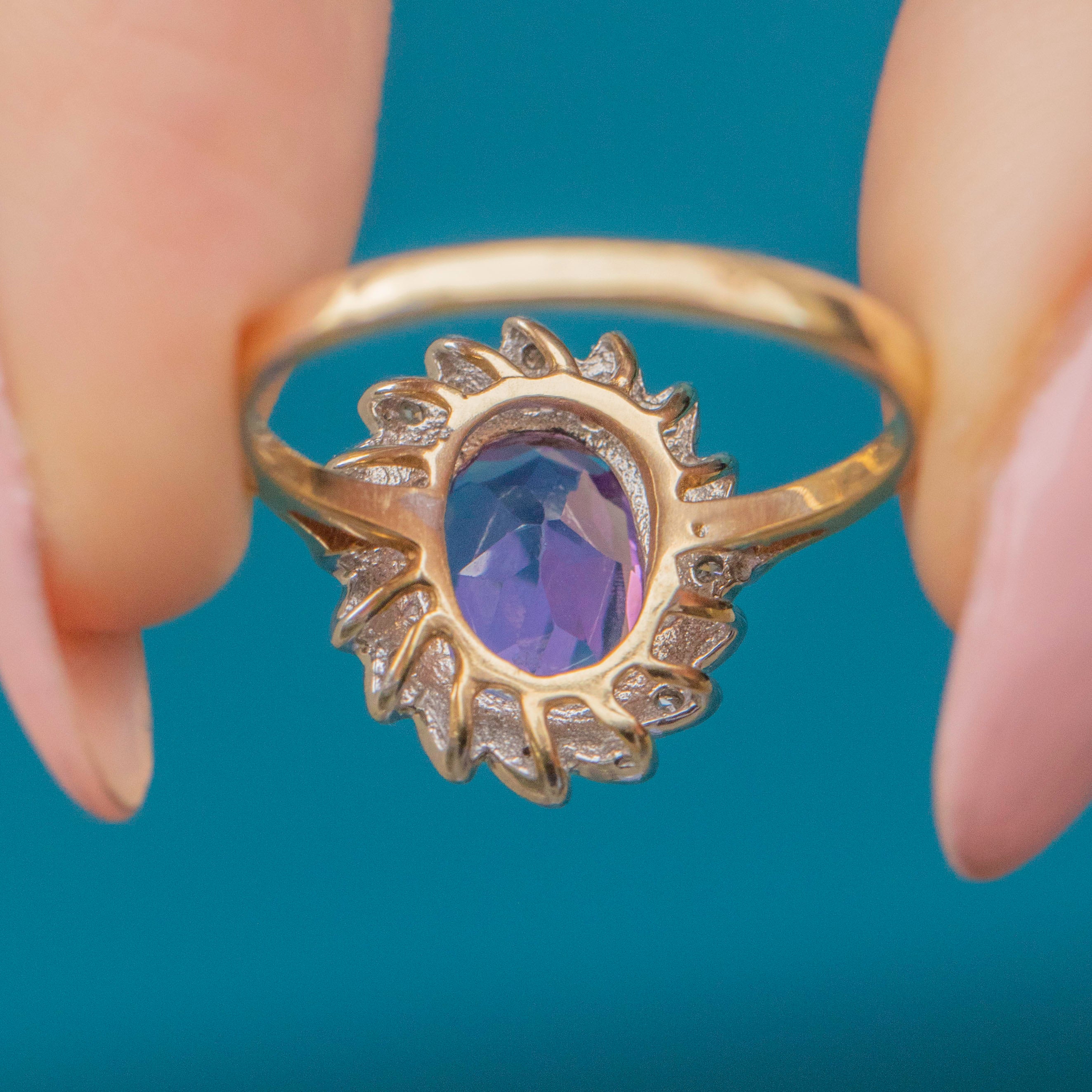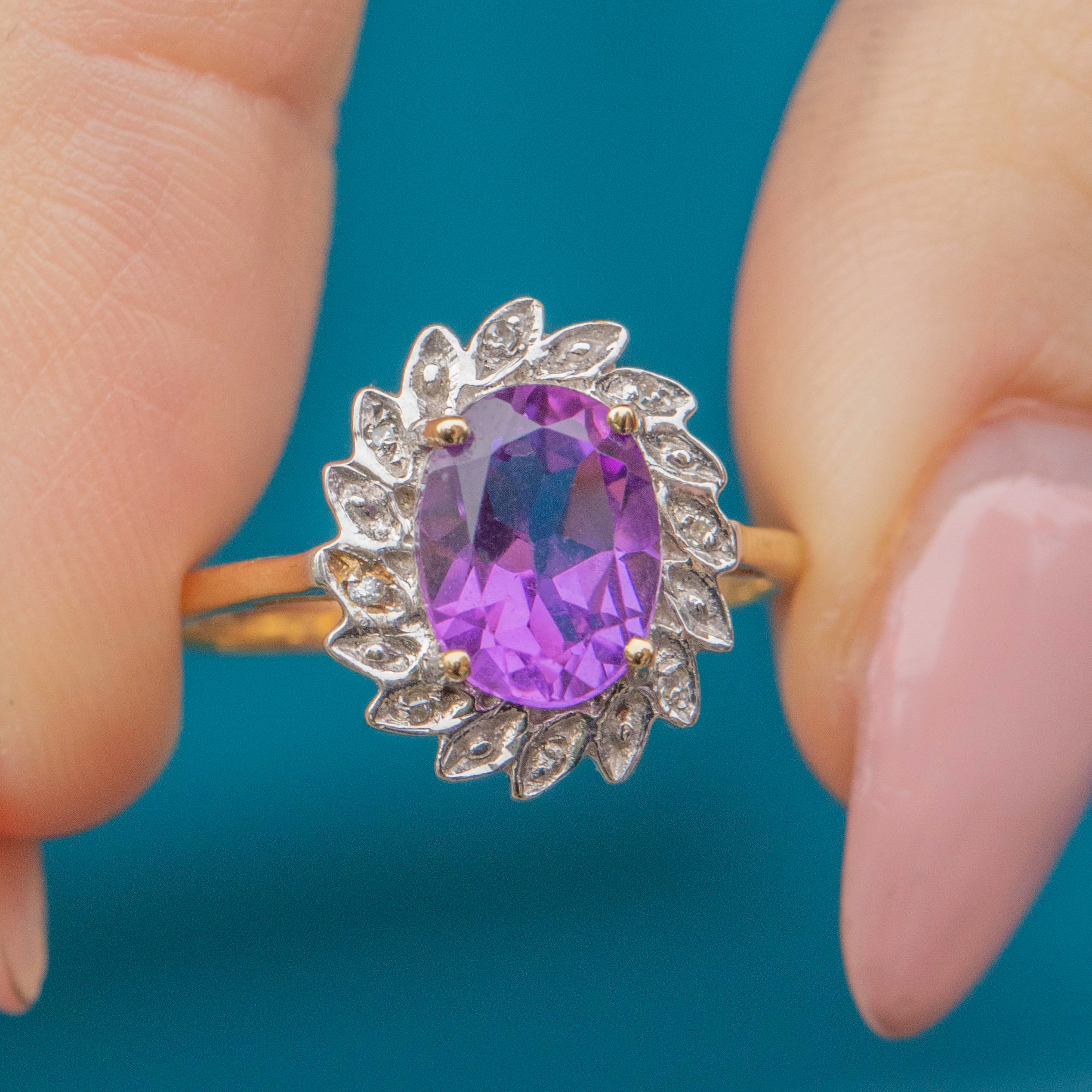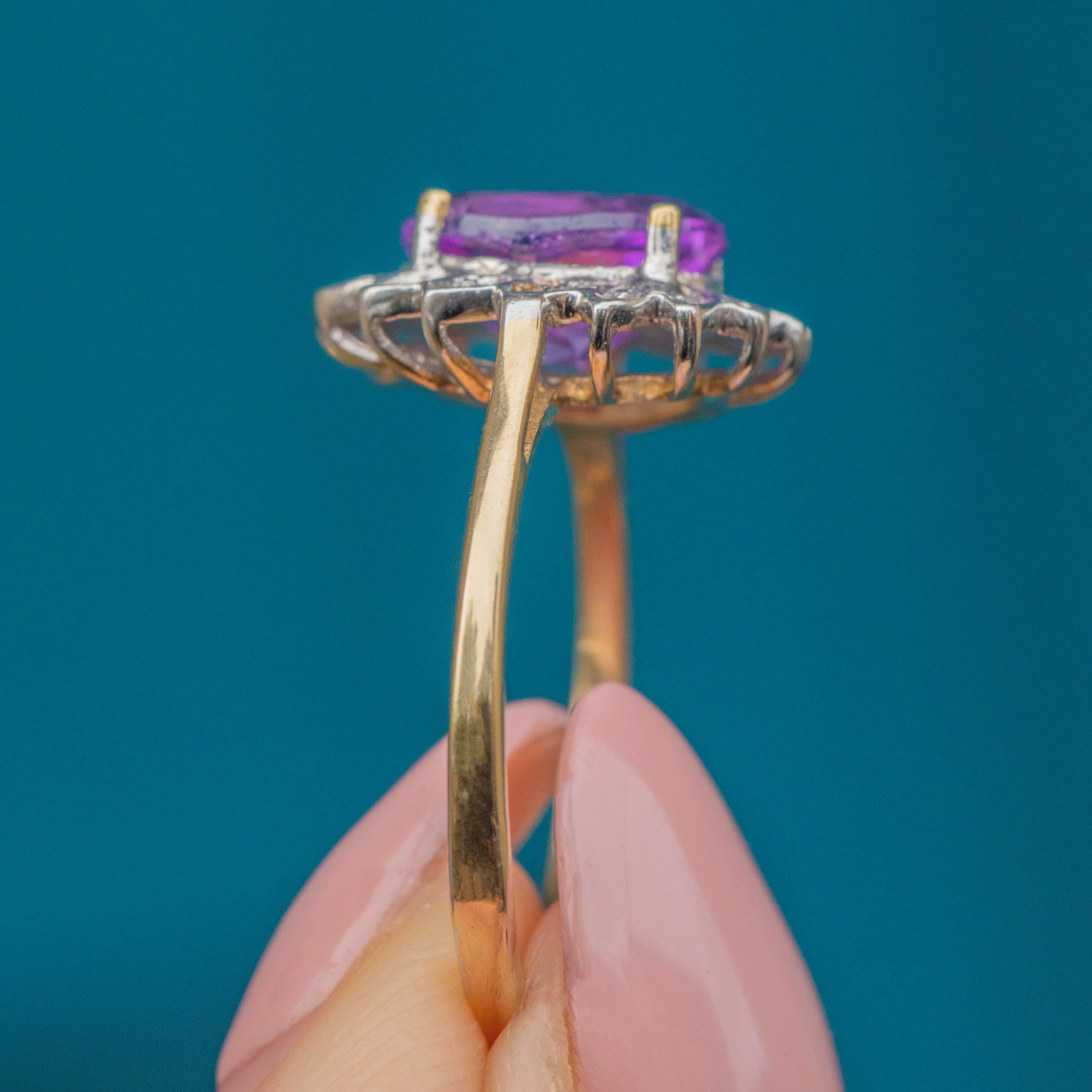 EXCELLENT. This 9ct Gold Amethyst Diamond cluster ring is in excellent condition. The Amethyst is pristine, with no chips, cracks or scratches to note, and is securely set. The dazzling Diamonds are present and securely nuzzled into 14ct White Gold settings. This ring is a true treasure!