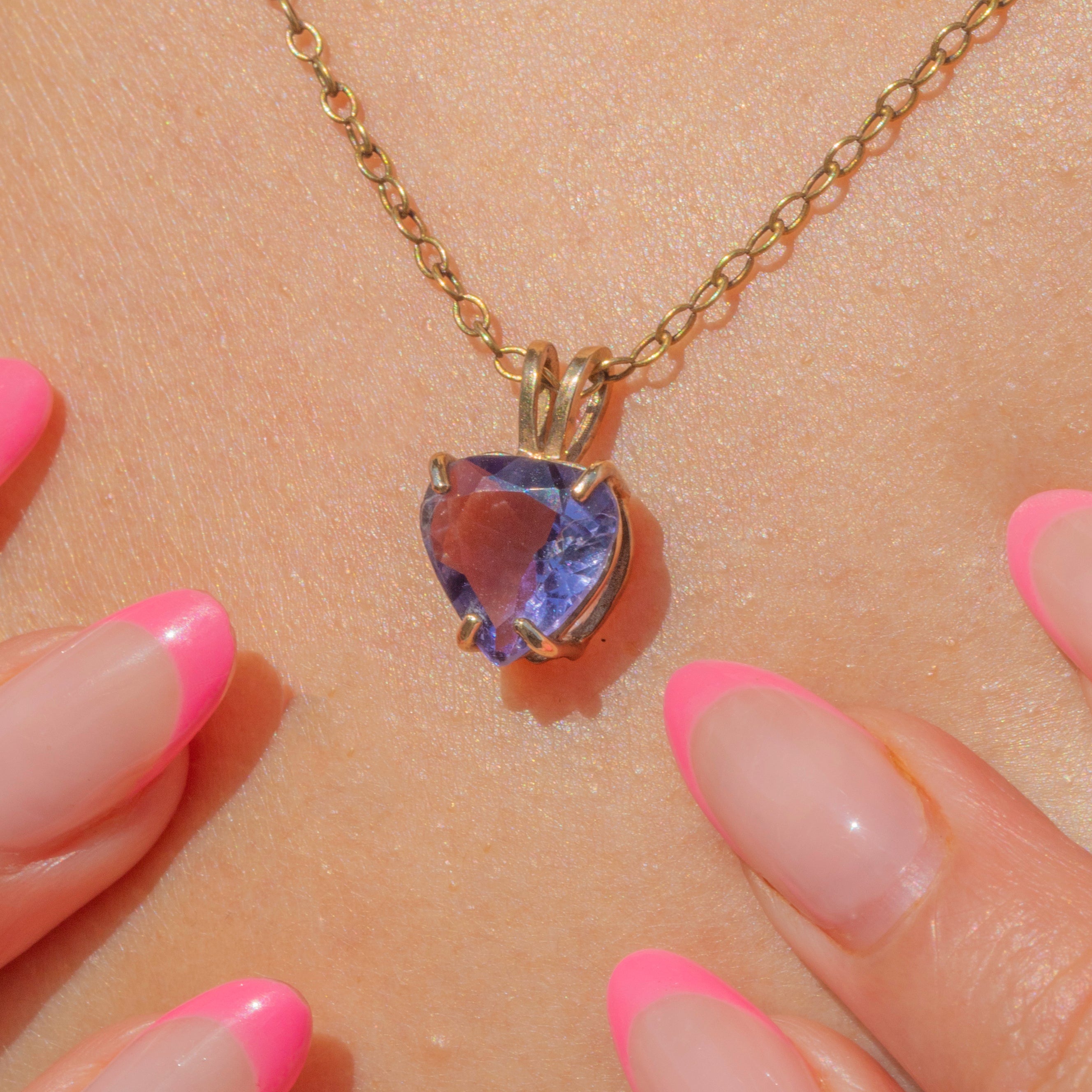 VERY GOOD: This 9ct Gold Amethyst heart charm is in very good condition. Her Amethyst is faceted wonderfully and is securely set. There is a surface crack present, as well as a small fleabite, though this isn't overly noticeable and doesn't impact the integrity of the stone. With a securely soldered bale, you can wear her with utmost confidence!