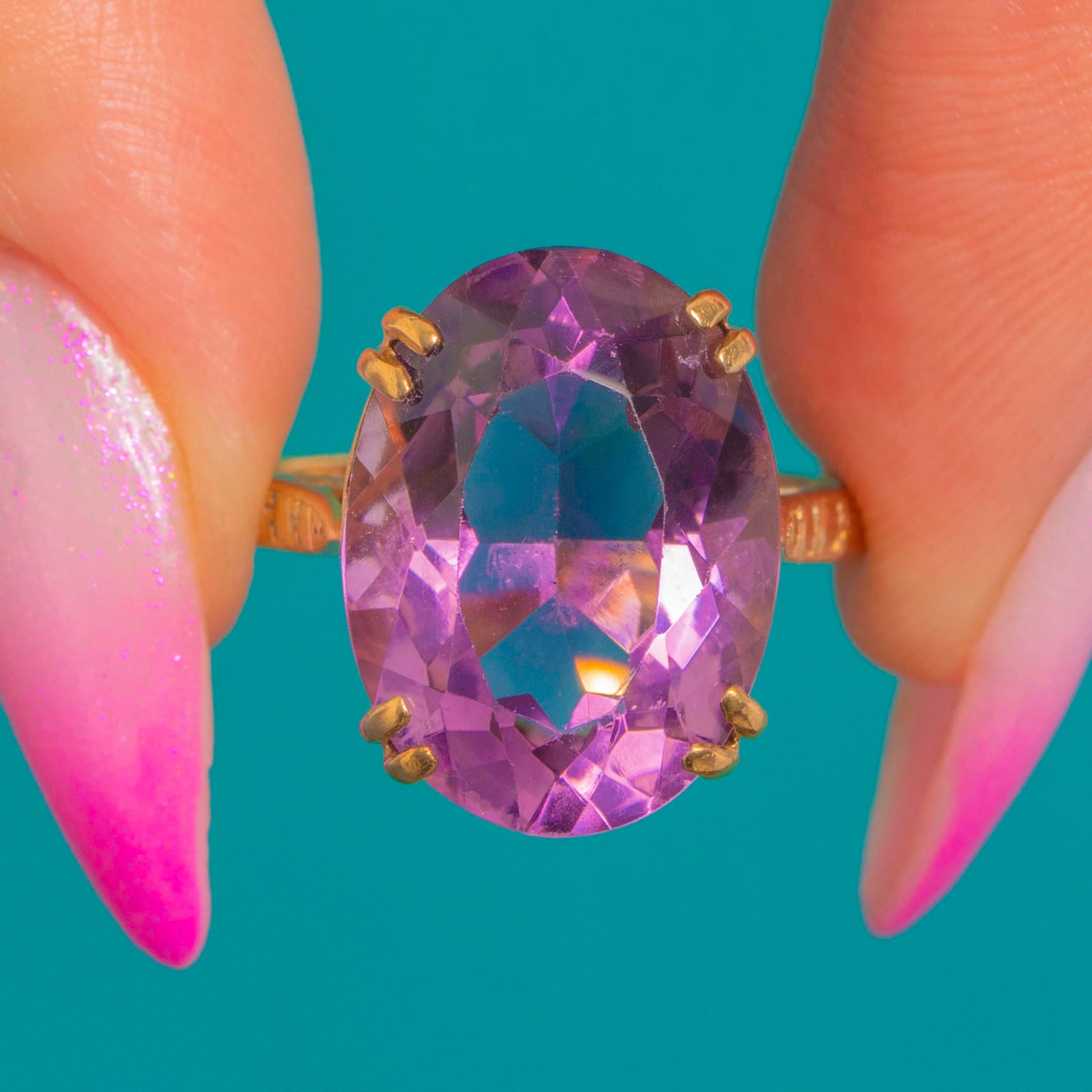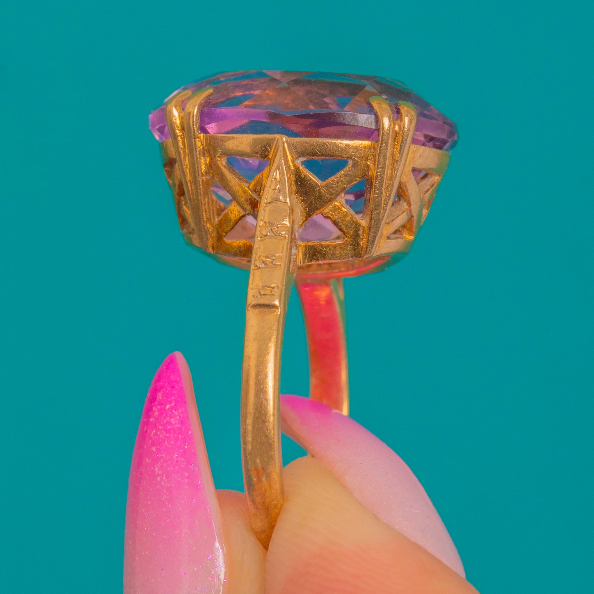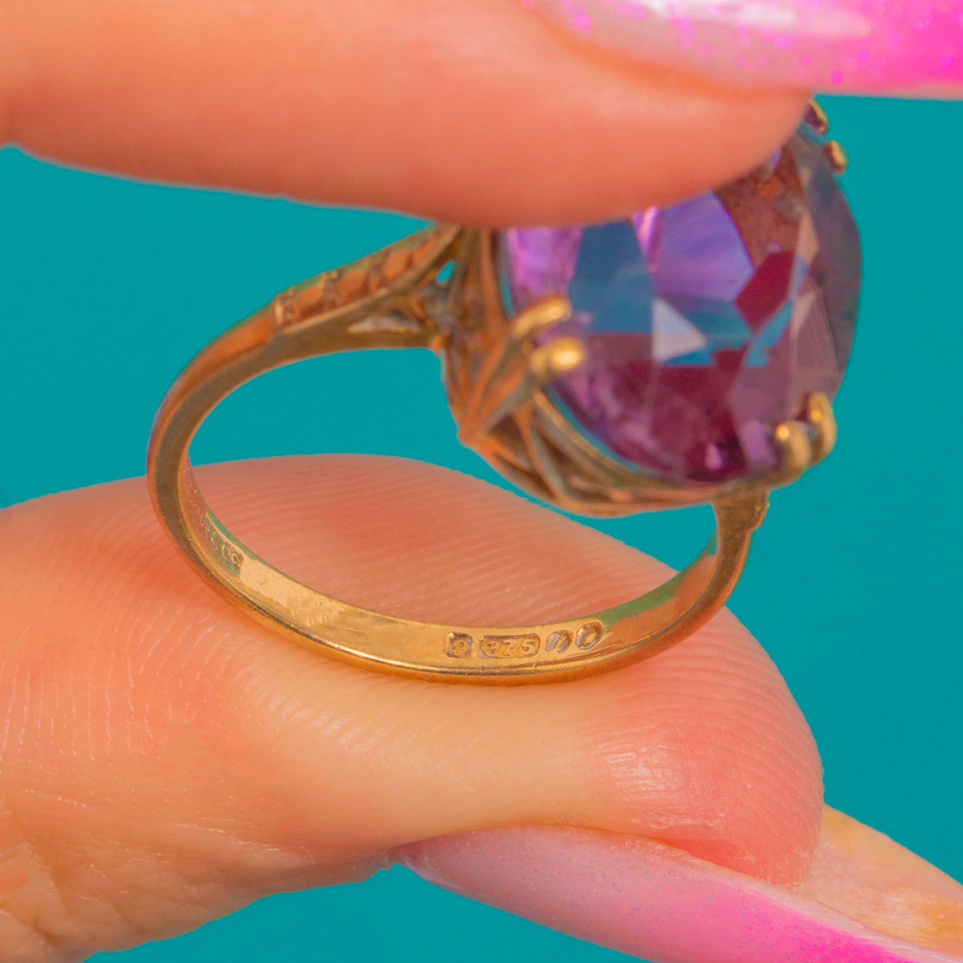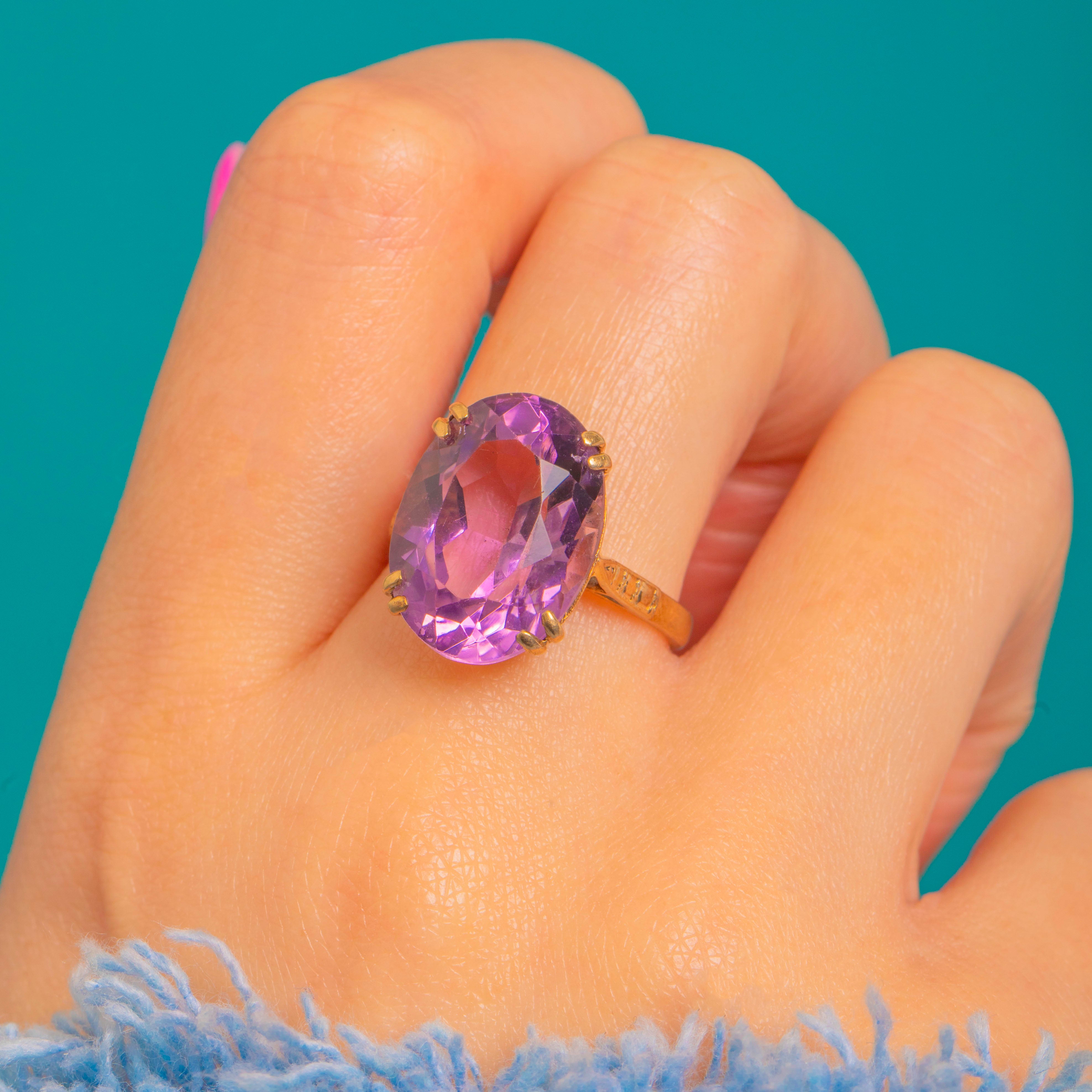 EXCELLENT: The Amethyst presents beautifully with no obvious chips or abrasions, and crisp facet edges showing only light age-consistent wear under magnification. The 9ct Gold setting, openwork gallery and prongs are secure with minor surface marks and a soft patina in recessed areas. The shank remains in good shape with no visible repairs or evidence of recent resizing.