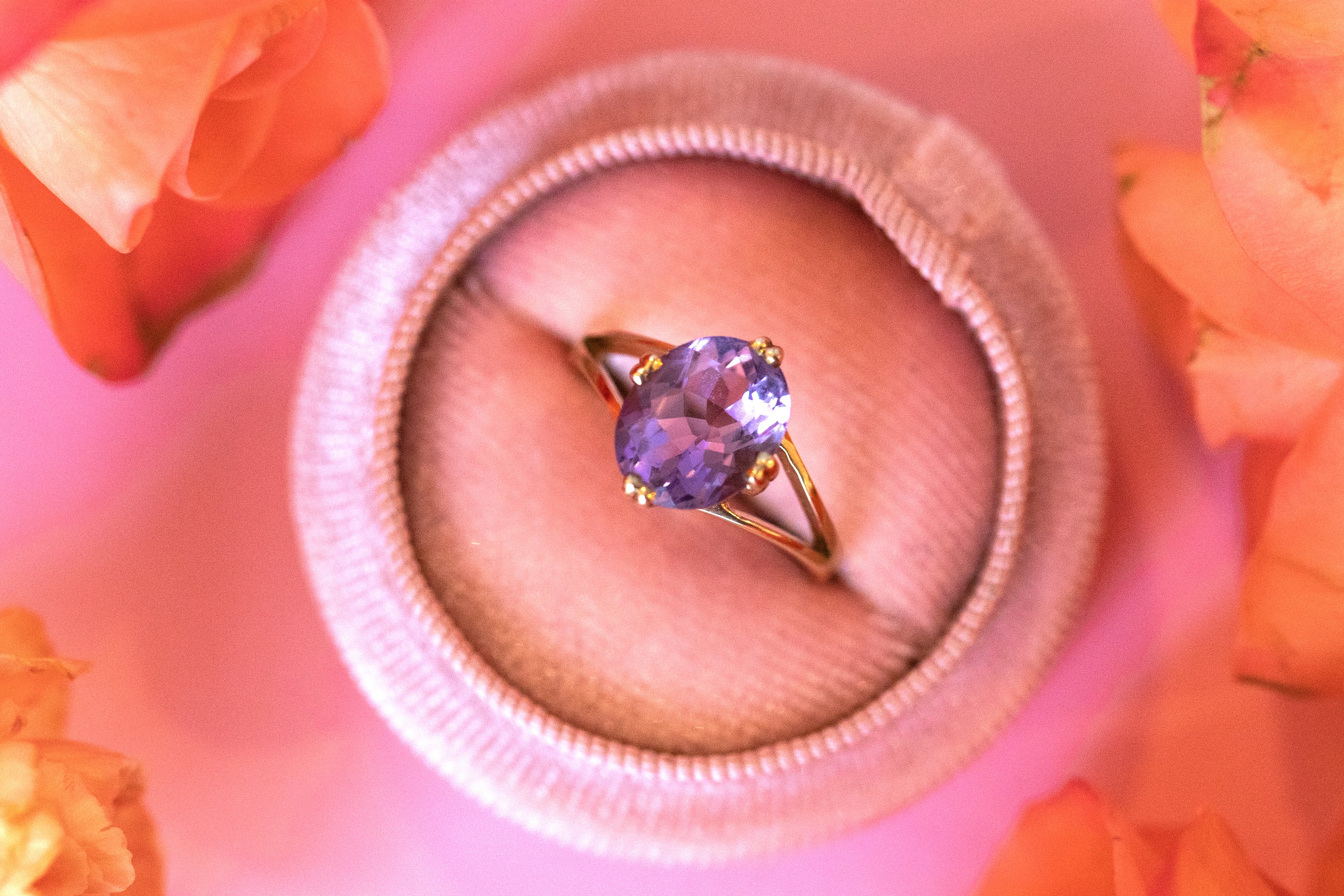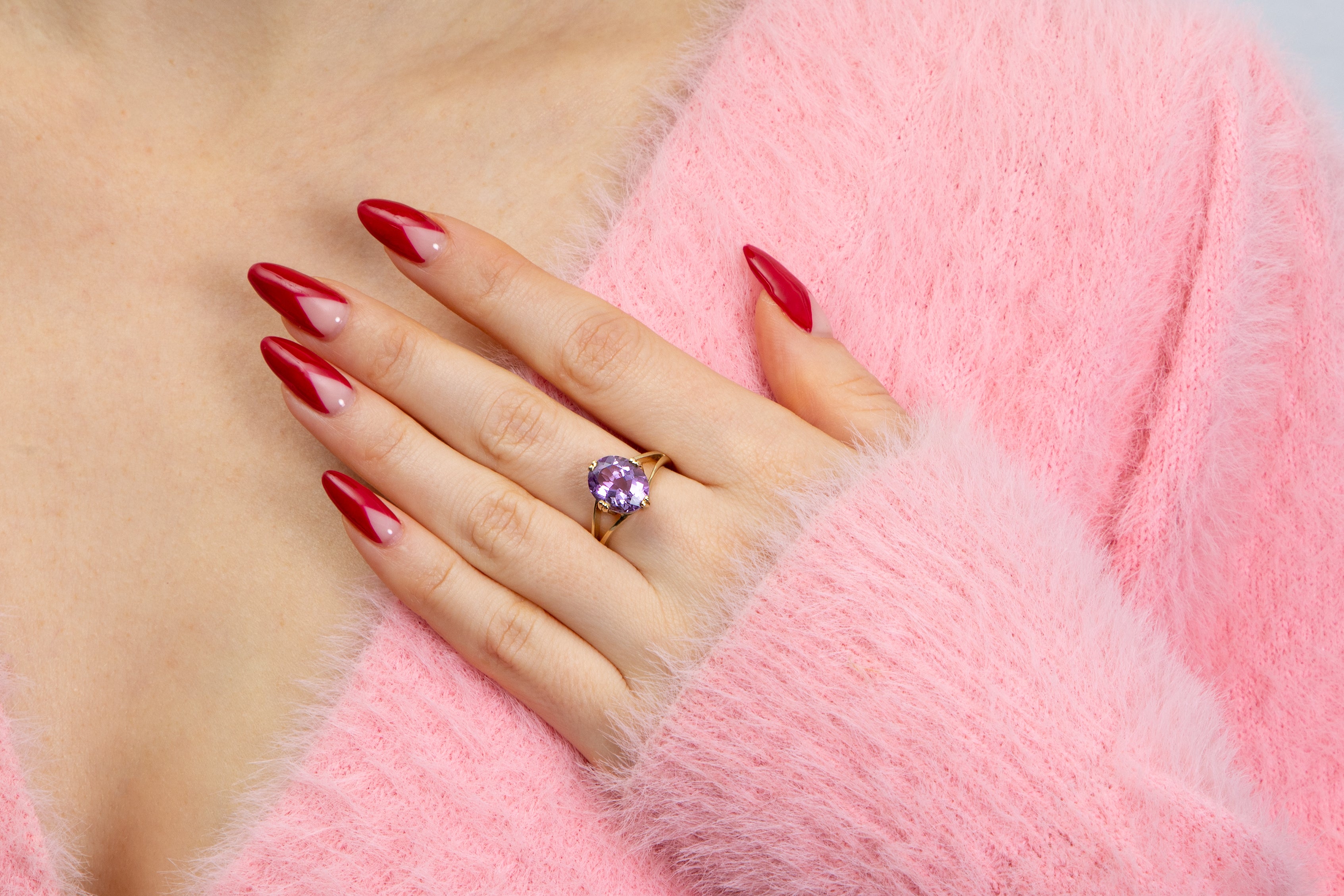 This 9ct Gold Amethyst oval solitaire ring is the sweetest treasure. Her Amethyst possesses a heliotrope hue of gentle lavender and electric lilacs. Light dances across the face of the Amethyst, like ballerinas taking the stage, and leaves us dazzled.