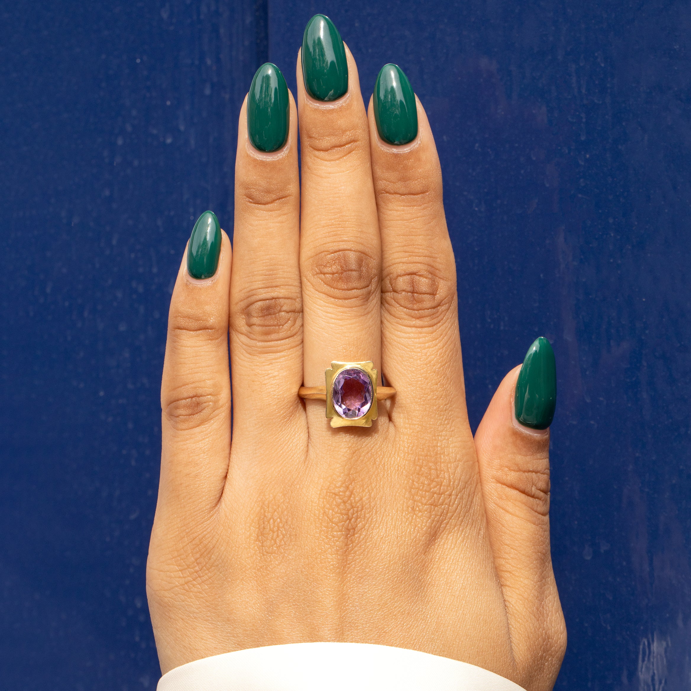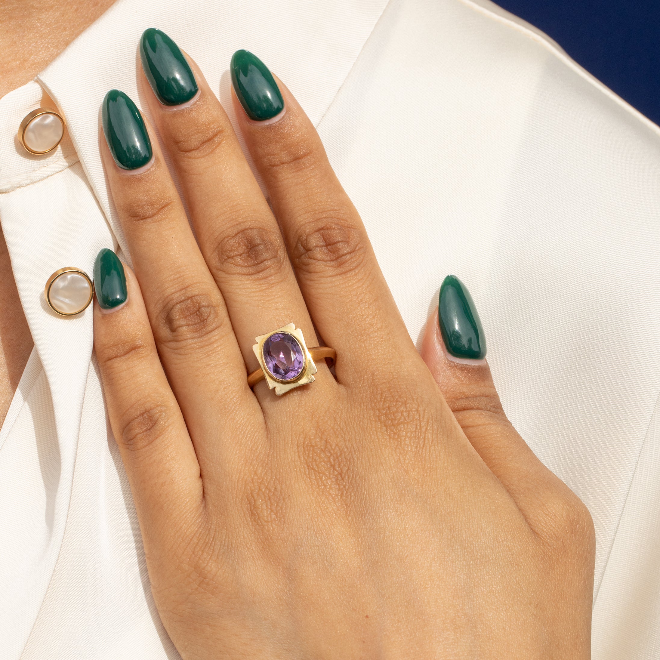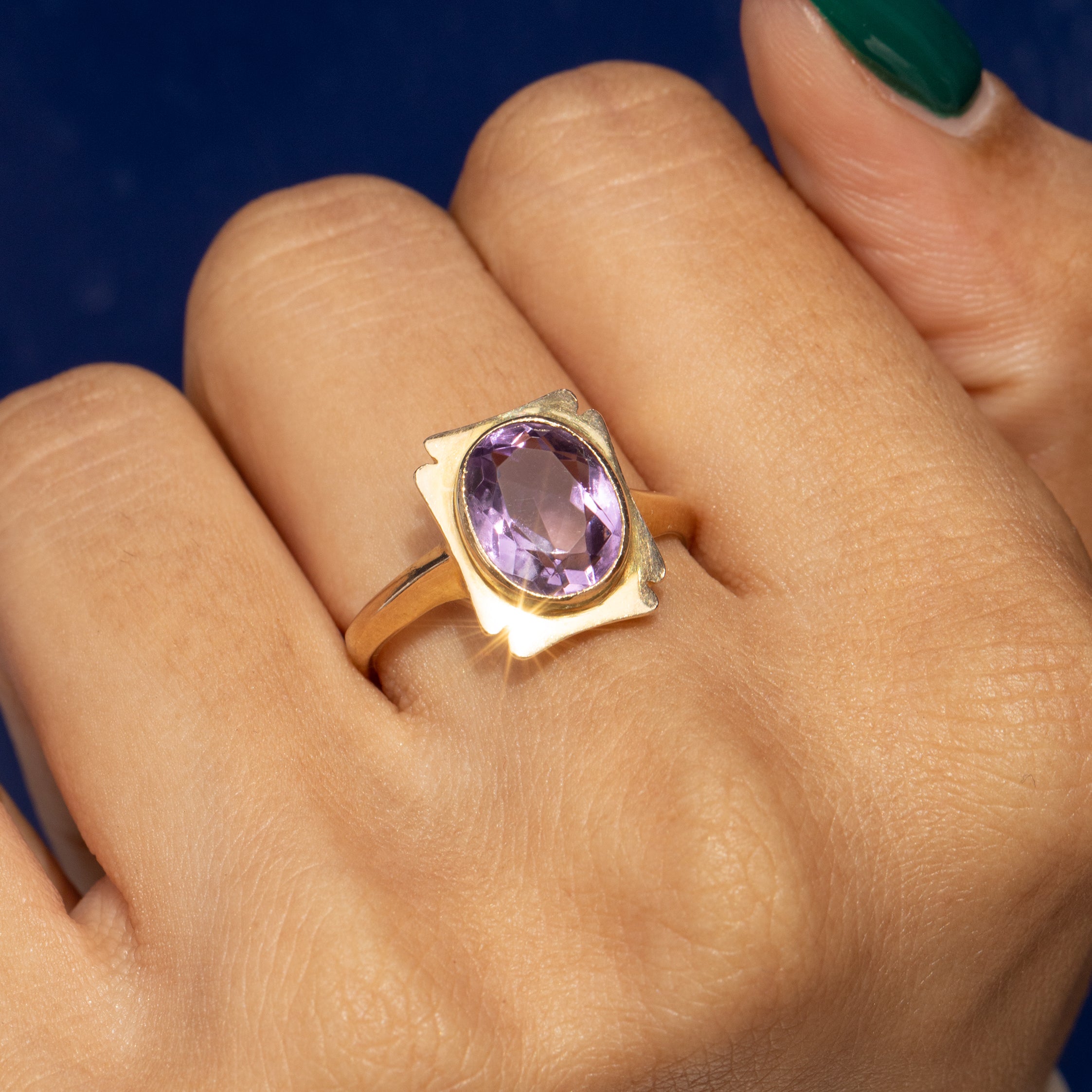 The curvaceous form of the faceted Amethyst marries perfectly with the soft rectangular form of the ring face. Crafted entirely from honey-hued 9ct Gold with wonderful finger coverage, she makes the perfect stand alone piece. You won't be able to help but smile every time you peer down at her!