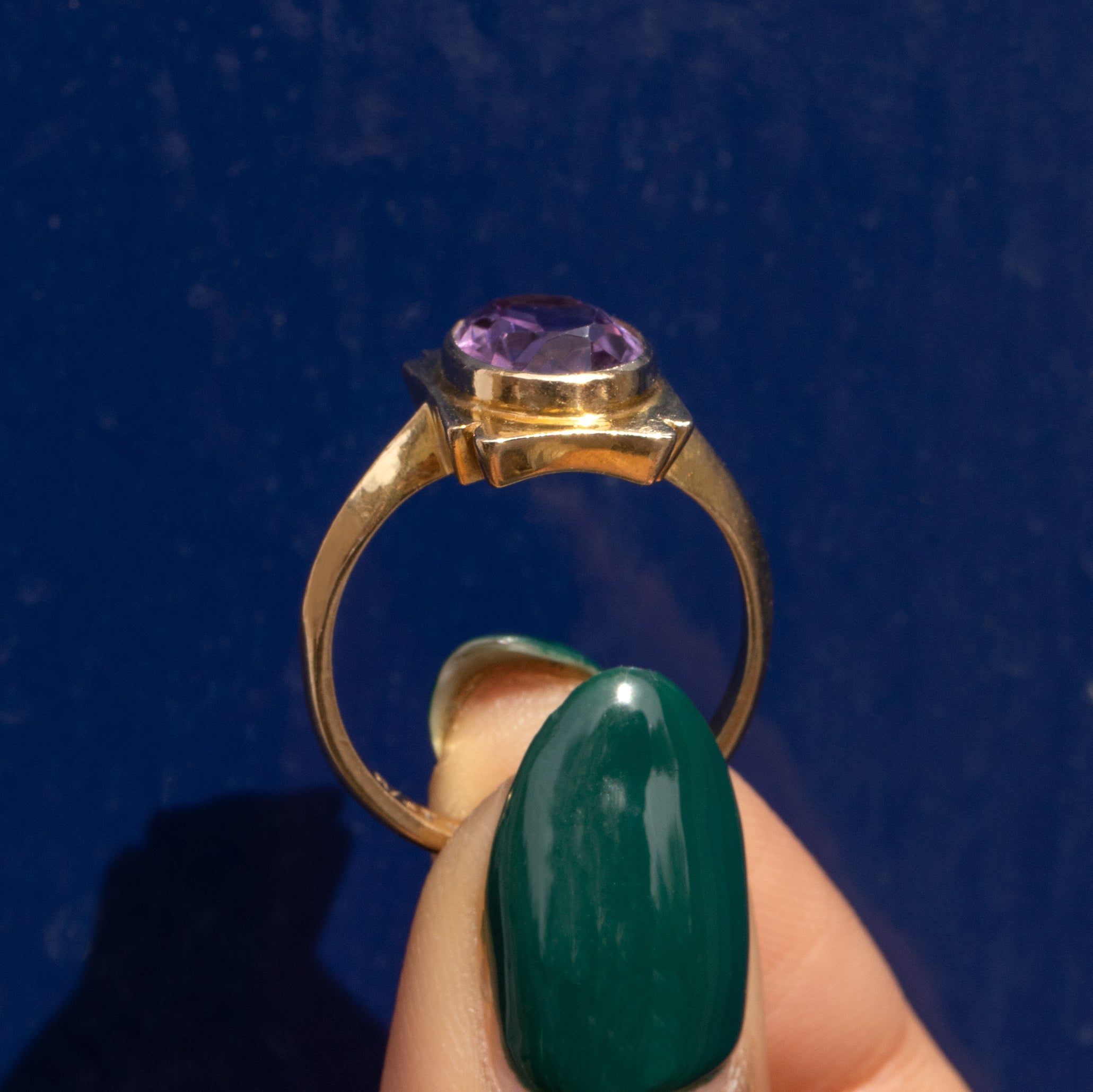 EXCELLENT. This 9ct Gold Amethyst ring is in excellent condition! The Amethyst is secure within its bezel, the 9ct Gold is rich in saturation with no dings or dents to note. The band is robust and comes complete with a full set of hallmarks allowing us to accurately date this piece to 1991!