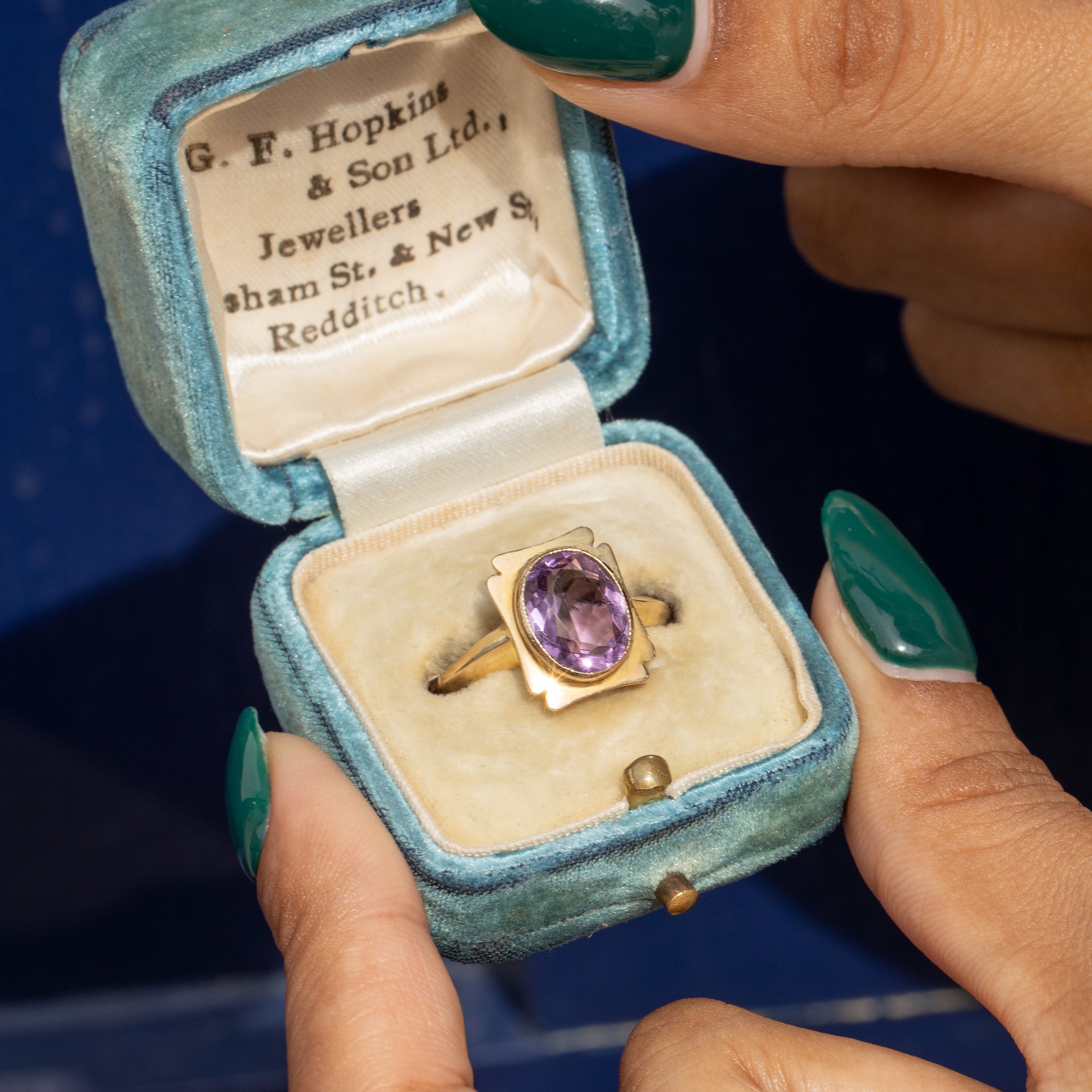 This 9ct Gold Amethyst ring is an absolute delight! A 1.40ct Amethyst sits centre stage with glistens of periwinkle emanating from her lilac core.