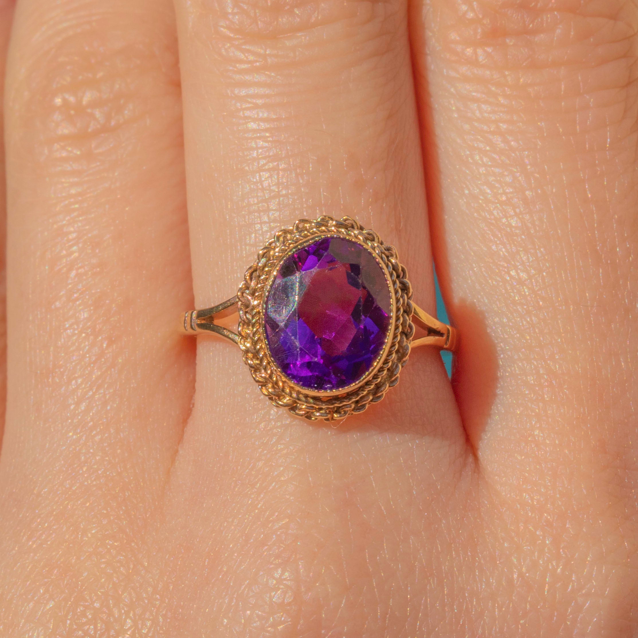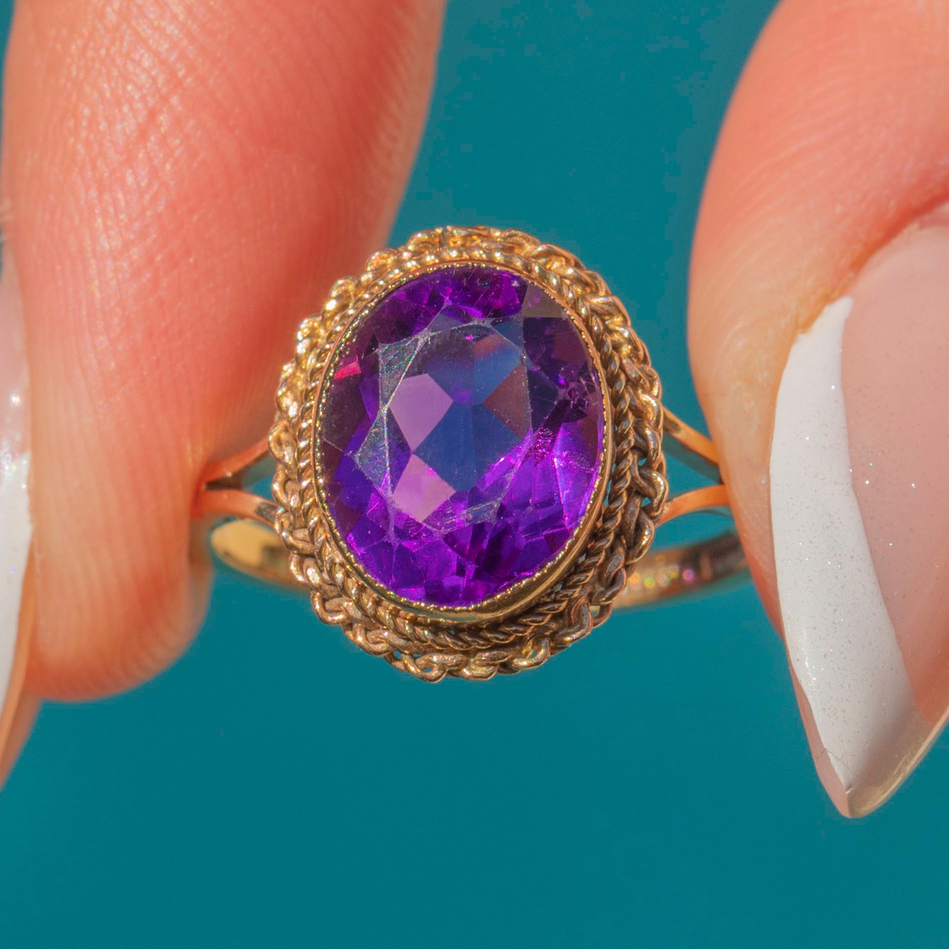 Sophisticated and timeless, her ring face boasts a gorgeously high profile, complete with a twisted rope border. This vintage Amethyst ring would make a divine gift for a friend or the perfect treat for yourself!
