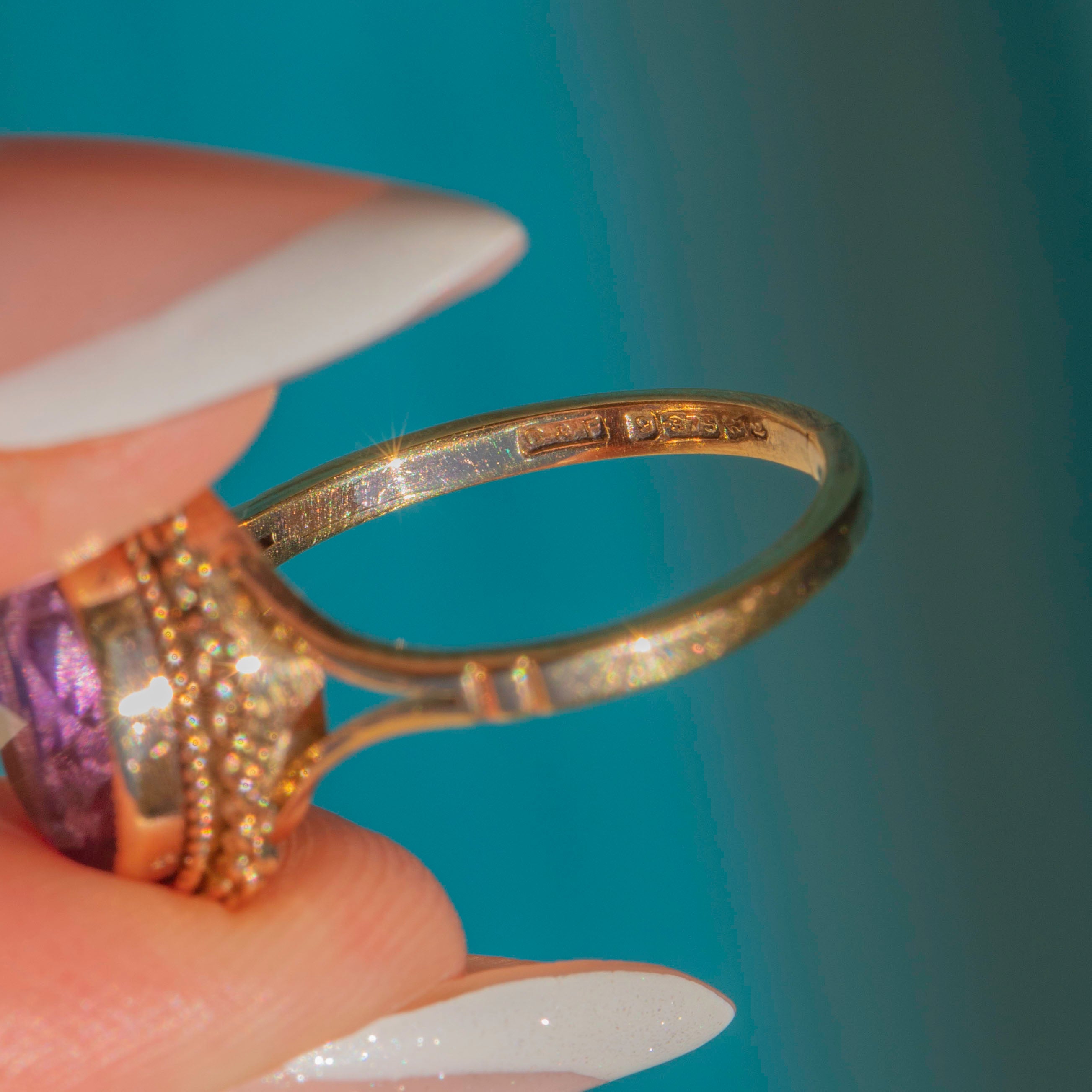 VERY Goo: This 9ct Gold Amethyst Ring is in very good condition throughout. Her faceted Amethyst is free from any damage to note and securely held within her bezel setting. The Gold is brightly saturated, the details have remained crisp, and the band has retained its form well over the years, and although she does have a very visible resize mark at her back, she is secure and steady allowing for reliable wear. Once on, you'll never want to take her off!