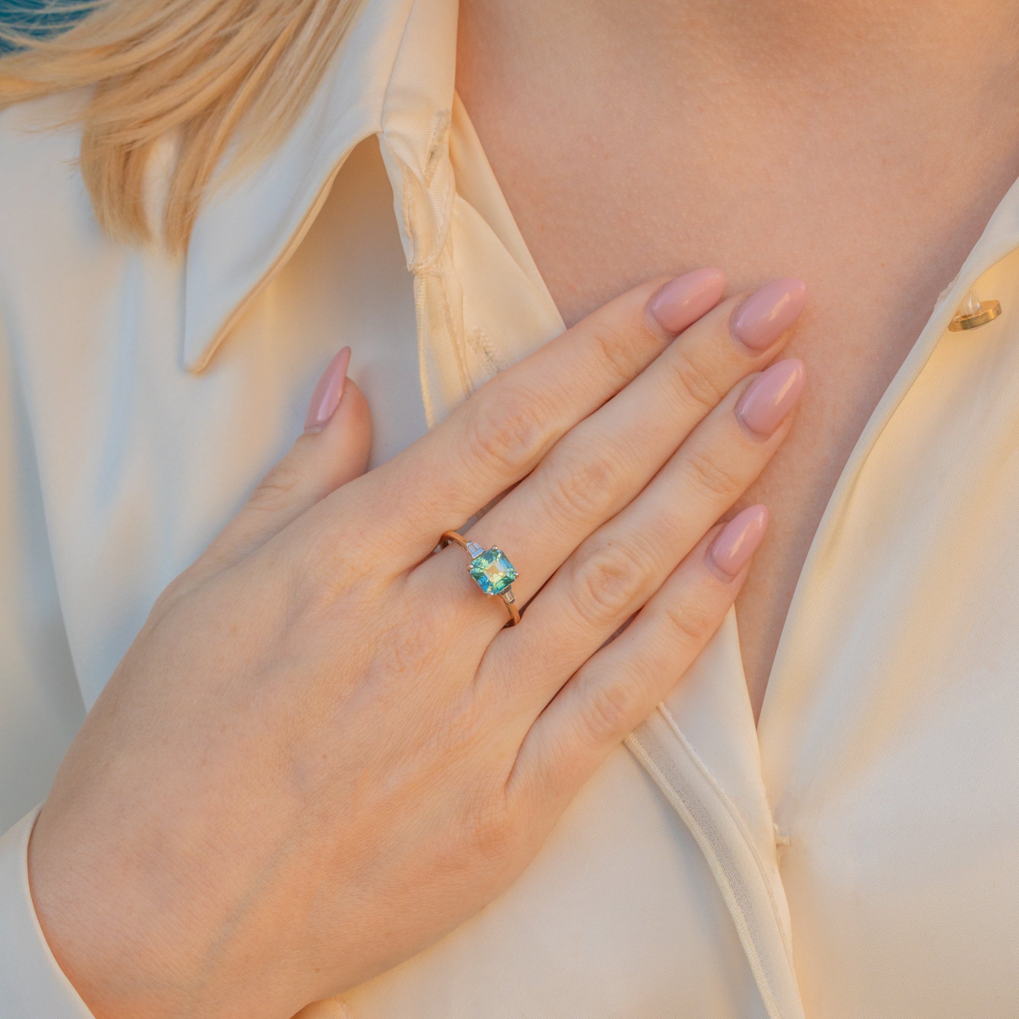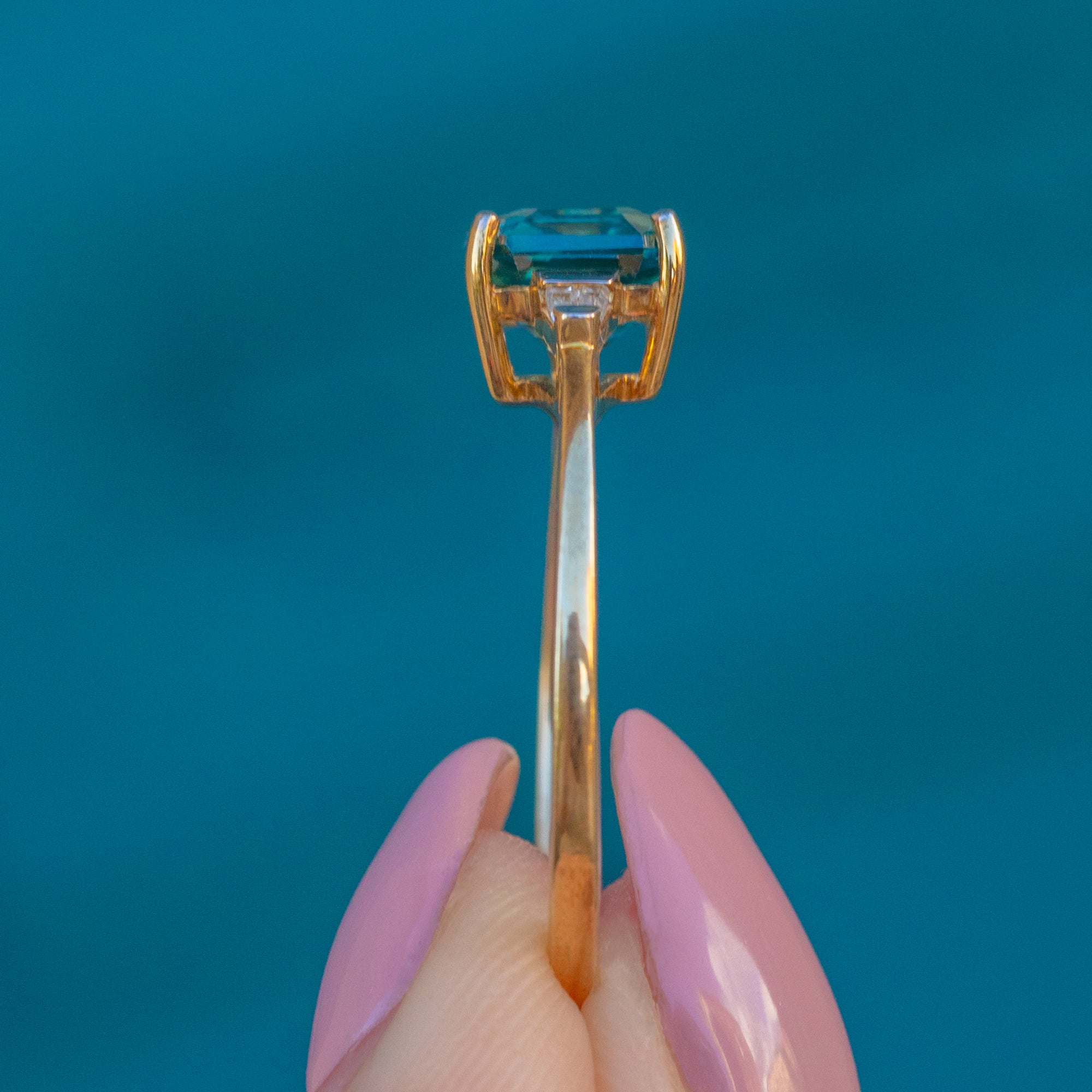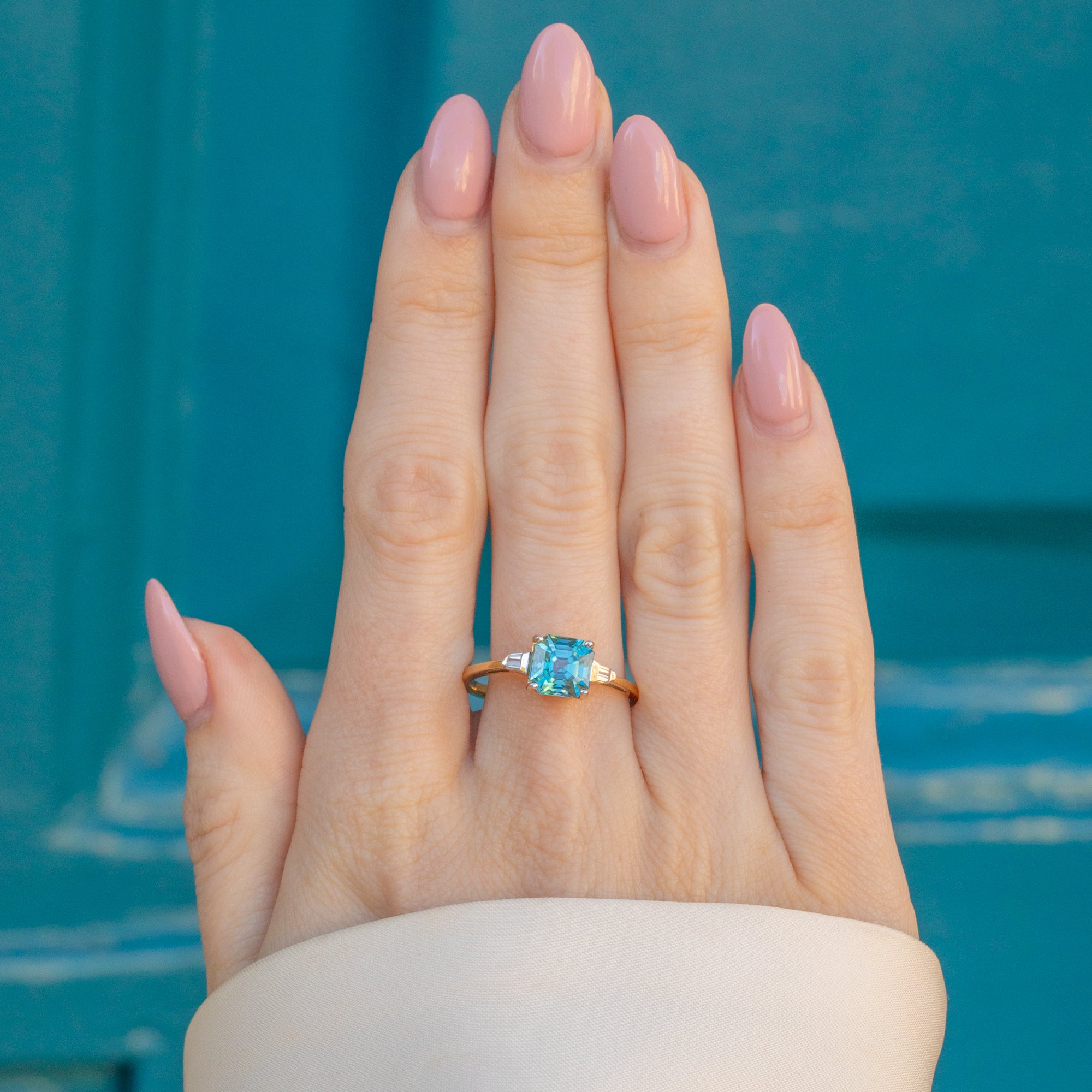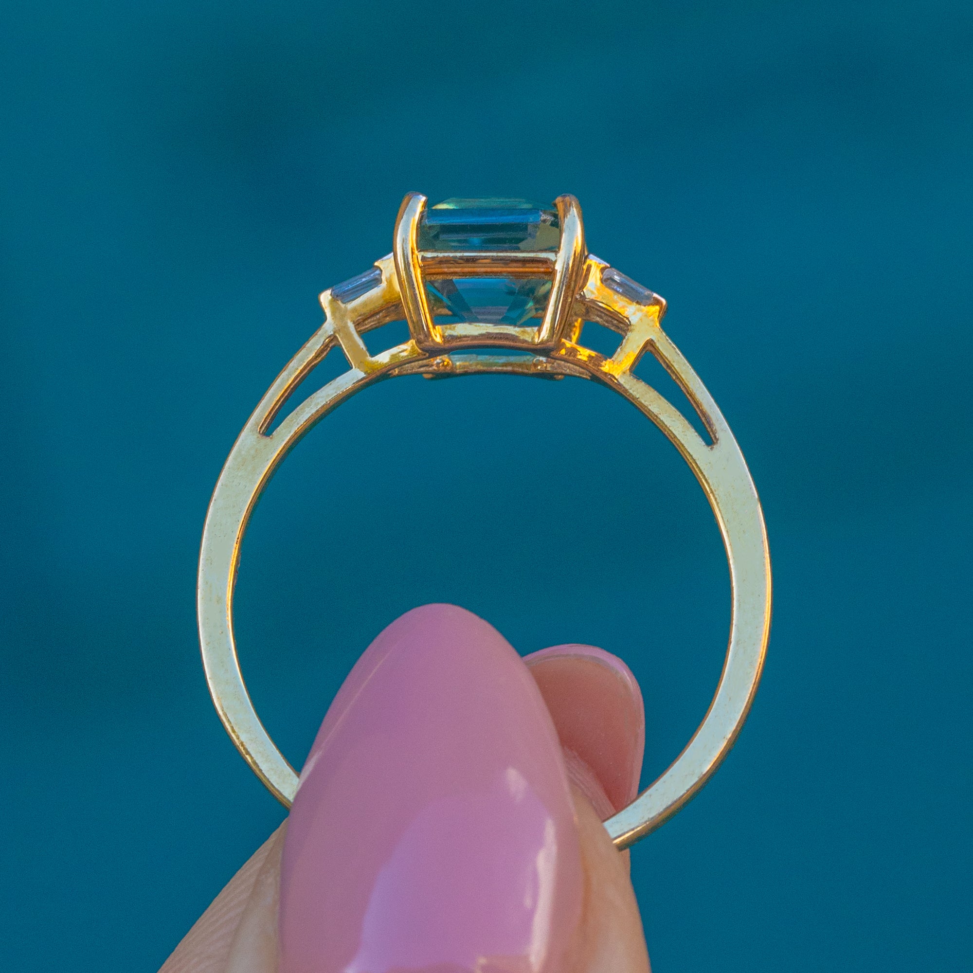 Add some glitz to your jewellery box with this 9ct Gold Asscher-cut Zircon ring! Her signature blue colour can be described as nothing less than the perfect Cinderella blue, and sits majestically between two baguette-cut Diamonds with a twinkle that dances in the light.