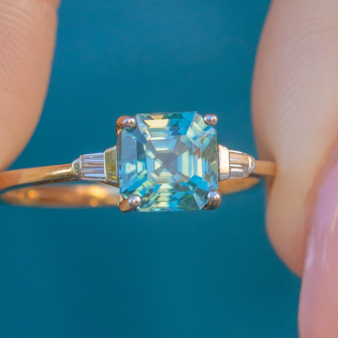 EXCELLENT. This 9ct Gold Asscher-cut Zircon ring is in excellent condition. Her 9ct Gold is well preserved and glossy, while her Diamond shoulders have retained their elegance. Her Zircon is free from wear, maintaining its neat facets and vibrant colour. With securely set gemstones and a smooth ring band, this Vintage Zircon Diamond ring will provide you with years of wear!