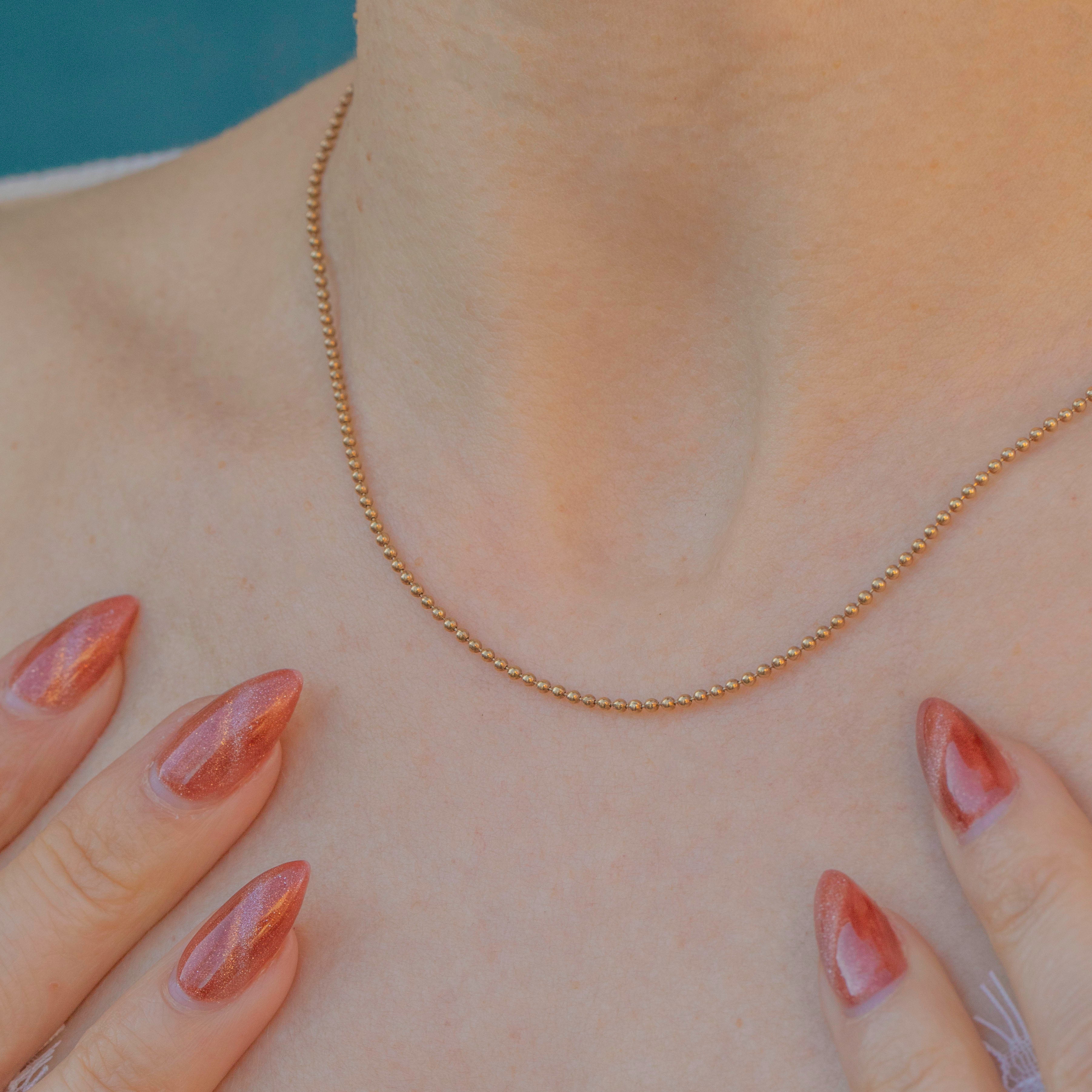 This 9ct Gold ball bead chain will bring a unique edge to your repertoire! The 16" length is crafted entirely from bright 9ct Gold and is made up of dainty ball details that will add texture to your neck stack.