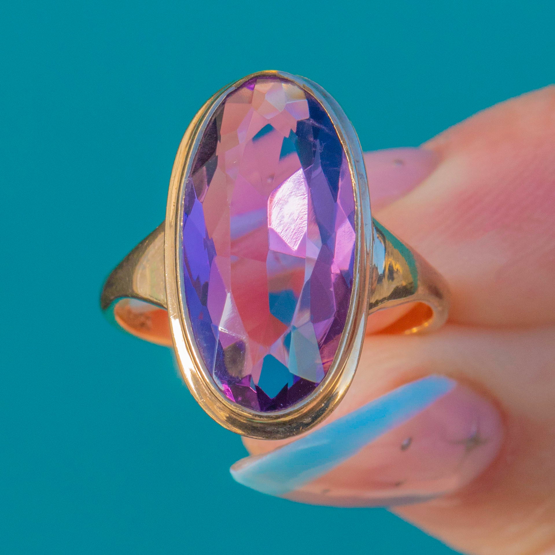 A striking Vintage 1950s solitaire, this 9ct Gold ring sets a beautifully elongated oval Amethyst in a smooth rub-over bezel for a sleek silhouette. The Amethyst is richly saturated, showing vibrant purple with violet-blue flashes that dance across its facets, and the open-backed bezel lets the stone glow.