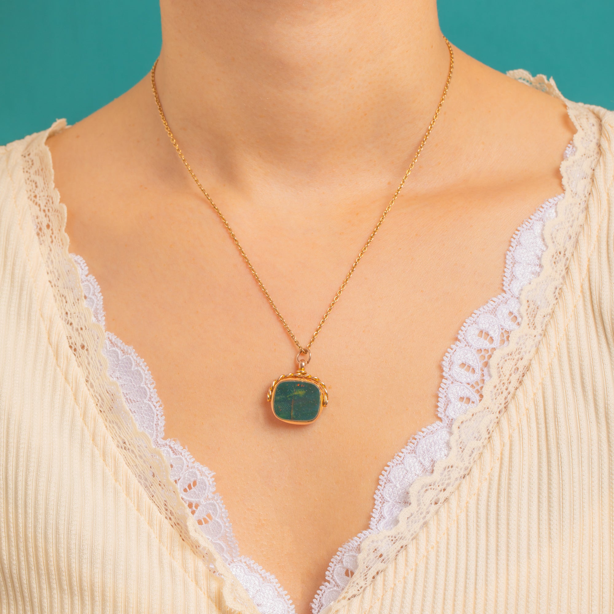 A characterful early 20th-century 9ct Gold spinner fob showcasing two timeless gems: deep forest-green Bloodstone with tiny red flecks on one side and glossy, warm orange-red Carnelian on the other. The stones are neatly bezel-set within a compact swivel mount, offering two distinctive looks in one elegant piece.