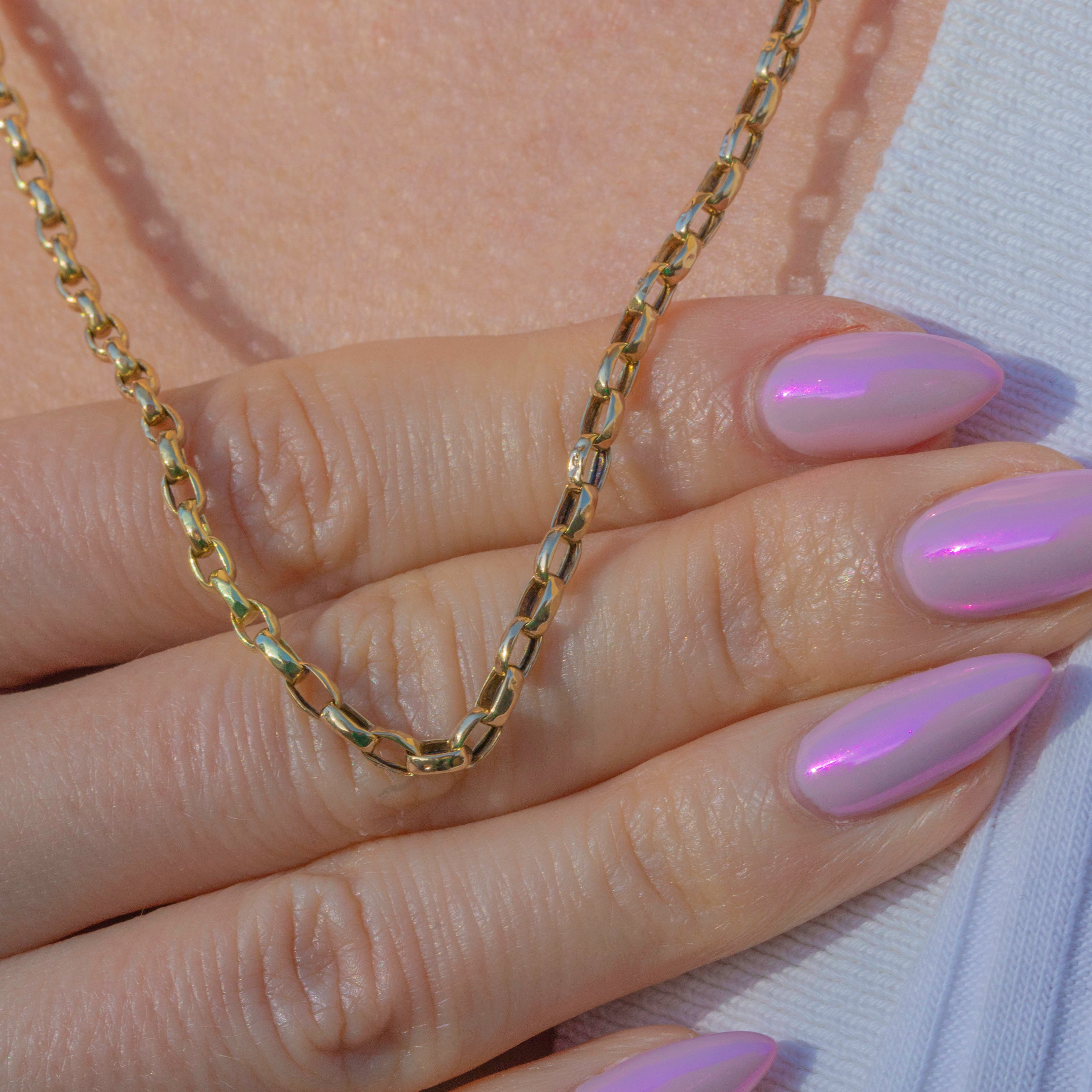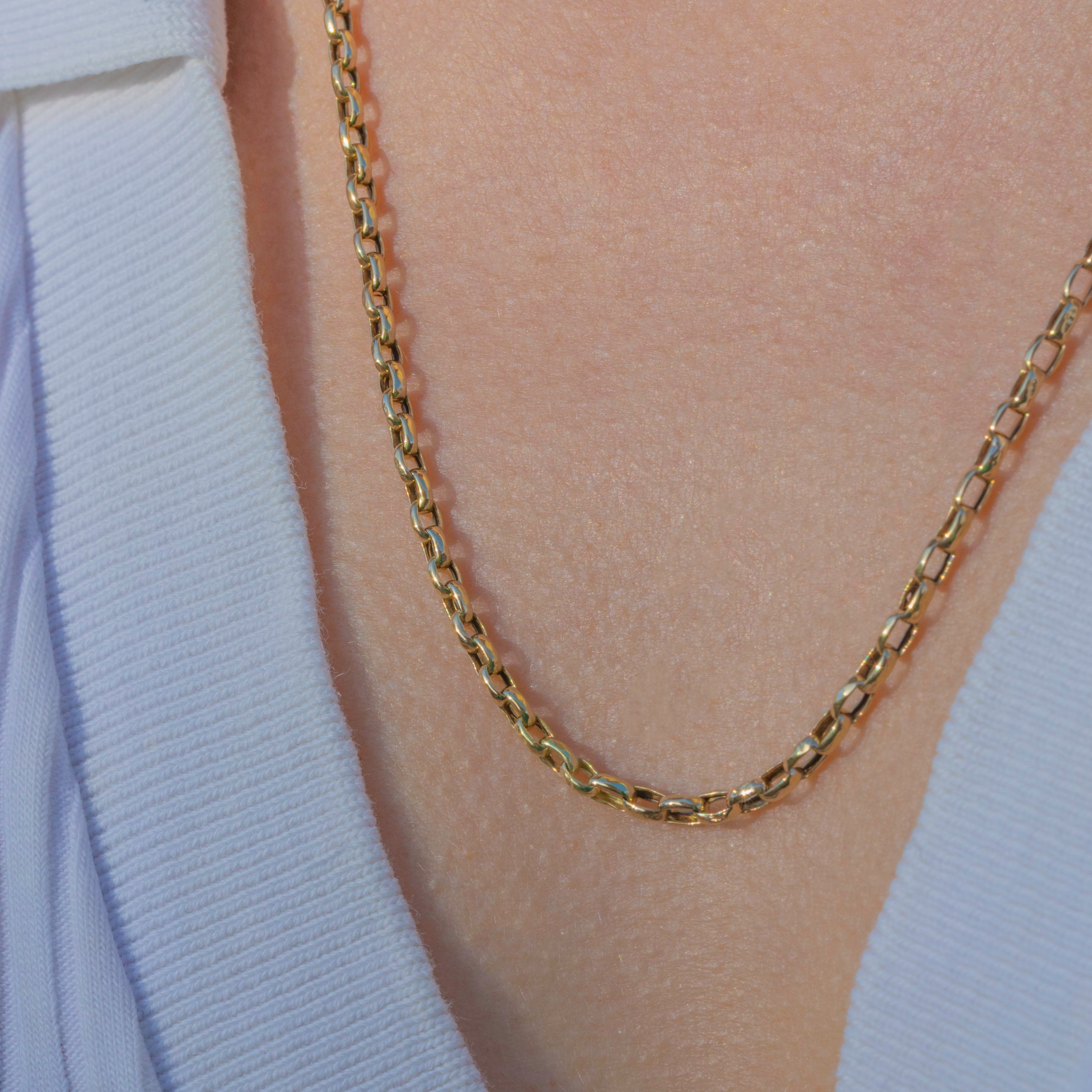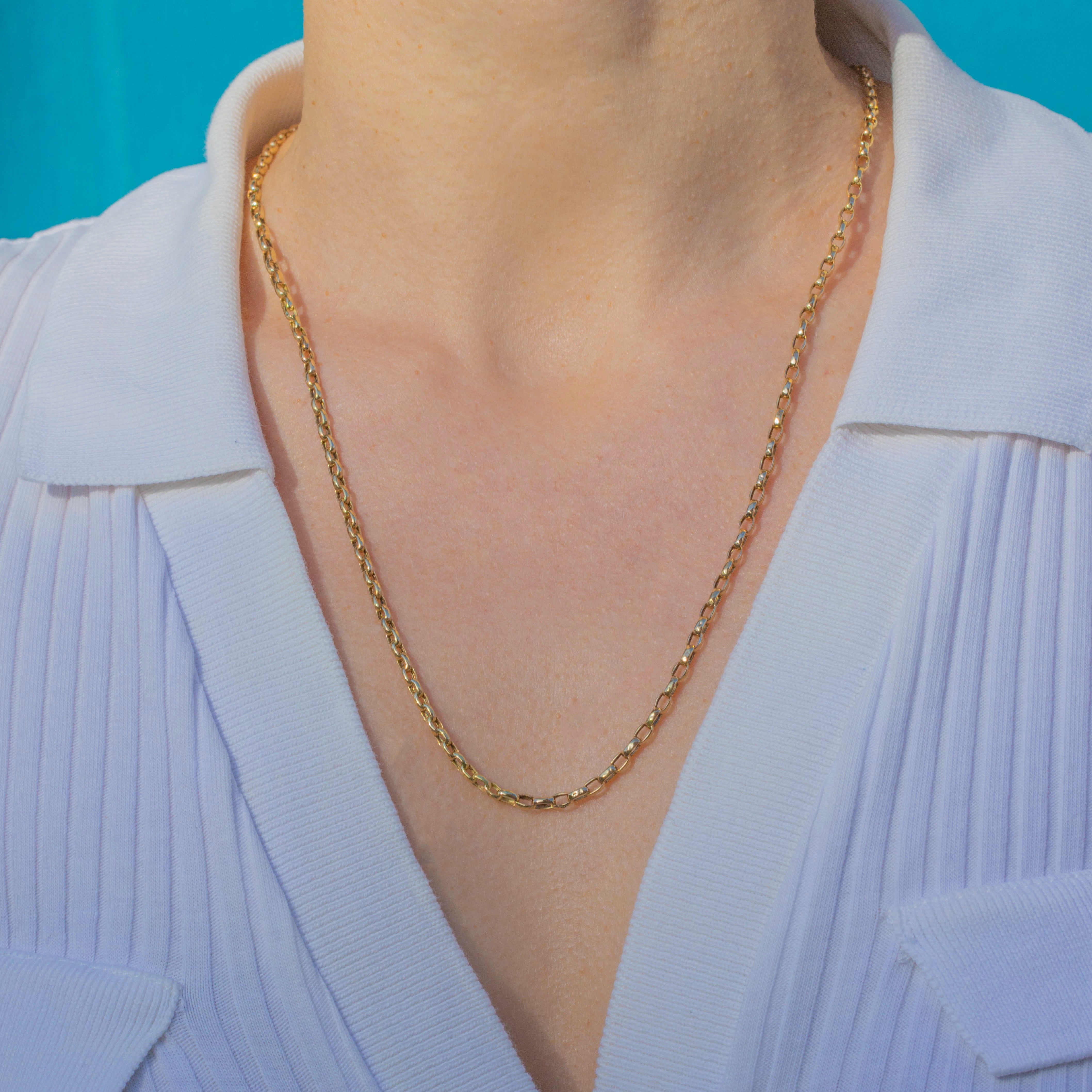 This substantial Victorian 9ct Gold belcher chain is a timeless piece of antique jewellery. The 2.5mm wide round links have a smooth golden glow and a weighty feel, giving the chain a luxurious presence on the neckline.