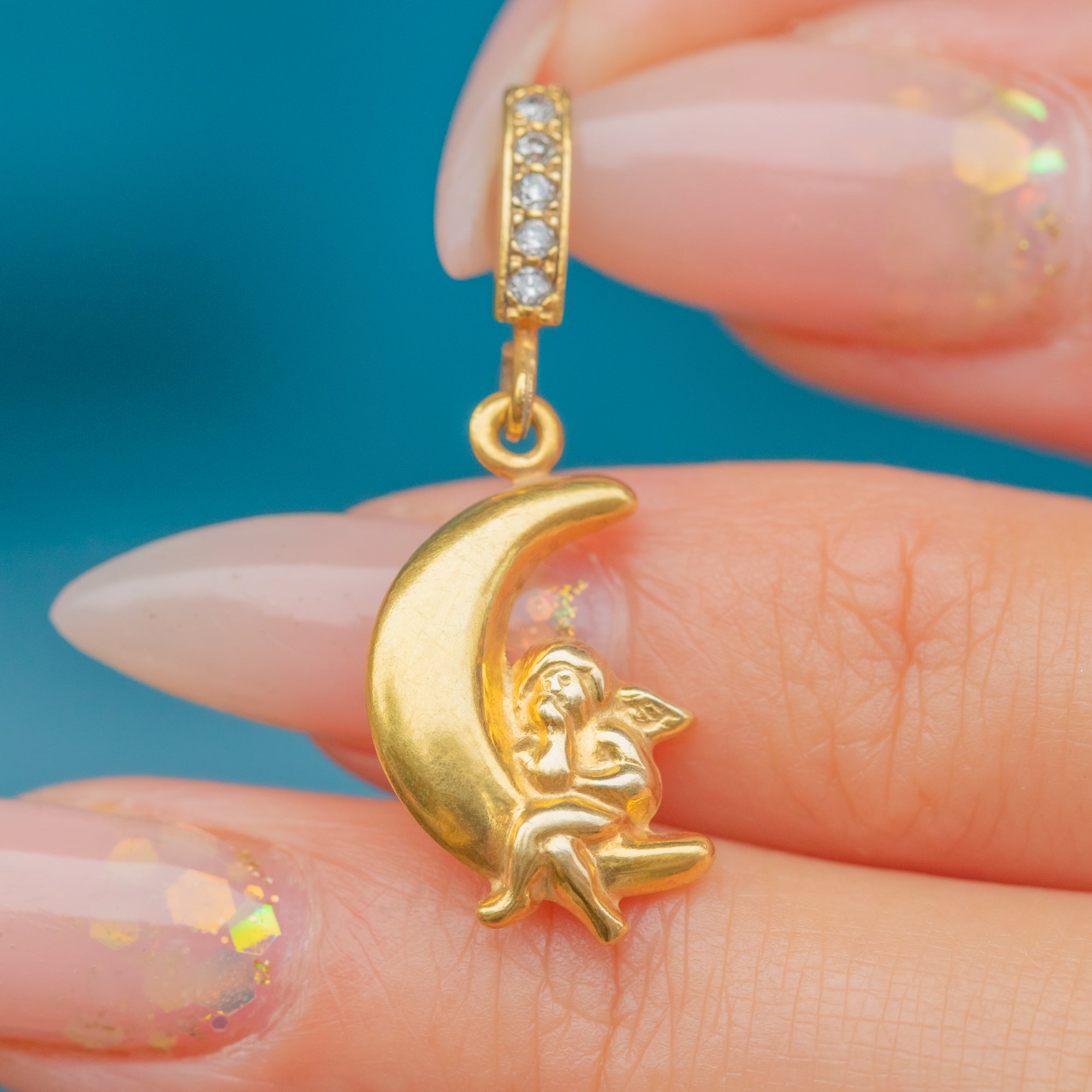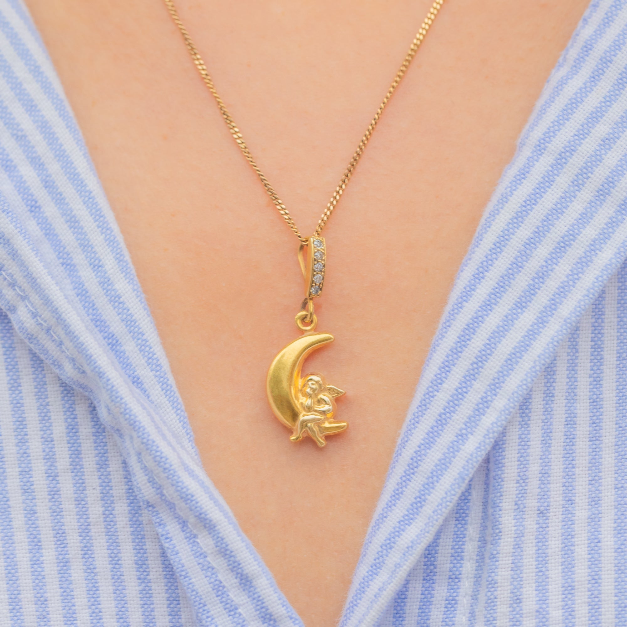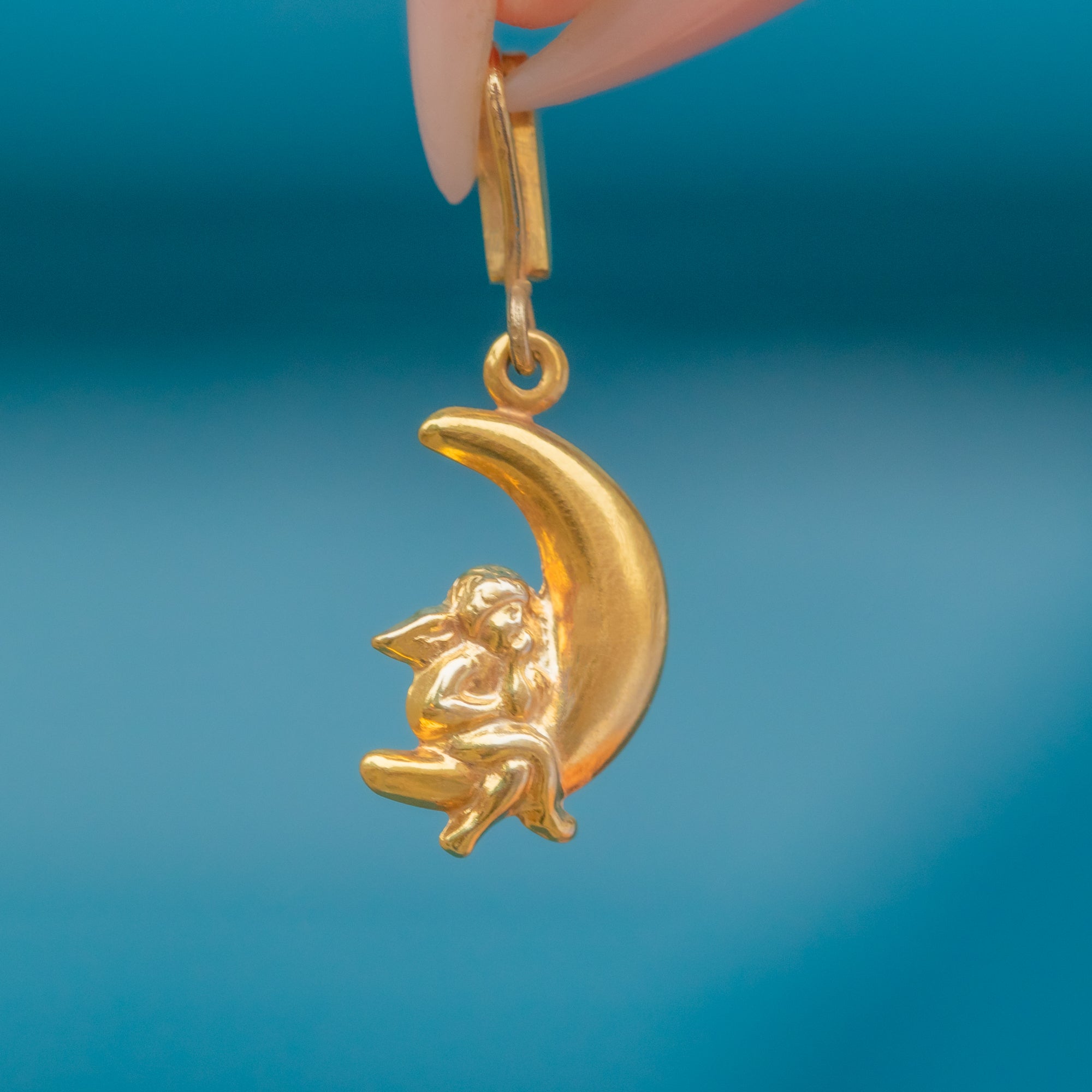 EXCELLENT: The charm is in superb condition. The cherub and crescent moon are well-detailed, the Gold is smooth and polished, and the Diamond is bright and securely set. The jump ring is sound and ready to wear.
