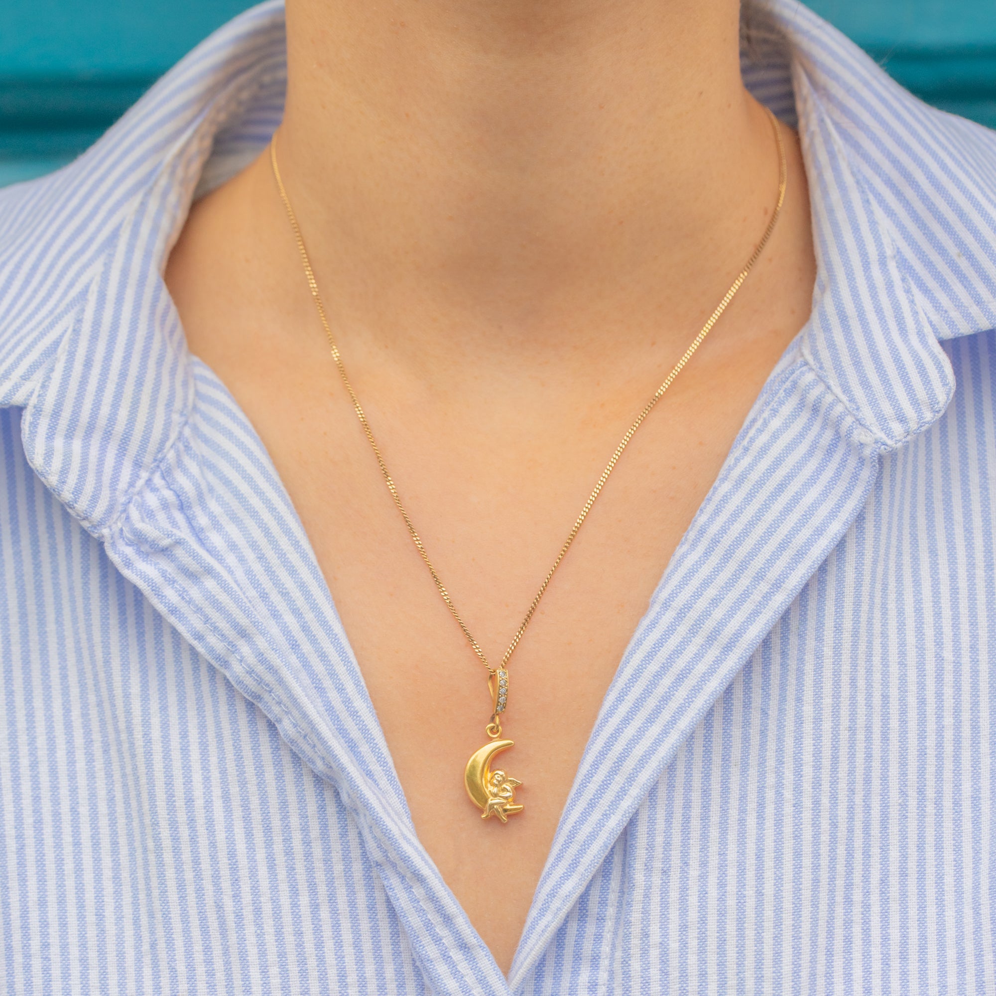 This whimsical Mid-Century charm is crafted in 9ct Gold and features a sweet cherub perched on a crescent moon. The Diamond-encrusted bale adds a touch of sparkle, perfectly complementing the playful yet romantic design.