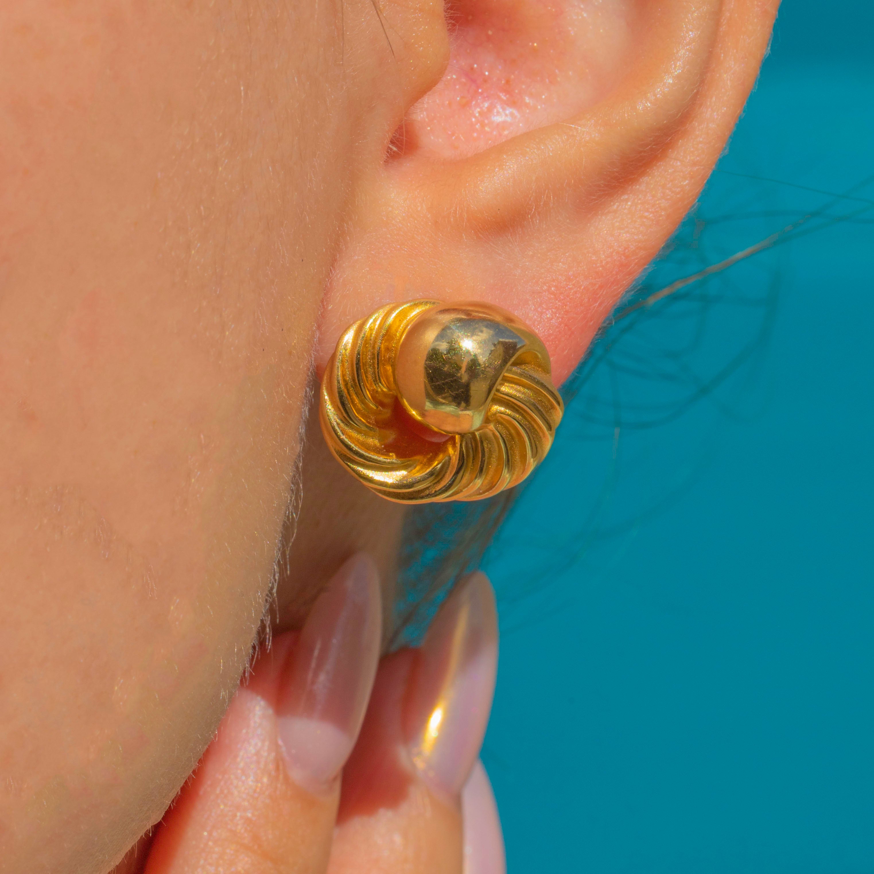 Bold yet refined, these Mid-Century Vintage earrings are crafted in rich 9ct Gold with a sculptural twisted design. Circular in form, they feature deep ridges that create a striking play of light across the Gold surface, giving them both texture and dimension.