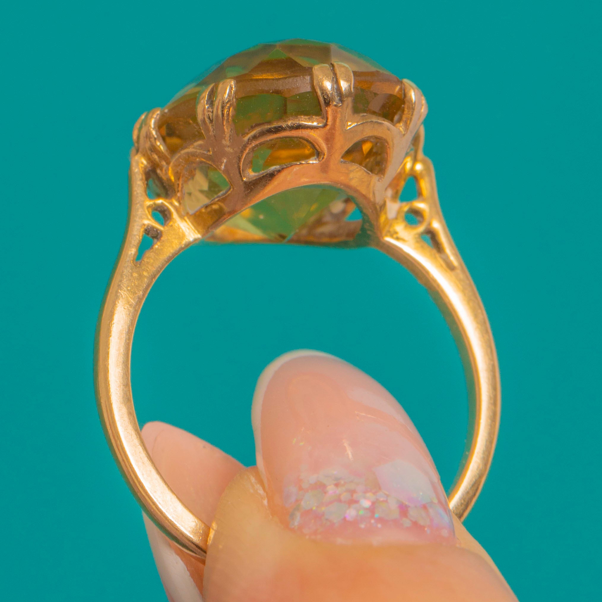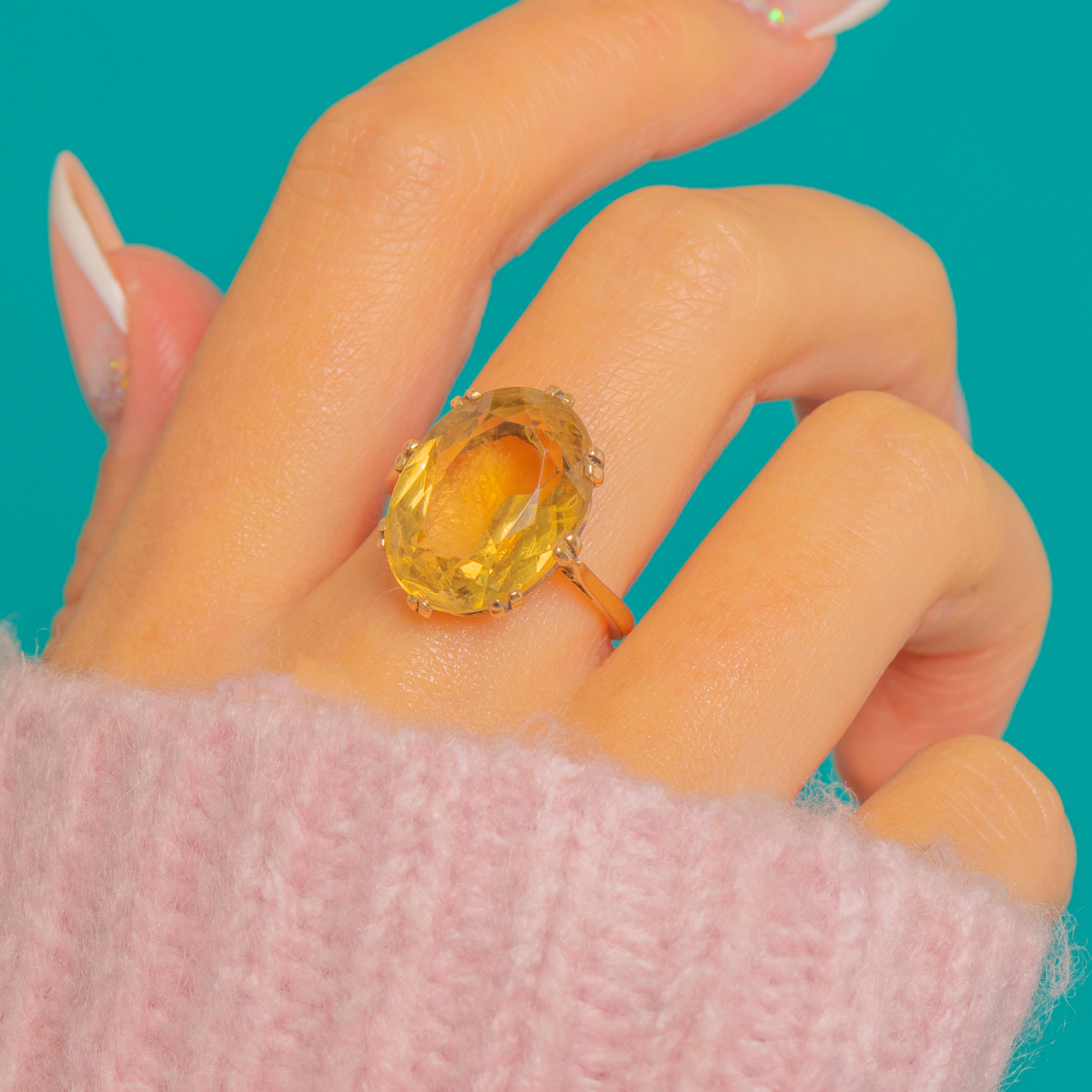 This radiant vintage statement ring showcases a large oval Citrine glowing with golden sunshine tones. The gem is presented in a tall open coronet with a scalloped, delicately pierced gallery, all set on a clean, tapering band for an elegant, timeless silhouette.