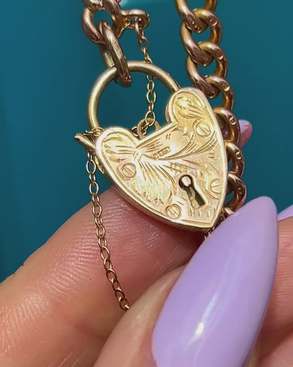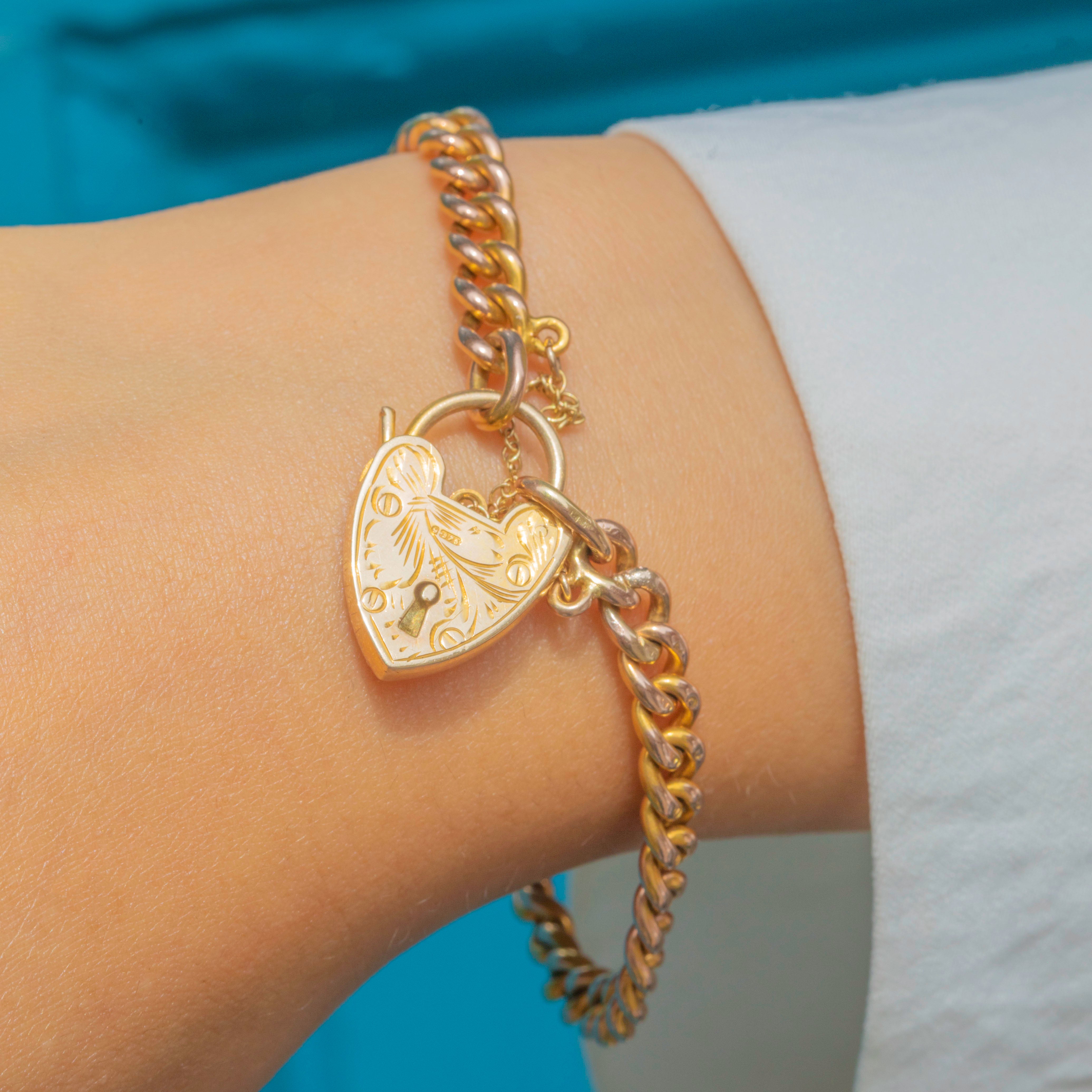 The cute heart padlock is a later addition, dating to 1959, and displays whimsical engravings sweeping across its front. Steeped in romantic sentiment and exuding luxury from its every curve, this Victorian Gold bracelet would make a lovely gift choice or special treat for yourself!