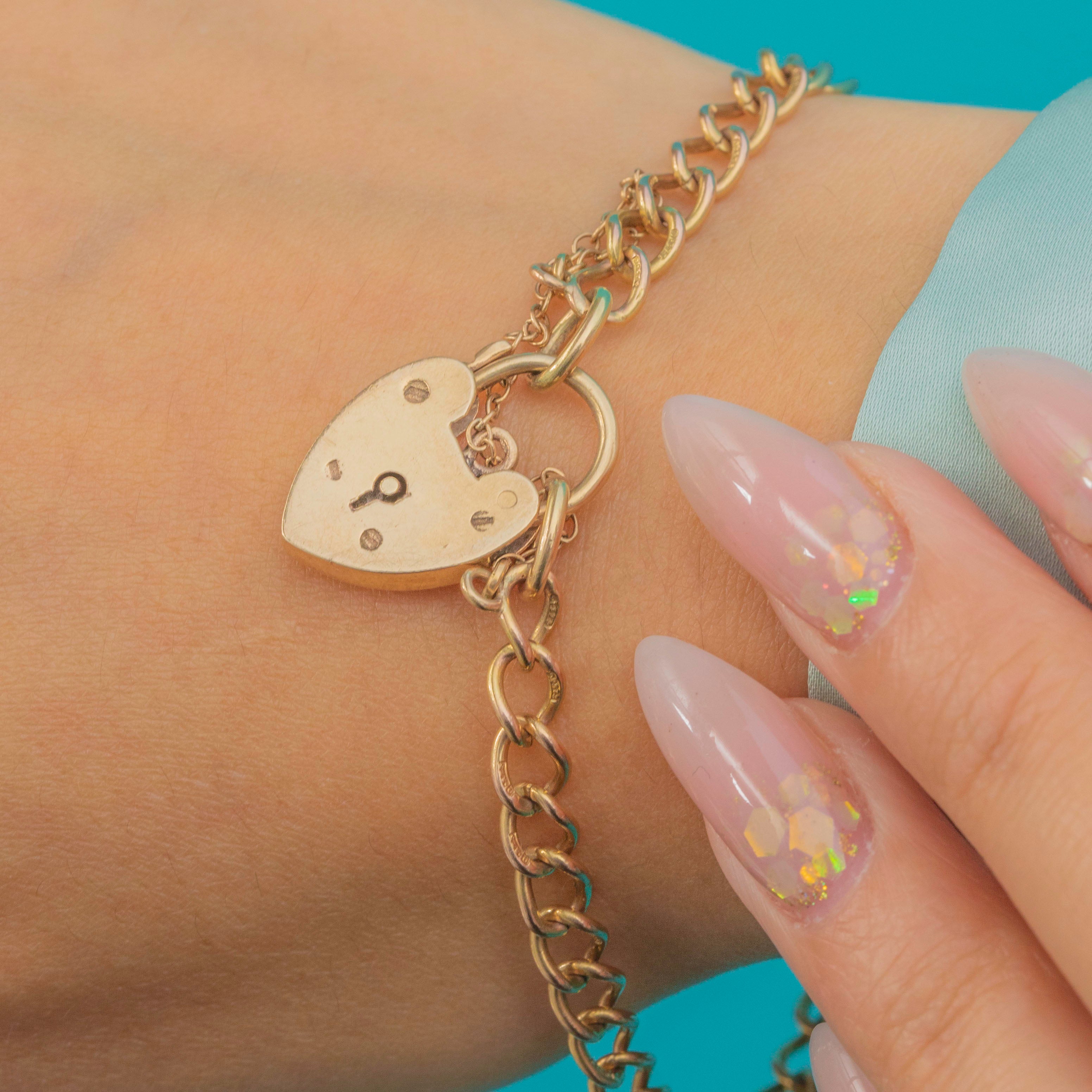 This charming Vintage bracelet is crafted in 9ct Gold with classic curb links and a romantic heart padlock clasp. A safety chain adds extra security, making it as practical as it is stylish.