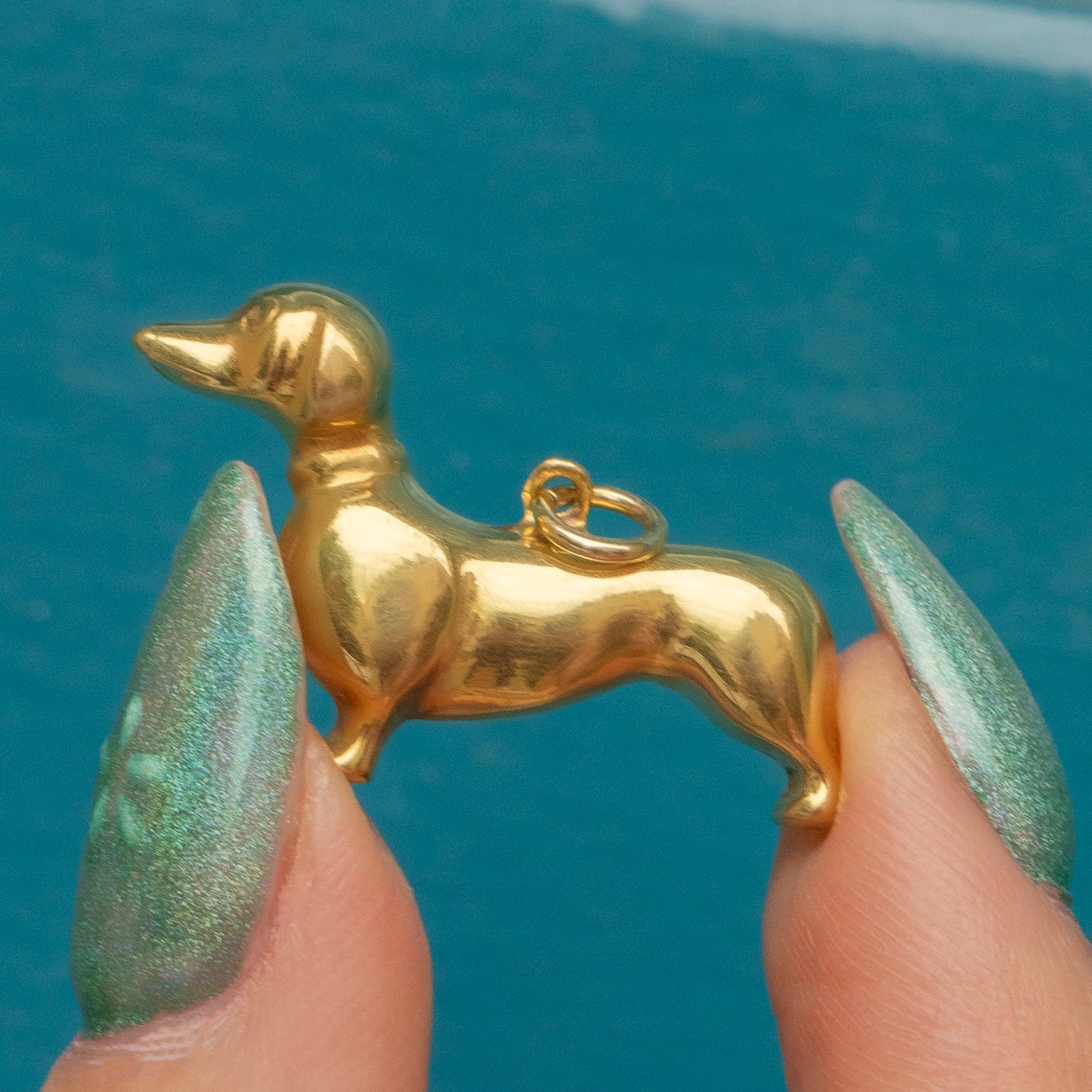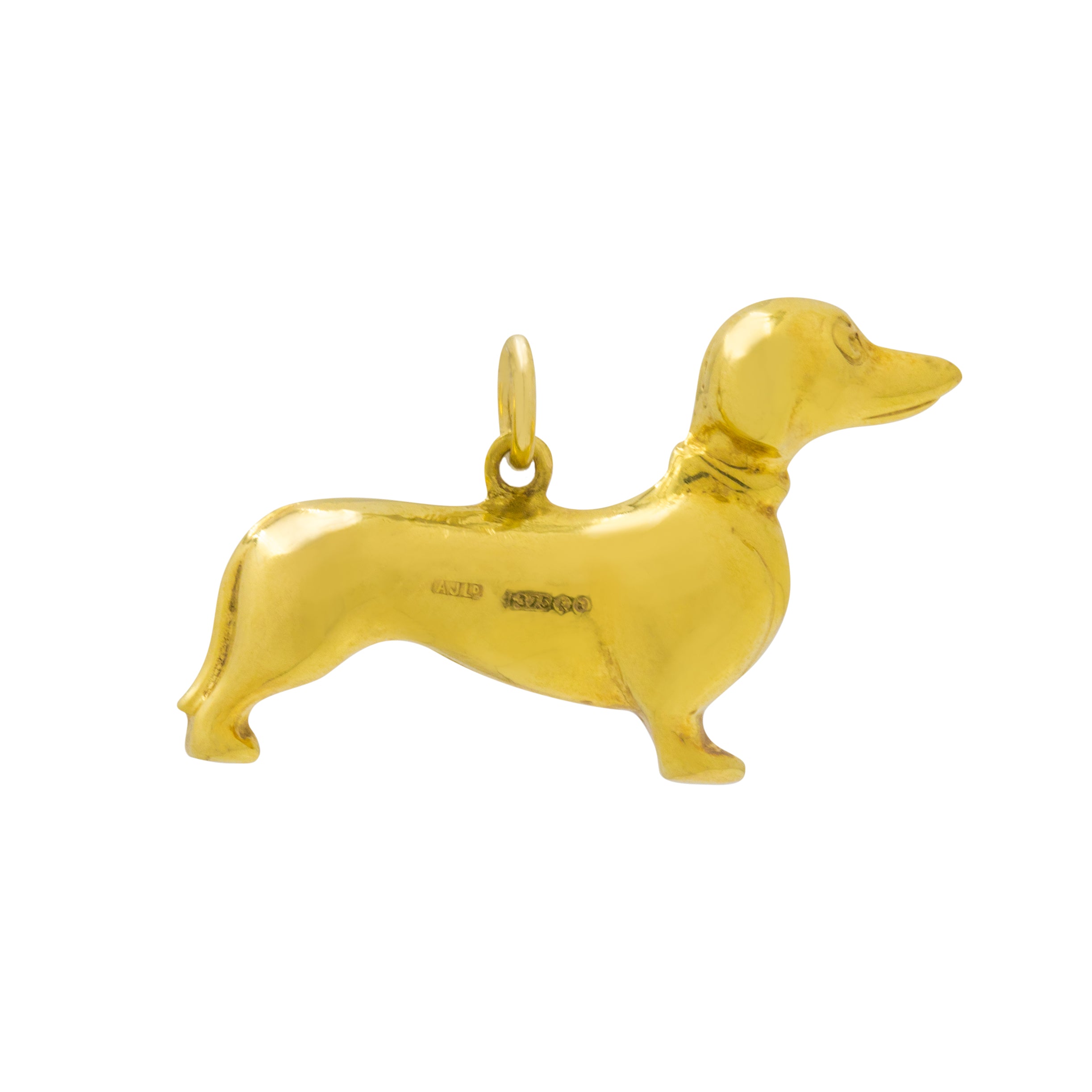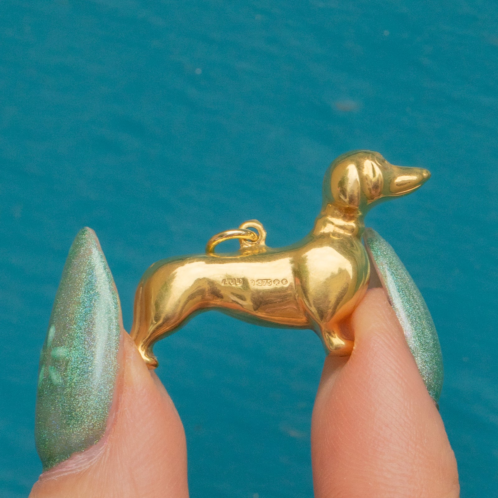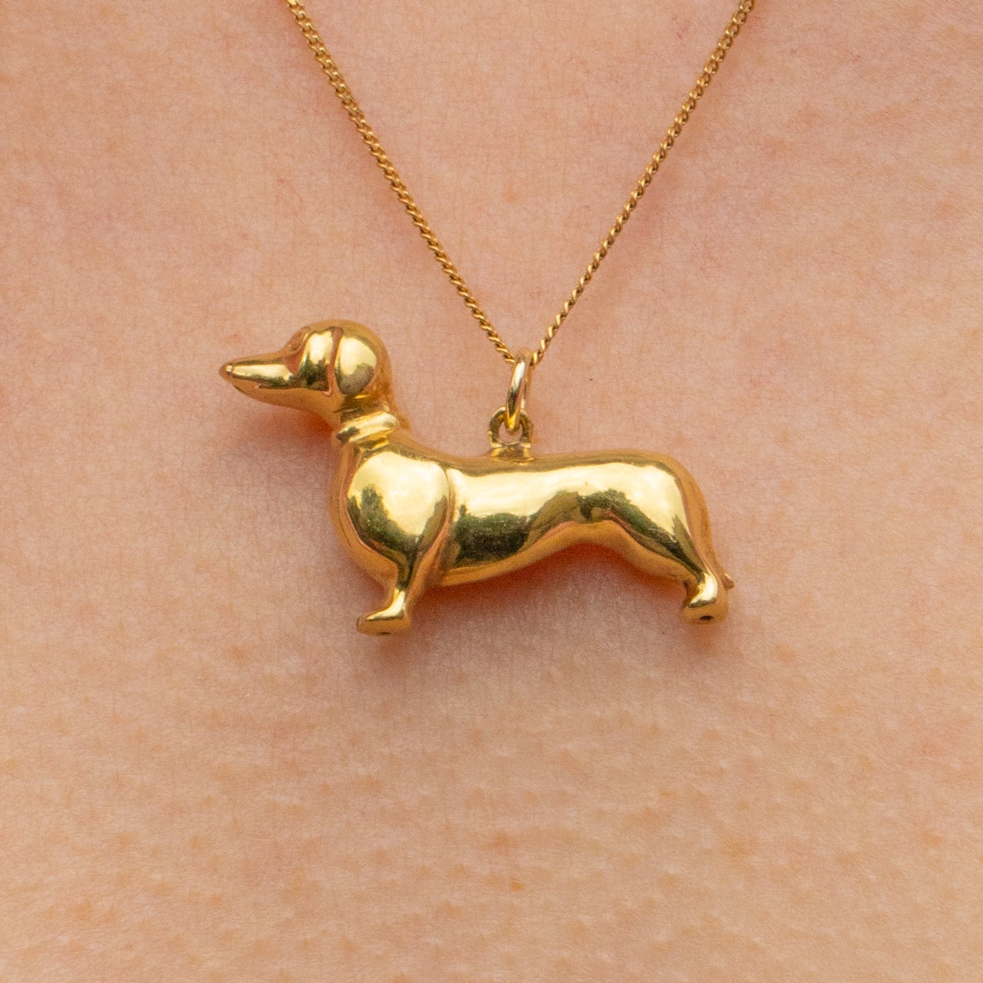 EXCELLENT: We are pleased to present this 9ct Gold Dachshund dog pendant in excellent condition. The 9ct Gold is glossy and the small details remain crisp and clear, with a full set of hallmarks dating to 1965. You won't be able to help but smile every time you look at this sweet sausage, the perfect charm to honour your loyal companion!
