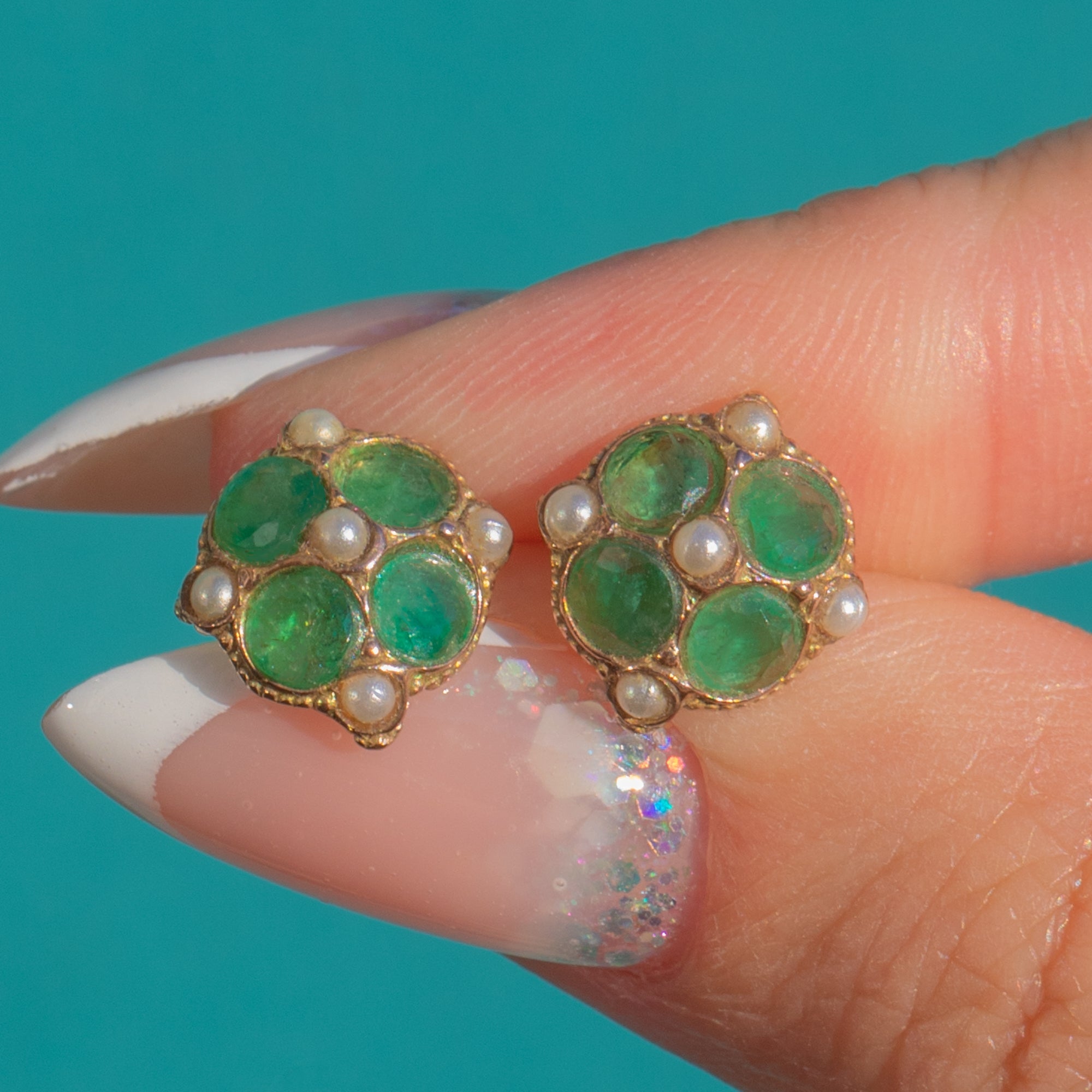 These charming Victorian Emerald and Pearl cluster earrings are a gorgeous example of late 19th-century design. Crafted in warm 9ct Gold, each earring is set with four verdant Emeralds arranged in a rounded cluster, punctuated by delicate natural Pearls for a soft, romantic glow.