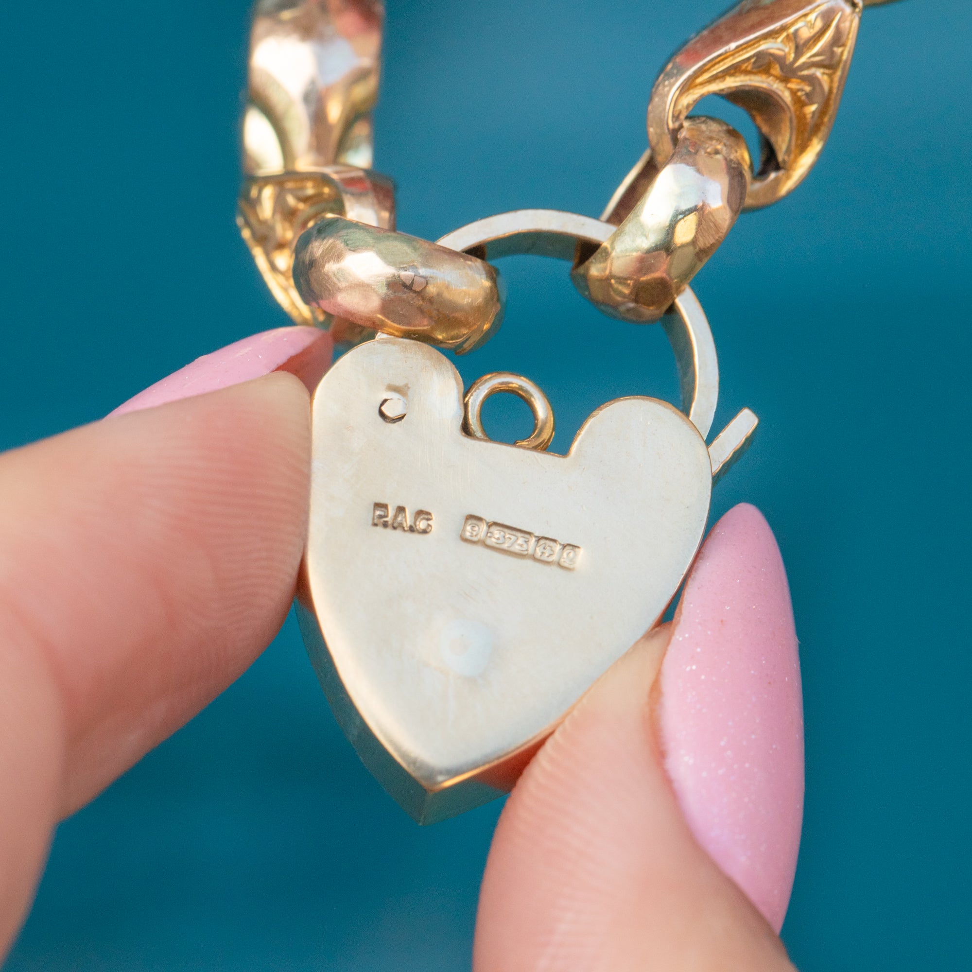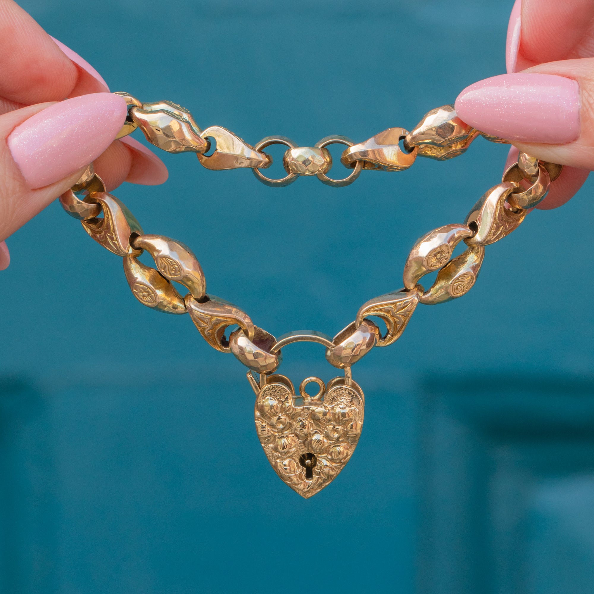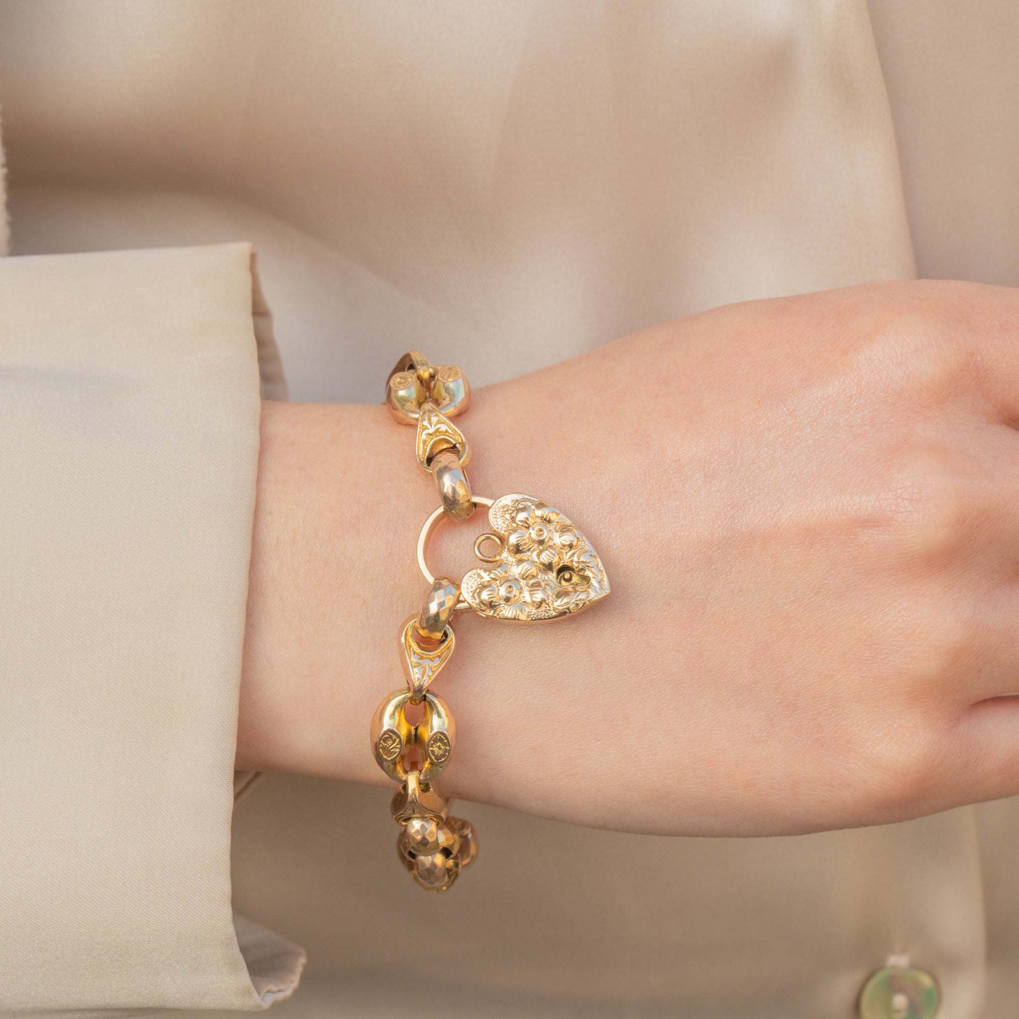 9ct Gold Engraved Fancy Bracelet, Repousse Heart Padlock