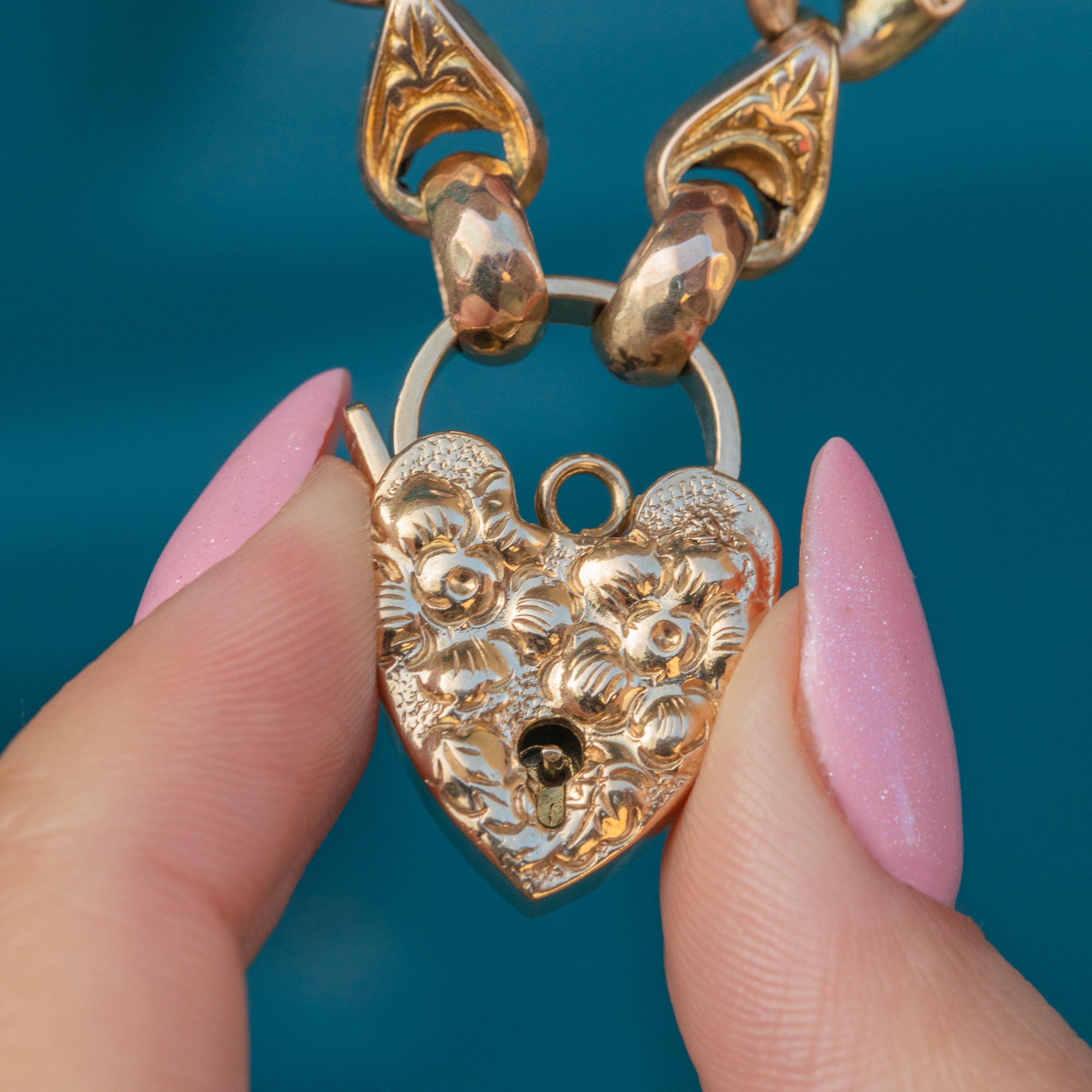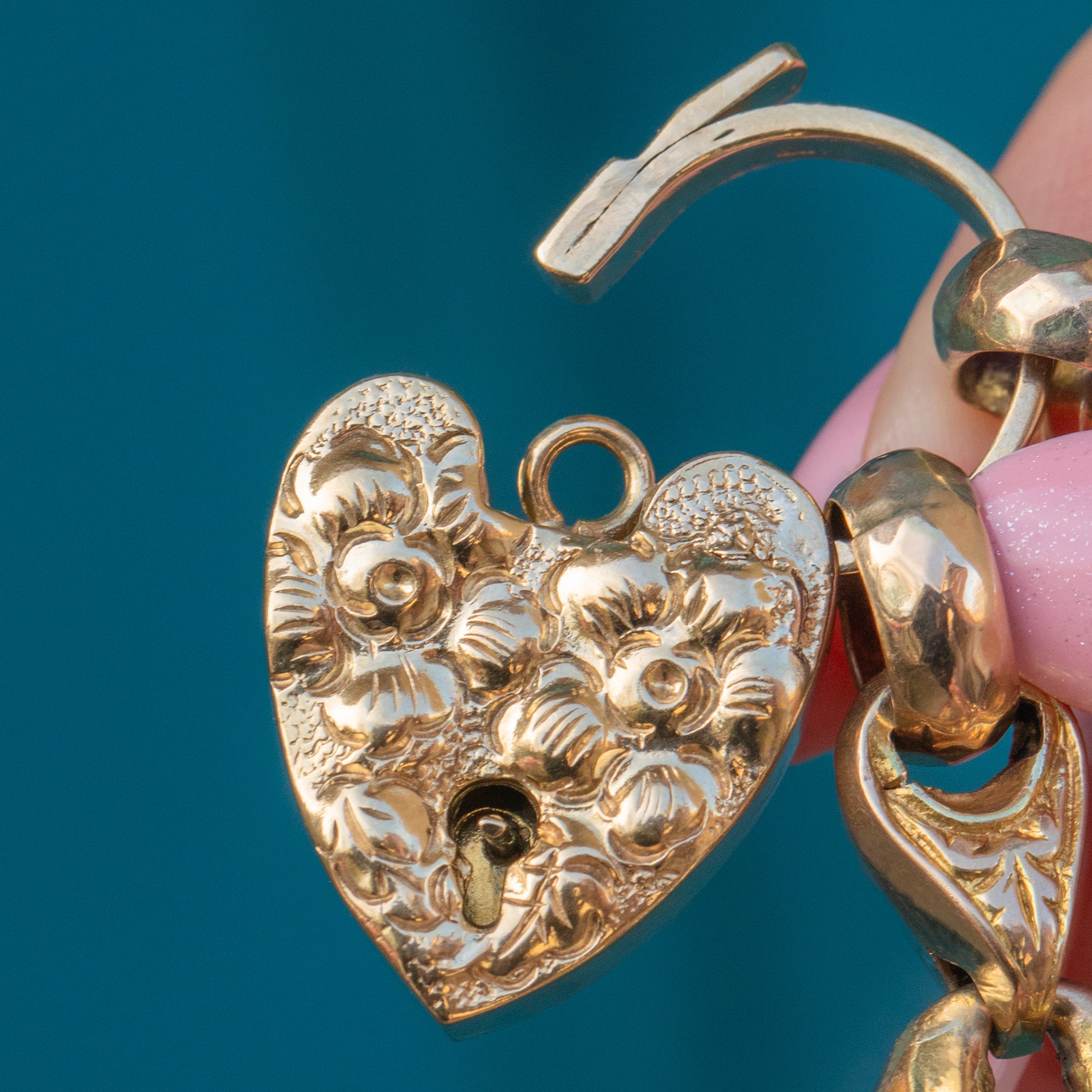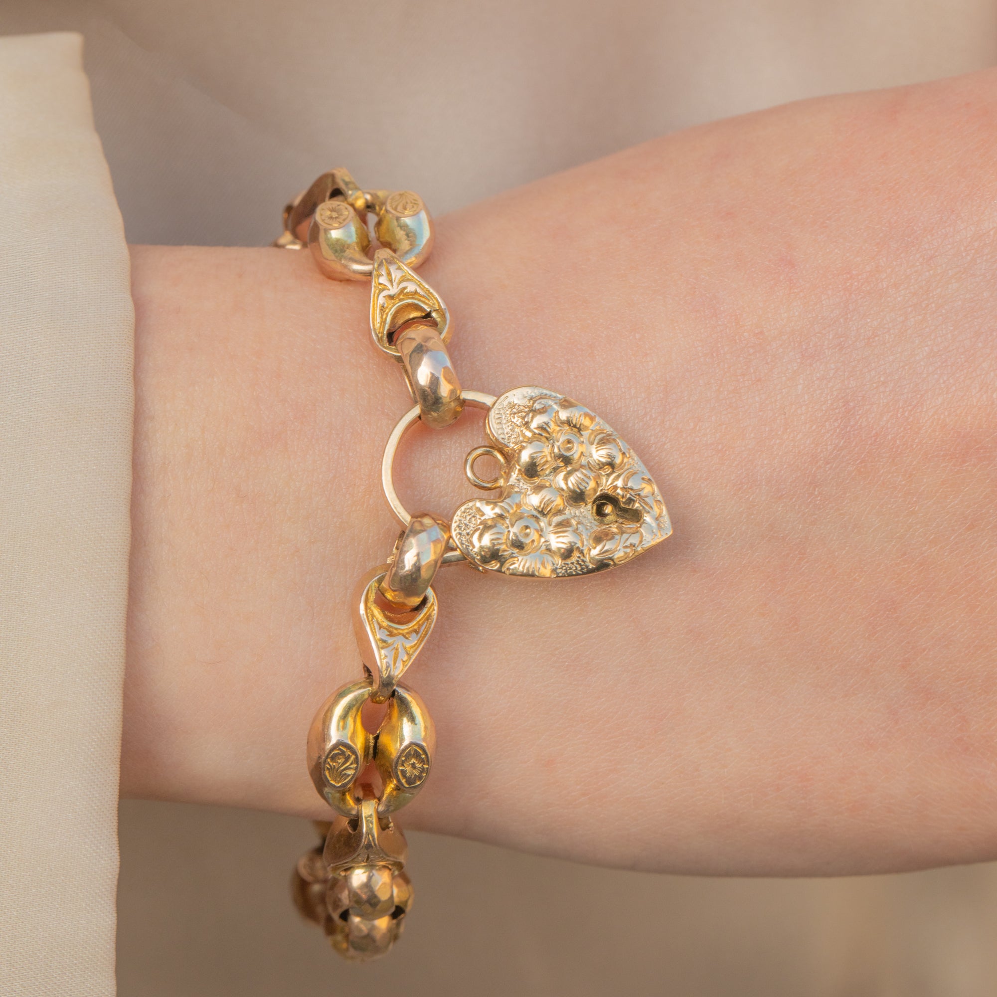 The repoussé heart padlock gently secures this wonderful vintage bracelet, adding a romantic touch and making her the perfect love token!