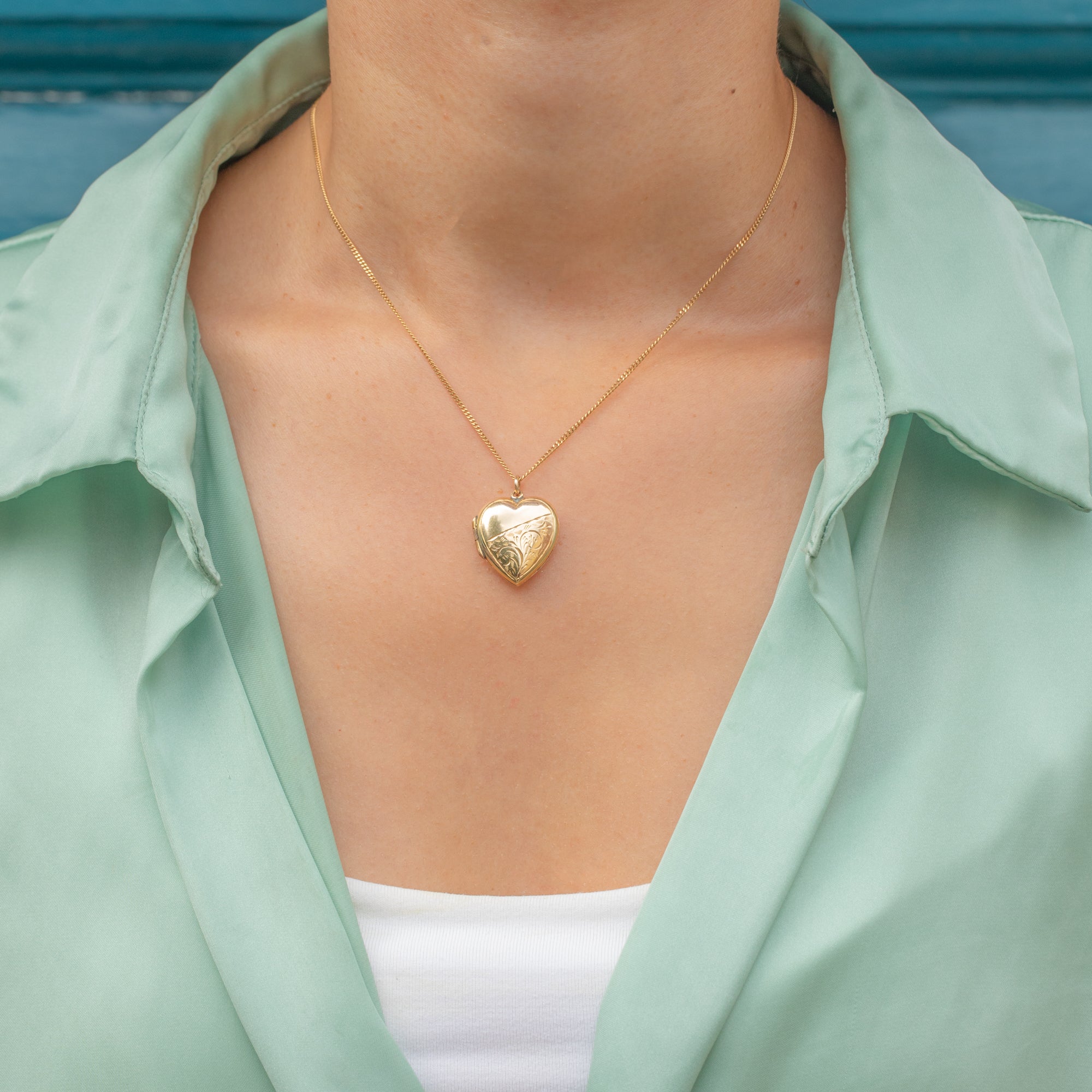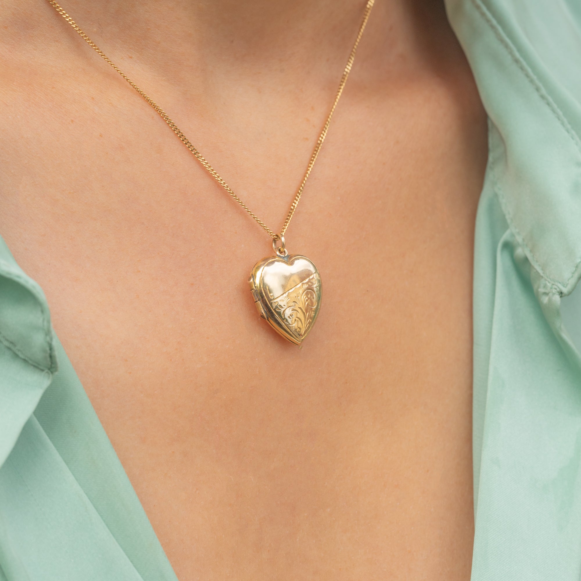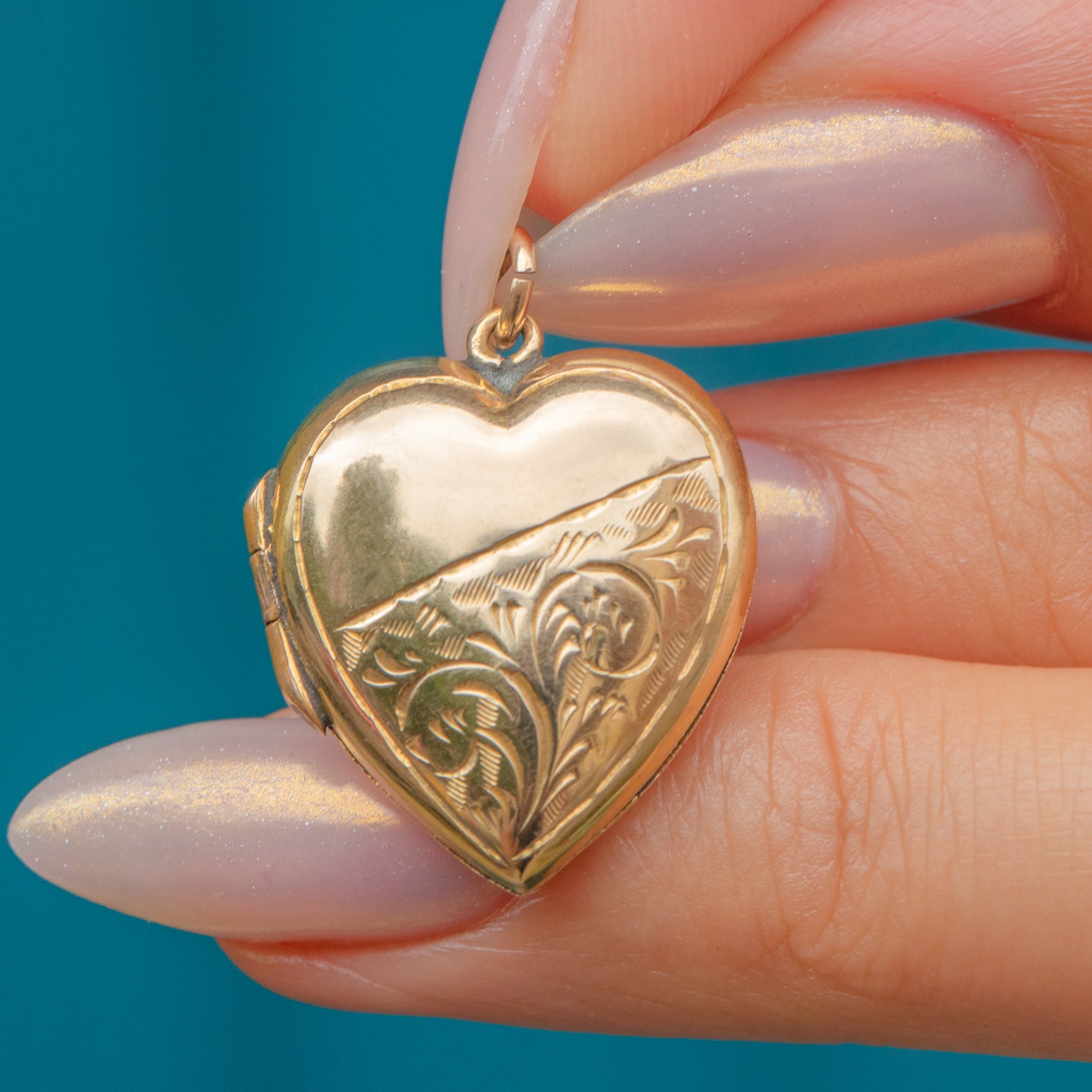 This adorable bright and glossy 9ct Gold vintage locket features intricate engravings upon the front, adorned with baroque style swirls which provide a lovely texture.