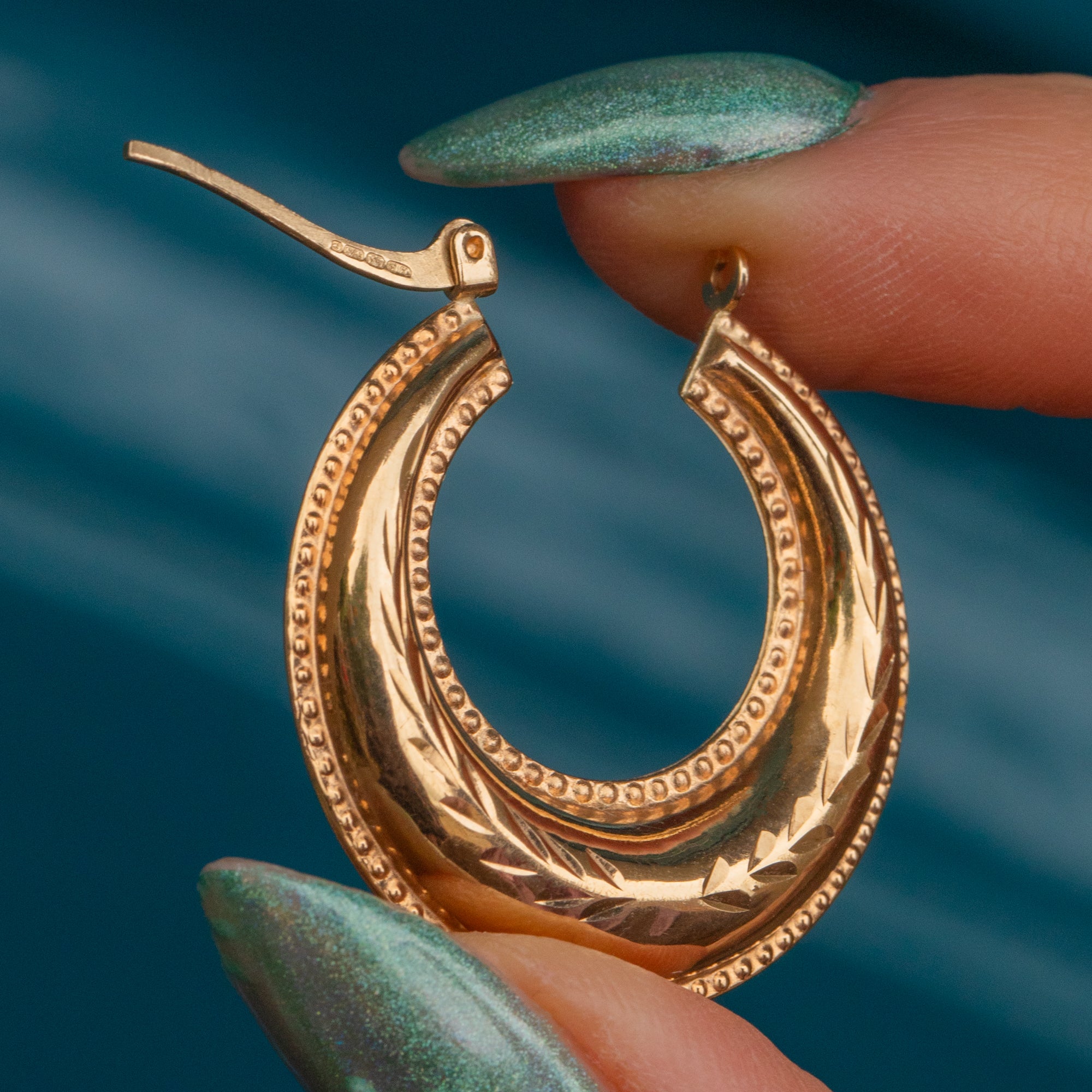 If you have a penchant for all things Gold and glossy, these 9ct Gold engraved hoop earrings were made for you! Their puffy form is crafted from splendorous 9ct Gold, displaying wreath like engravings through the centre and sealed with a beaded edge detail.