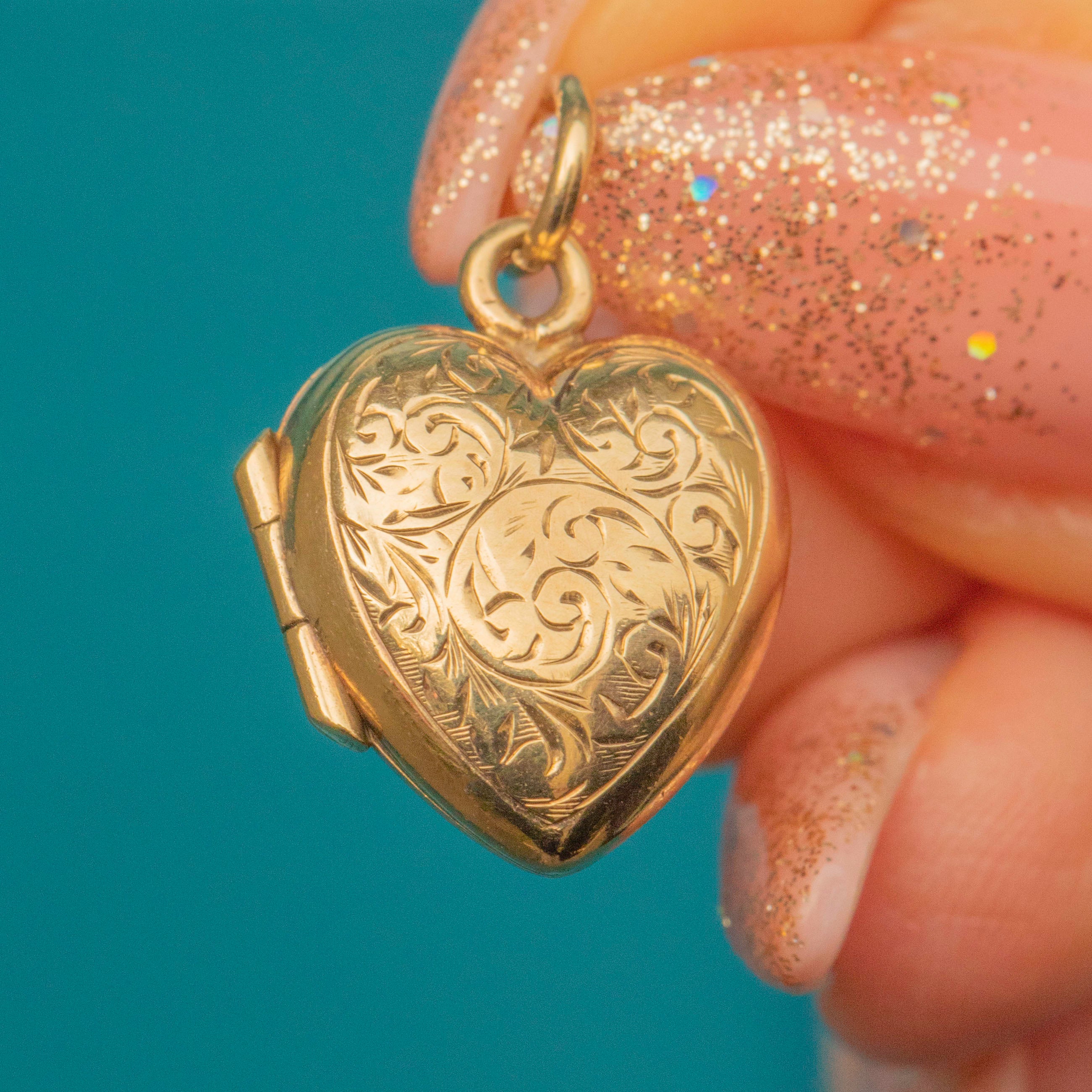 EXCELLENT This 9ct Gold Engraved Mini Heart Locket is in superb condition, with its intricate acanthus leaf engravings perfectly preserved. Tiny age-related dings blend seamlessly into the design, remaining unnoticeable when worn. It opens easily and secures tightly, keeping your treasured keepsakes safe and close to your heart.