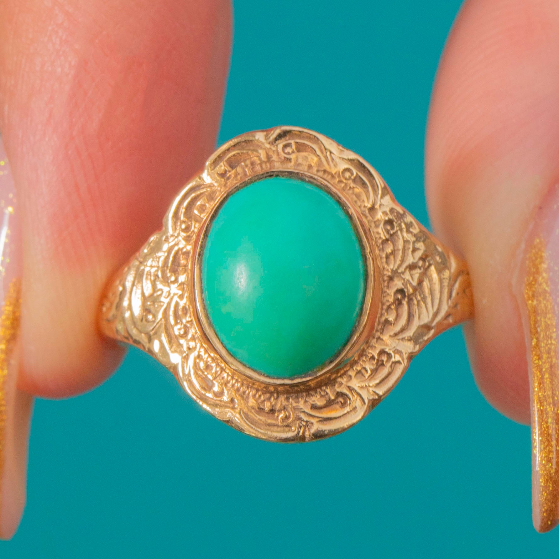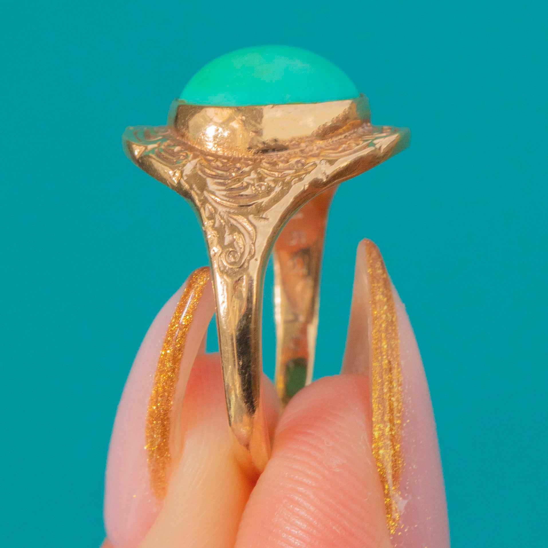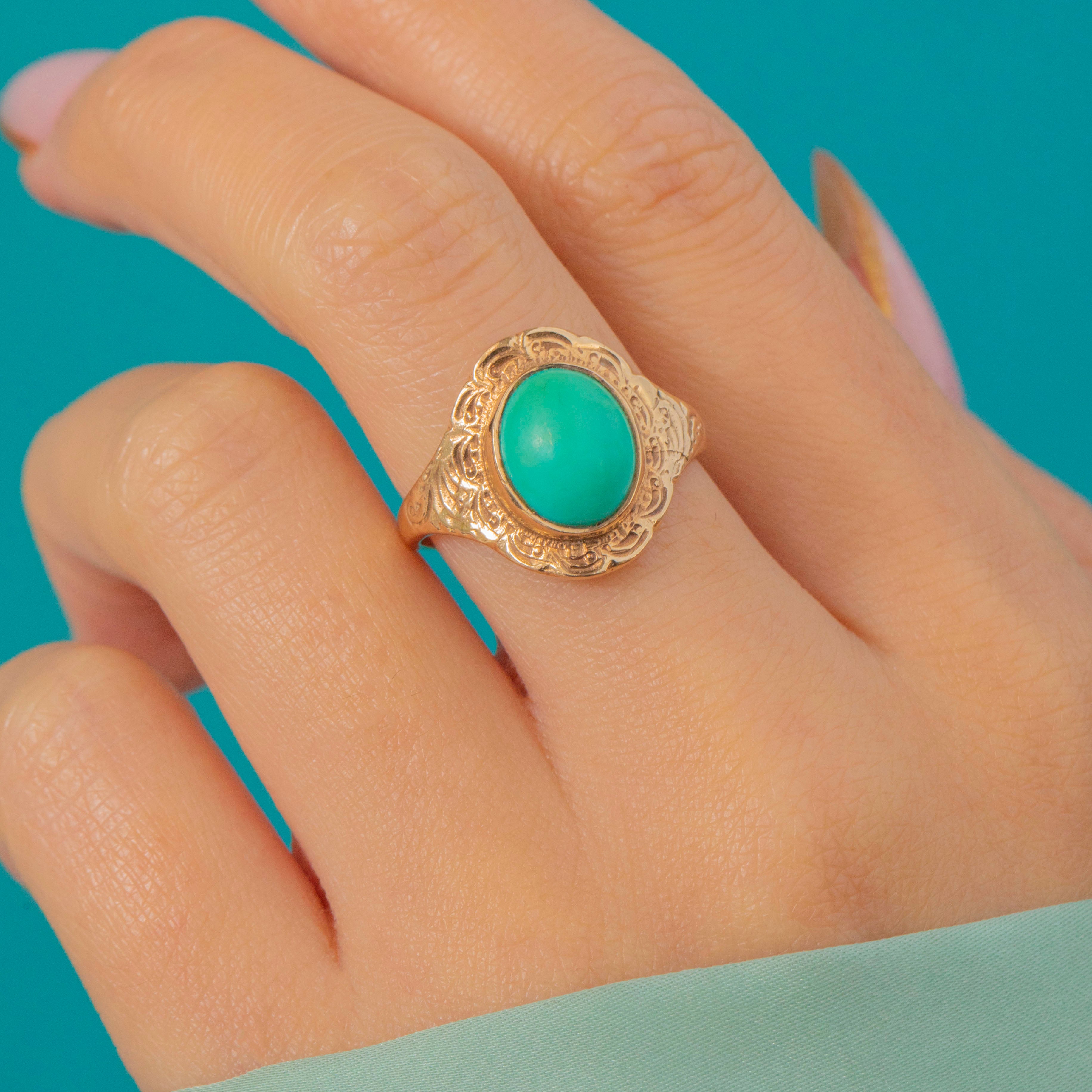 The smooth, domed Turquoise cabochon sits proudly within an ornately engraved border, the goldwork catching the light beautifully from every angle. Hallmarked for London 1975, this piece perfectly combines retro boldness with antique-inspired charm, a statement ring that feels both timeless and fresh.