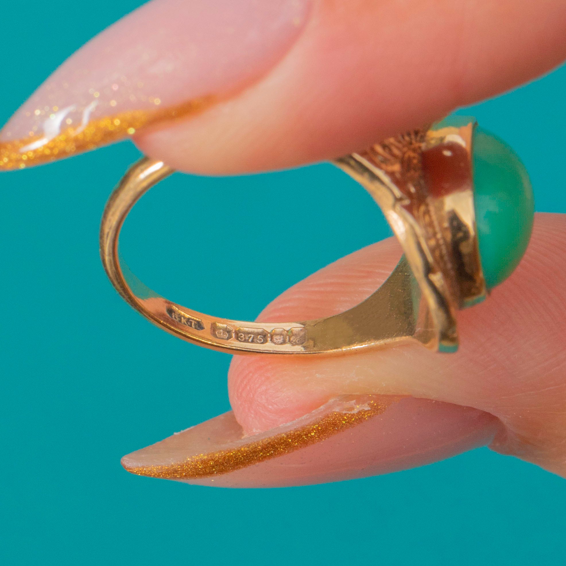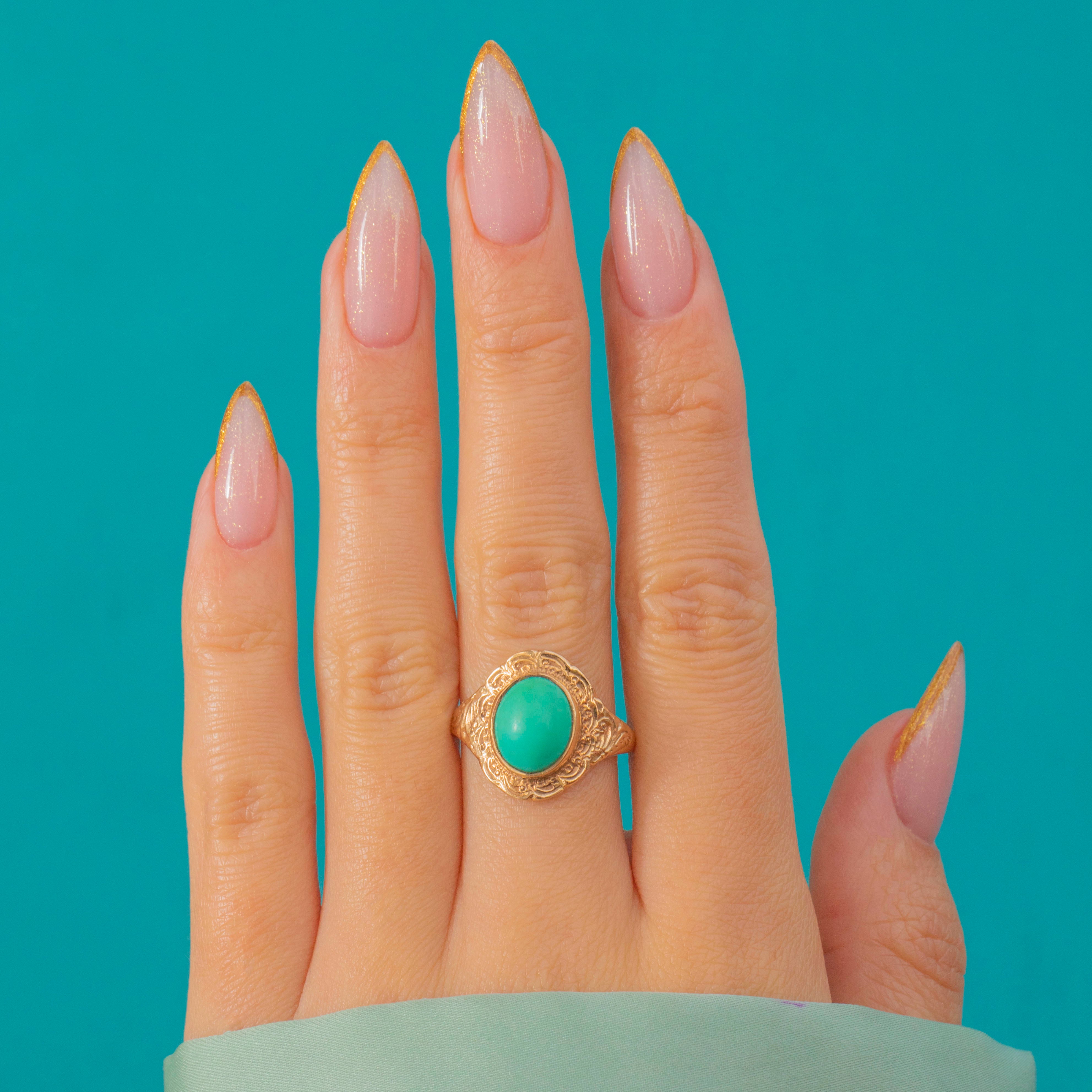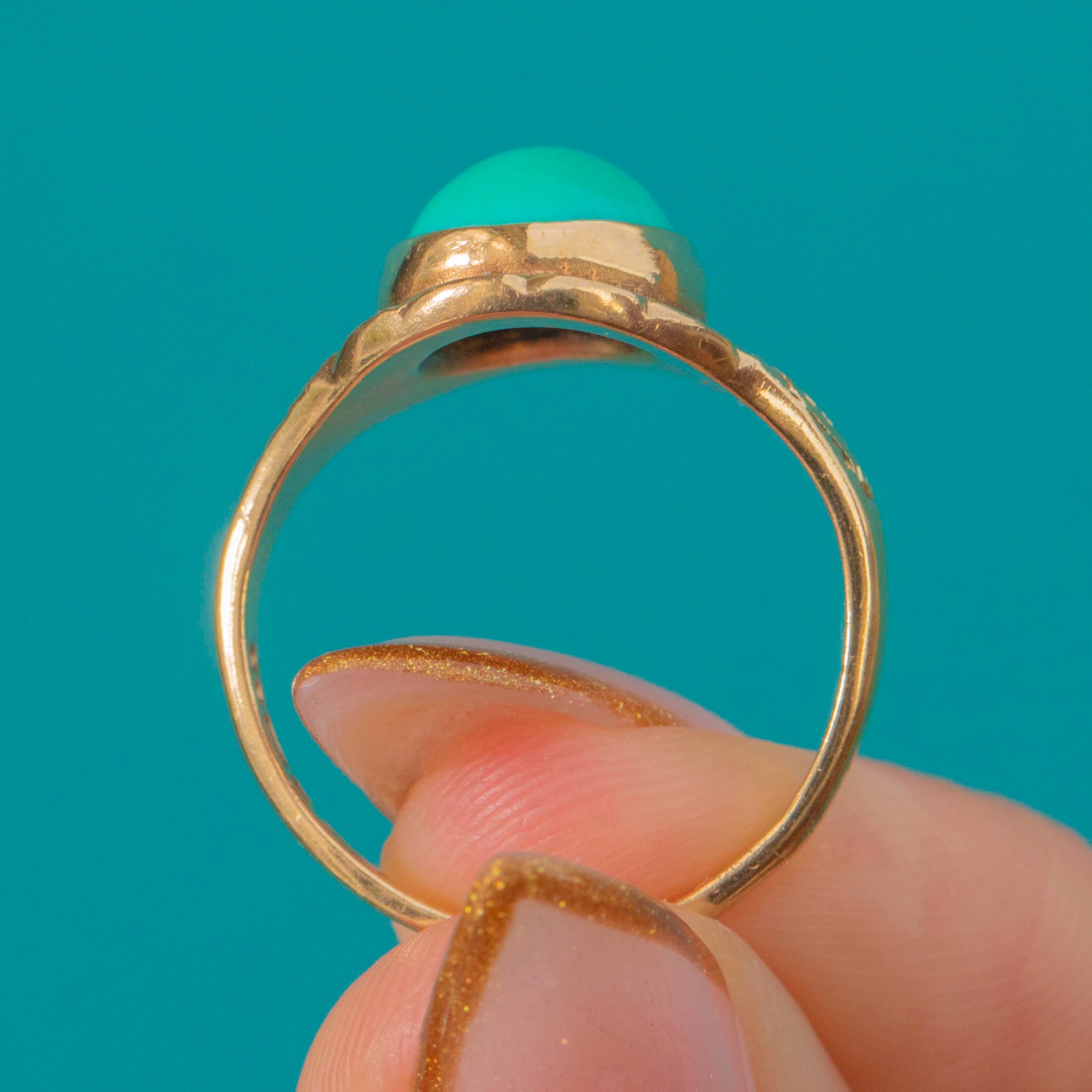 The smooth, domed Turquoise cabochon sits proudly within an ornately engraved border, the goldwork catching the light beautifully from every angle. Hallmarked for London 1975, this piece perfectly combines retro boldness with antique-inspired charm, a statement ring that feels both timeless and fresh.