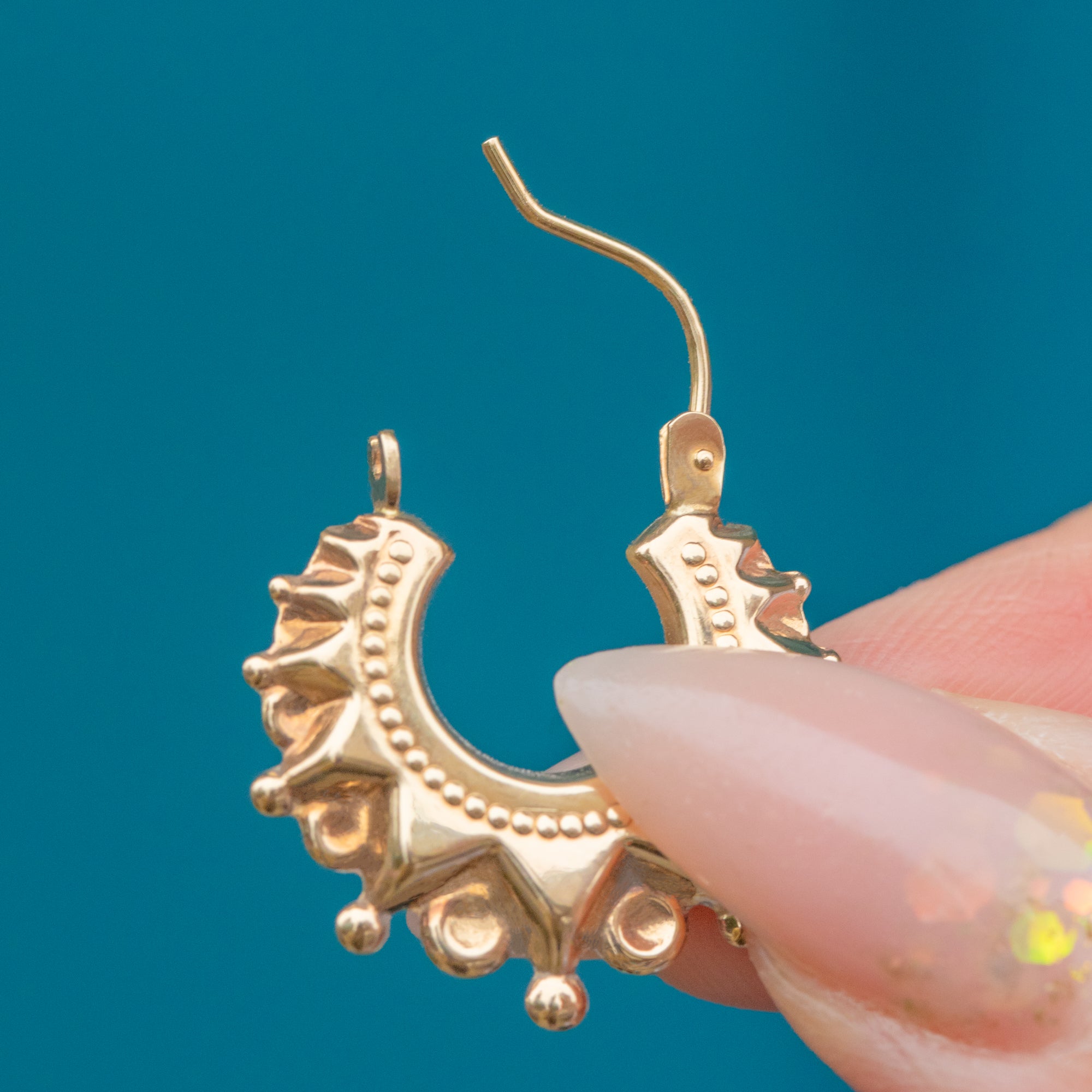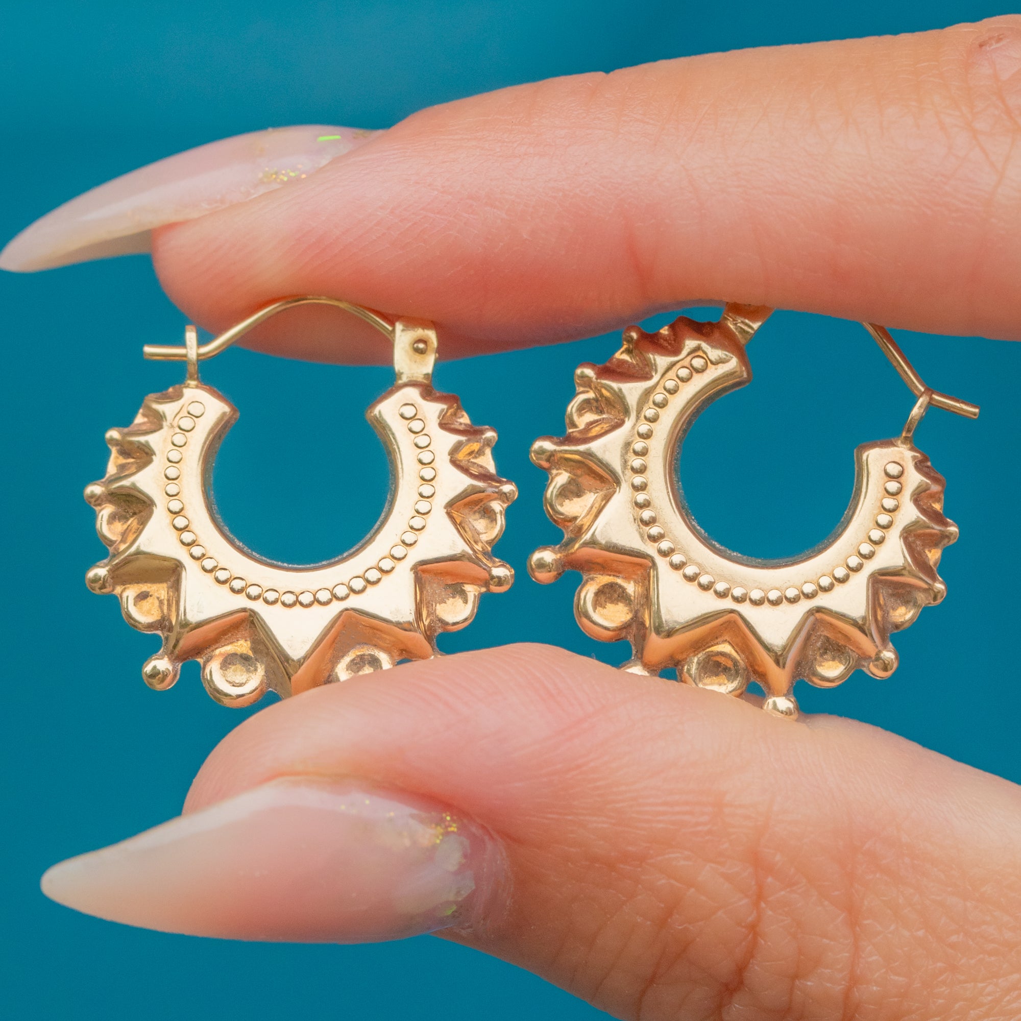 These Vintage 9ct Gold Creole hoop earrings are styled in the Etruscan revival manner, with richly textured detail and an elegant curved form. Their bold yet wearable design makes them a versatile pair that carries both antique inspiration and timeless appeal.