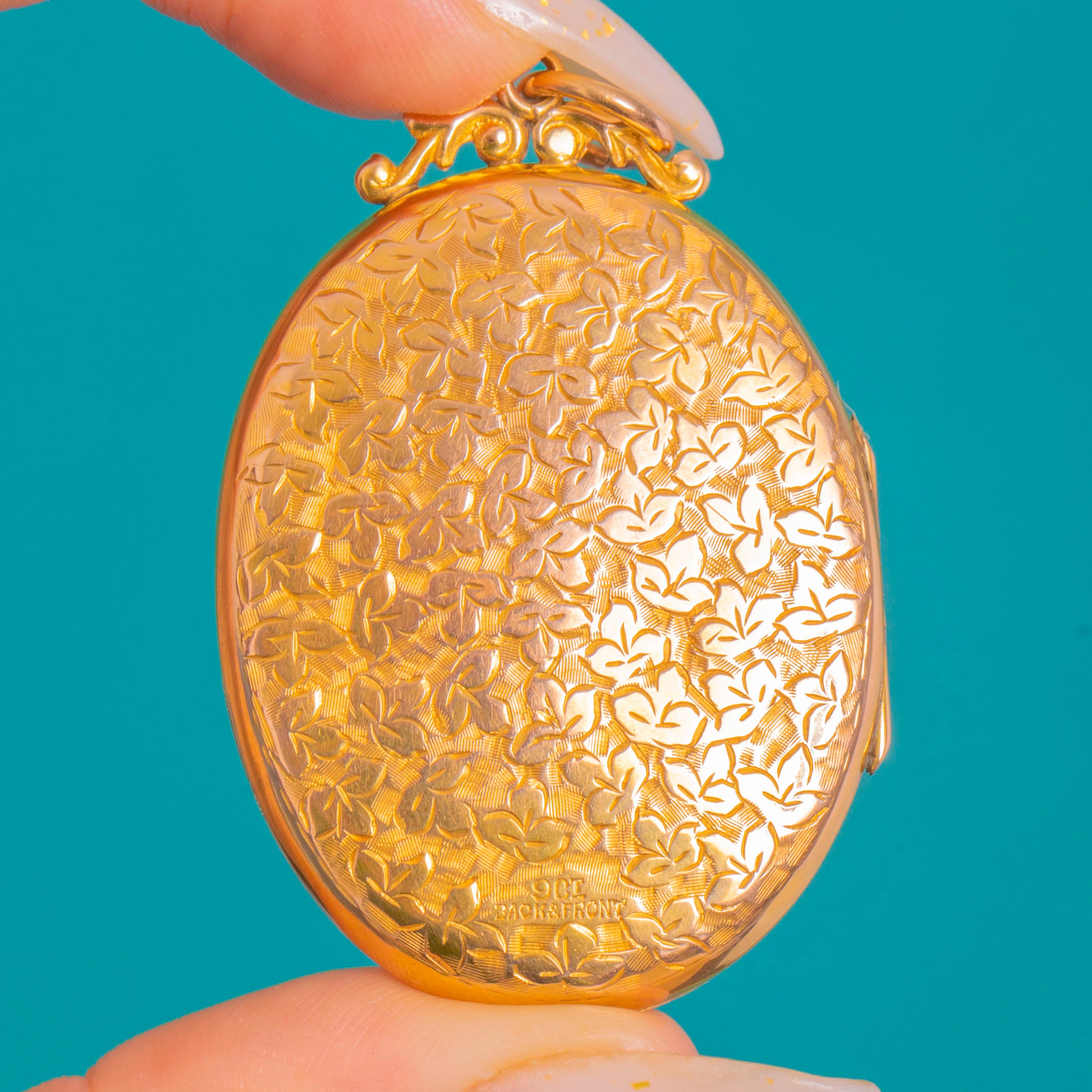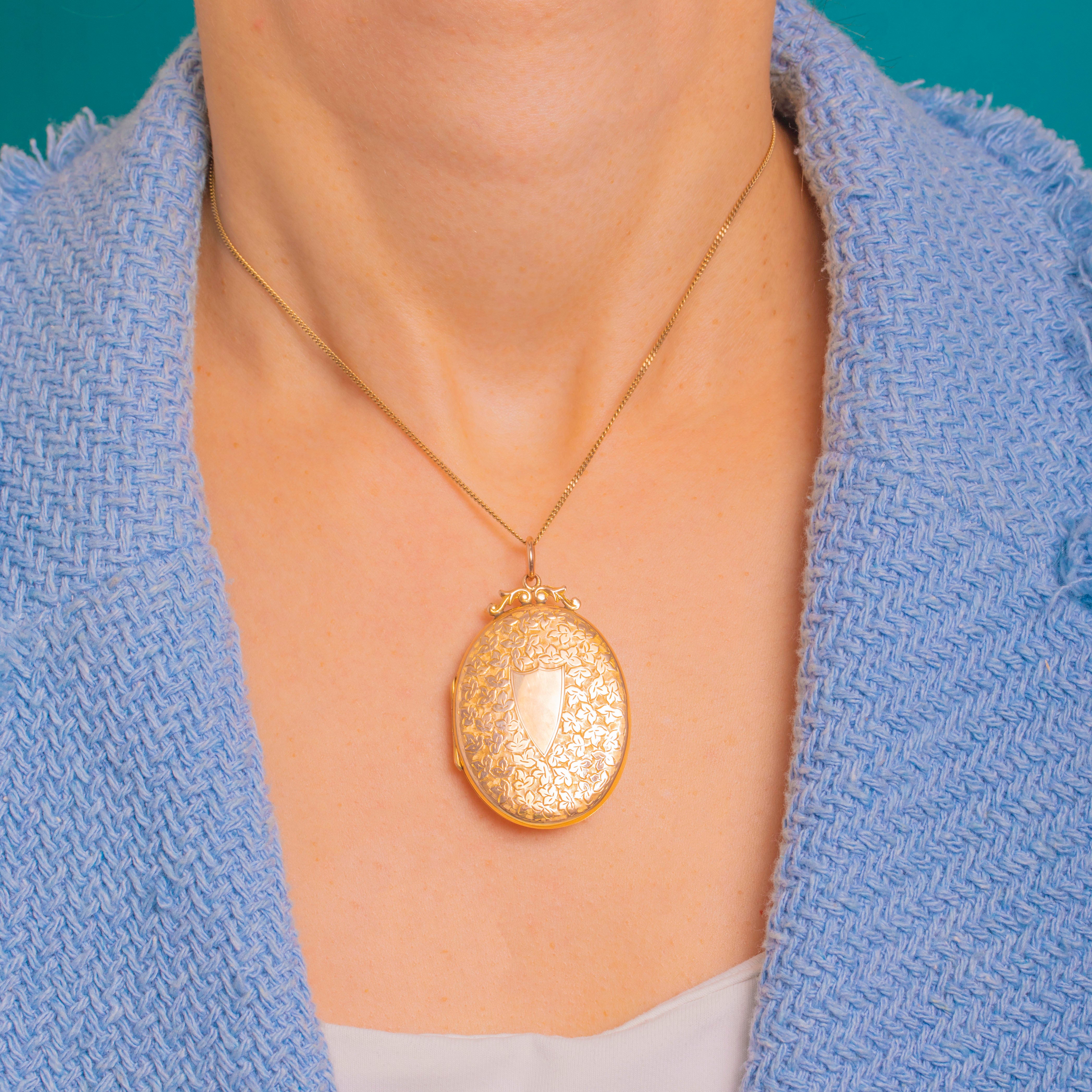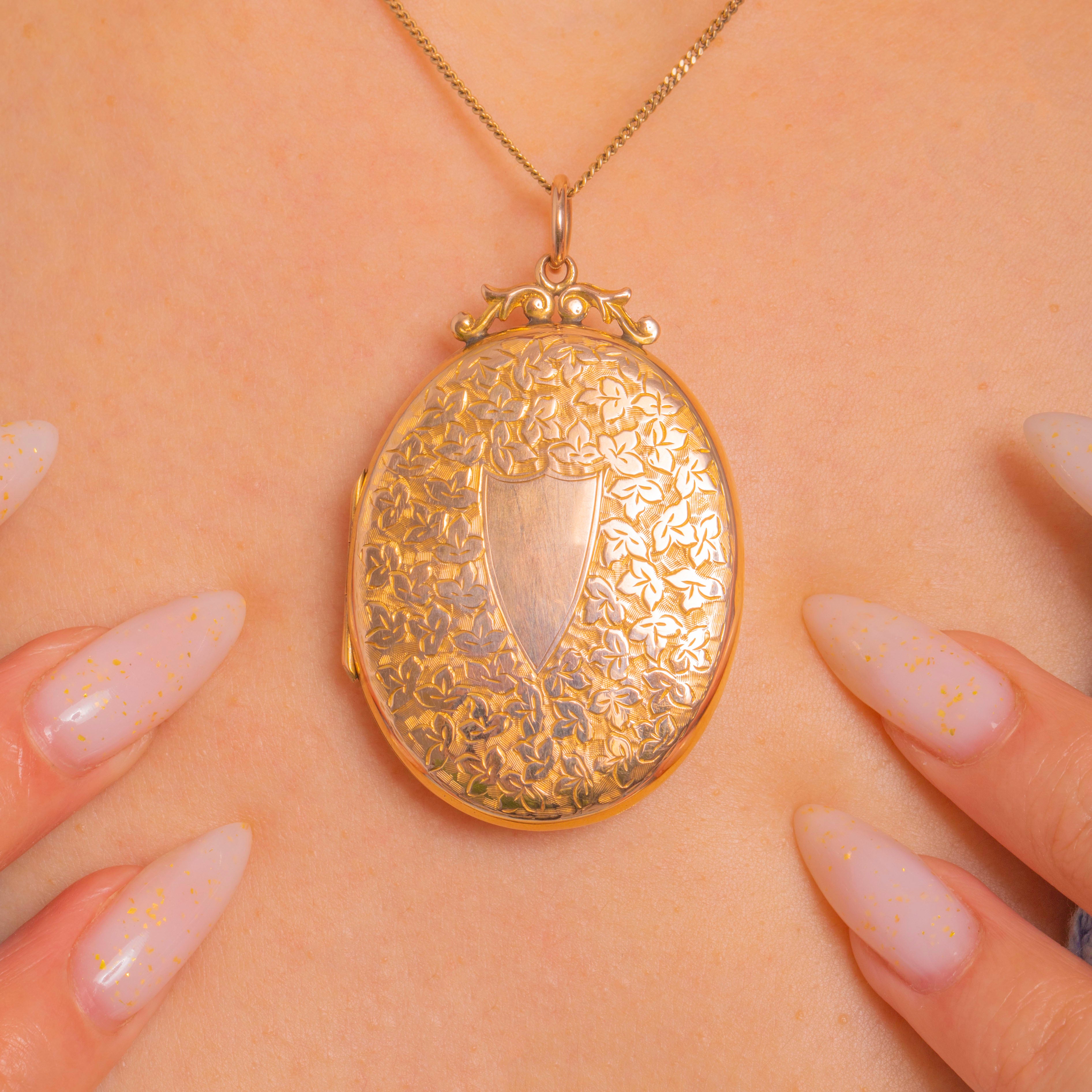 Sumptuously engraved and beautifully romantic, this large Victorian oval locket is crafted in 9ct Gold back and front with a luminous yellow glow. The domed faces are richly decorated with crisp ivy leaves, encircling a plain shield cartouche for a timeless, elegant finish. An ornate scrolled and beaded surmount with a fixed bail crowns the piece, lending extra flourish and poise.