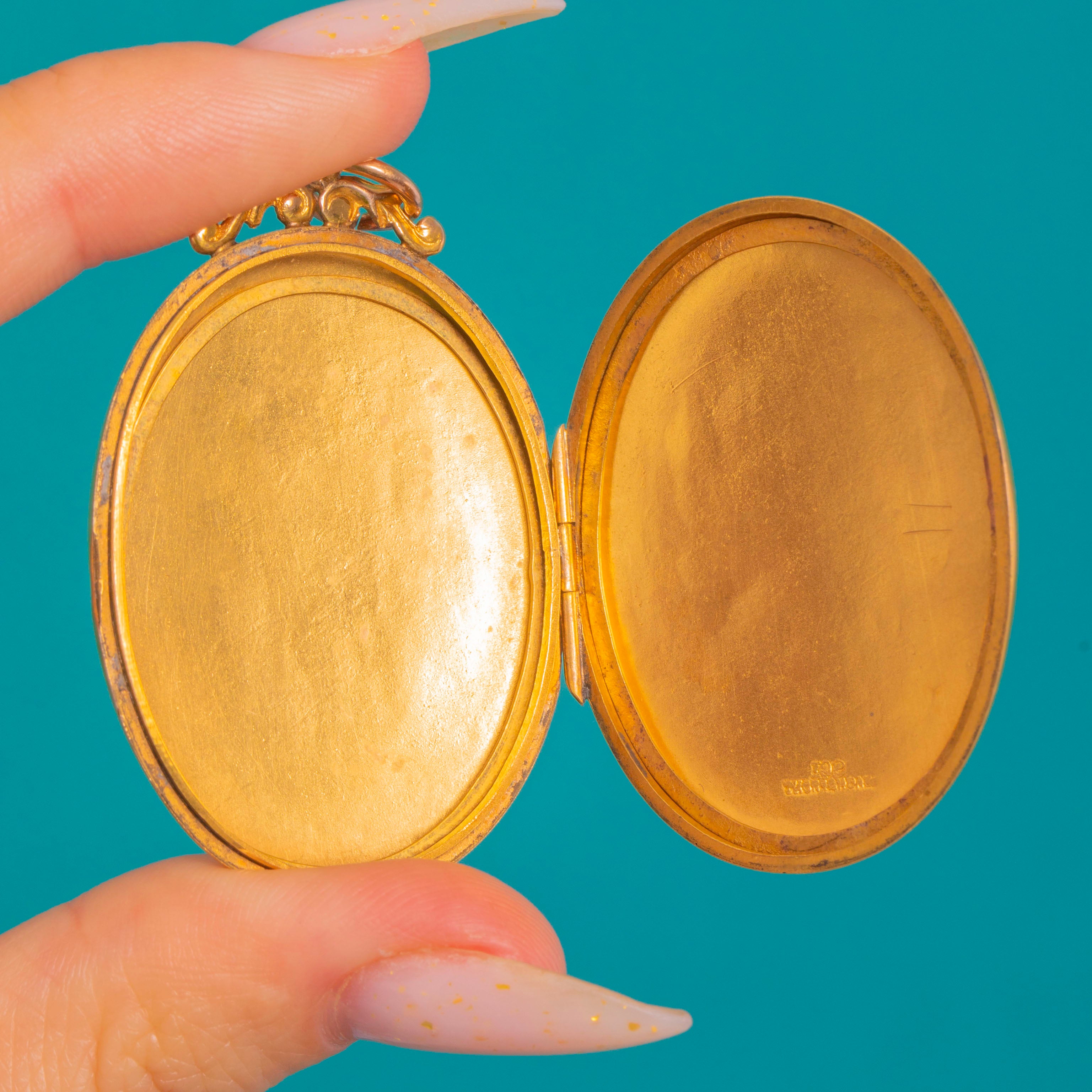 The locket opens on a sturdy side hinge with a satisfying snap closure, and the interior retains both frames, ready to cradle cherished photographs. A classic and sentimental treasure of the era.