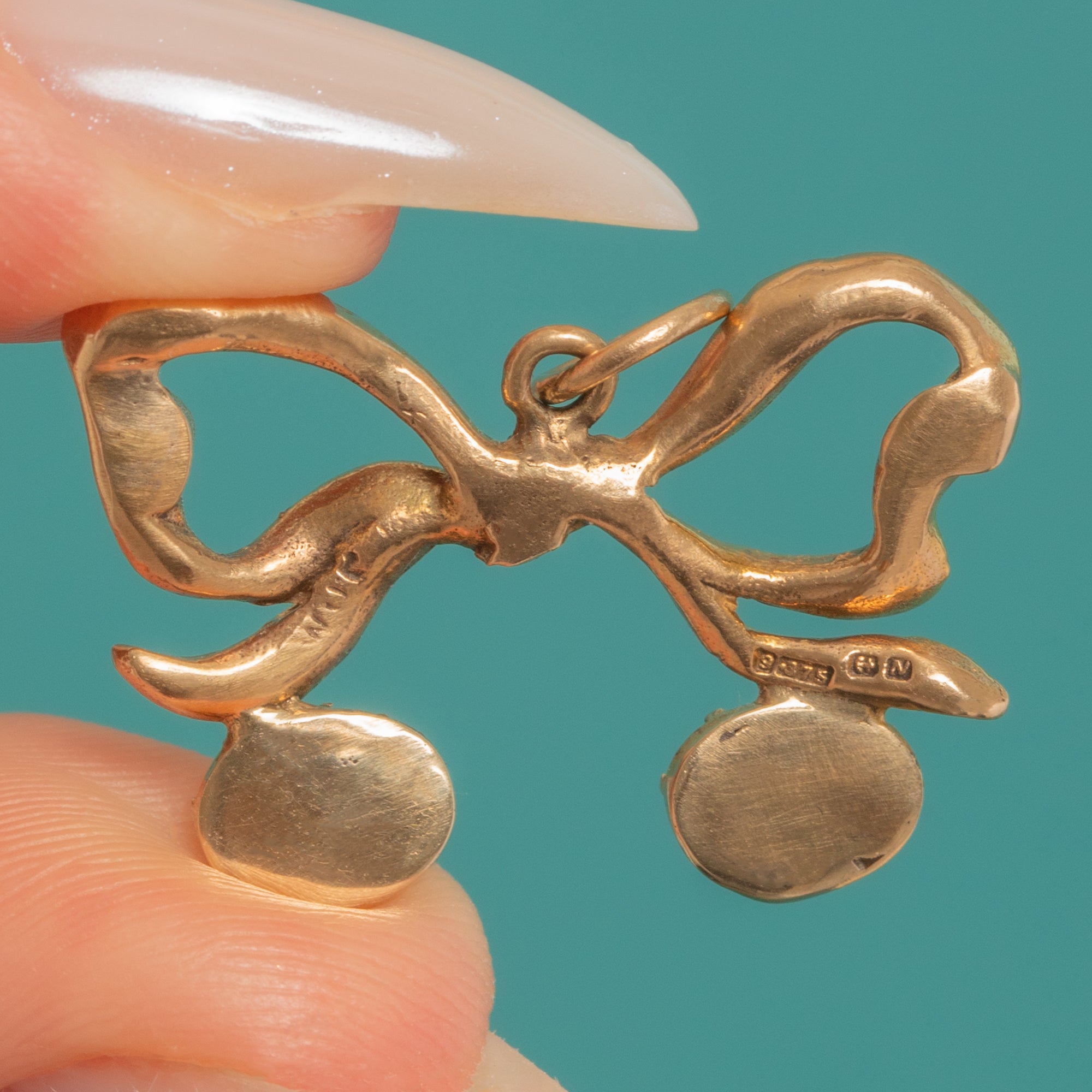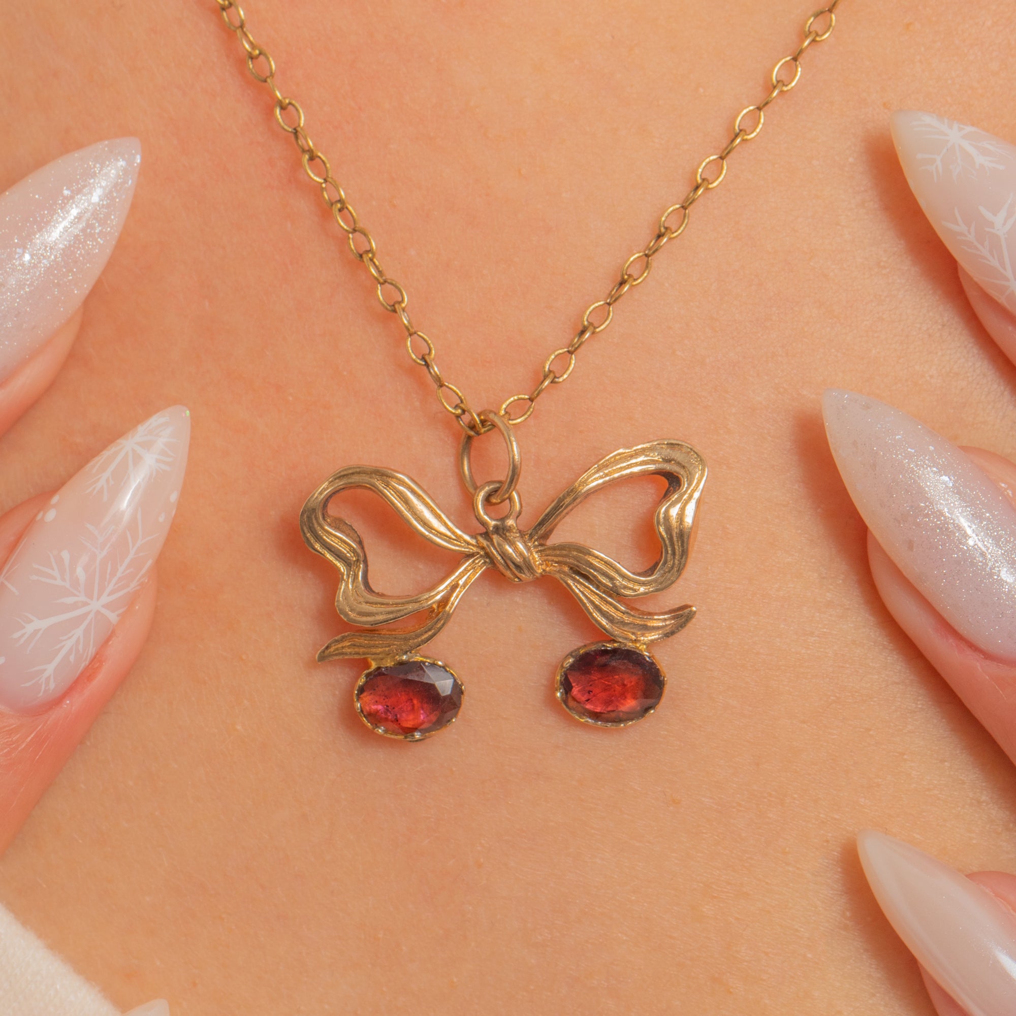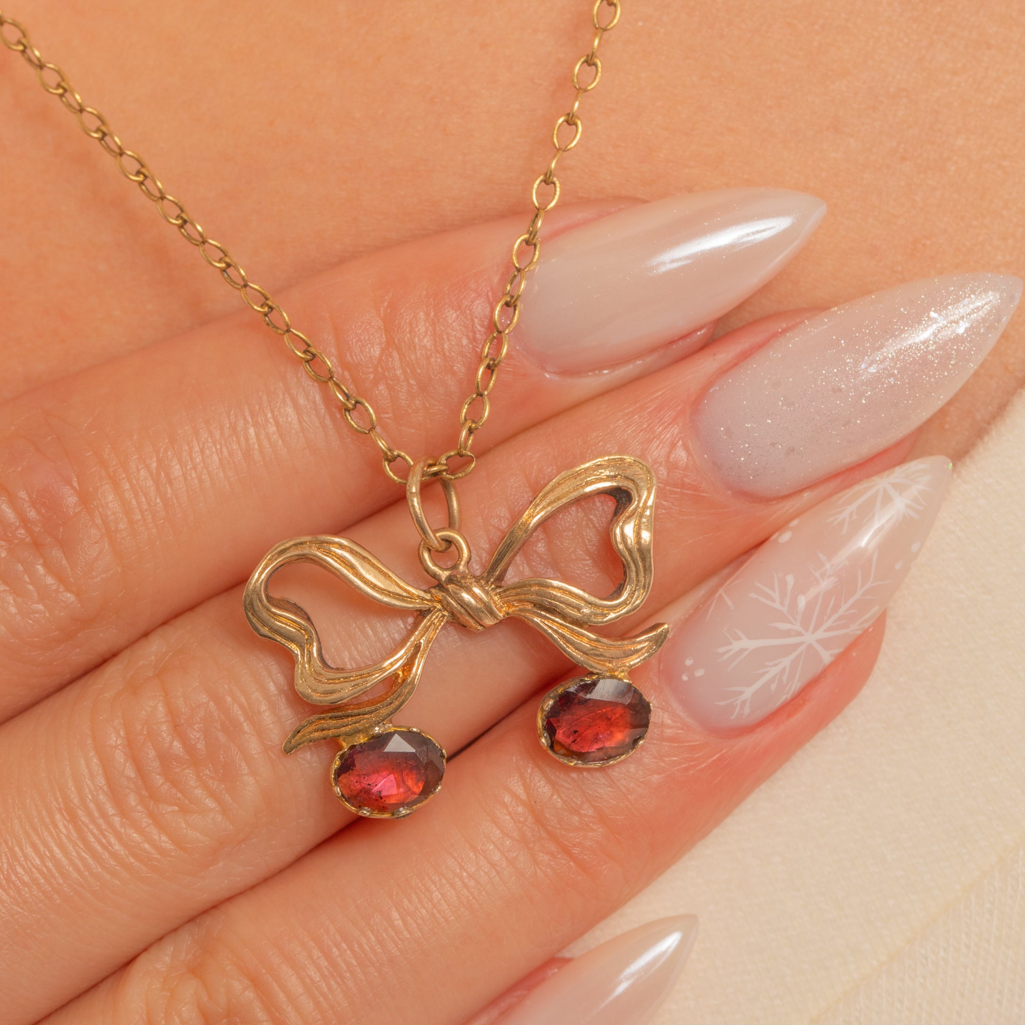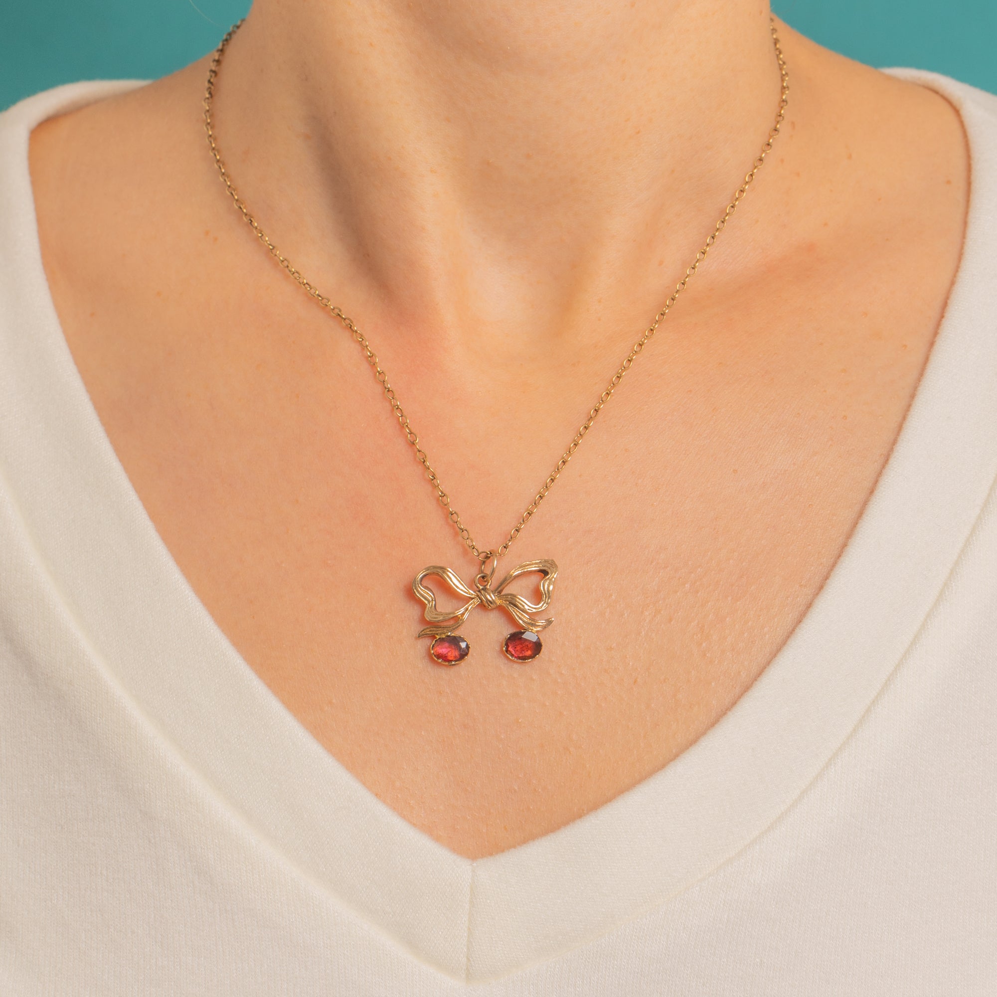 A romantic ribbon rendered in warm 9ct Gold unfurls into a graceful bow, suspending a pair of cherry-like drops that dance with every movement. The bow is crisply detailed with chased folds and the Garnet drops are neatly held in closed-back piecrust settings, their deep claret hue intensified by historic foiling.
