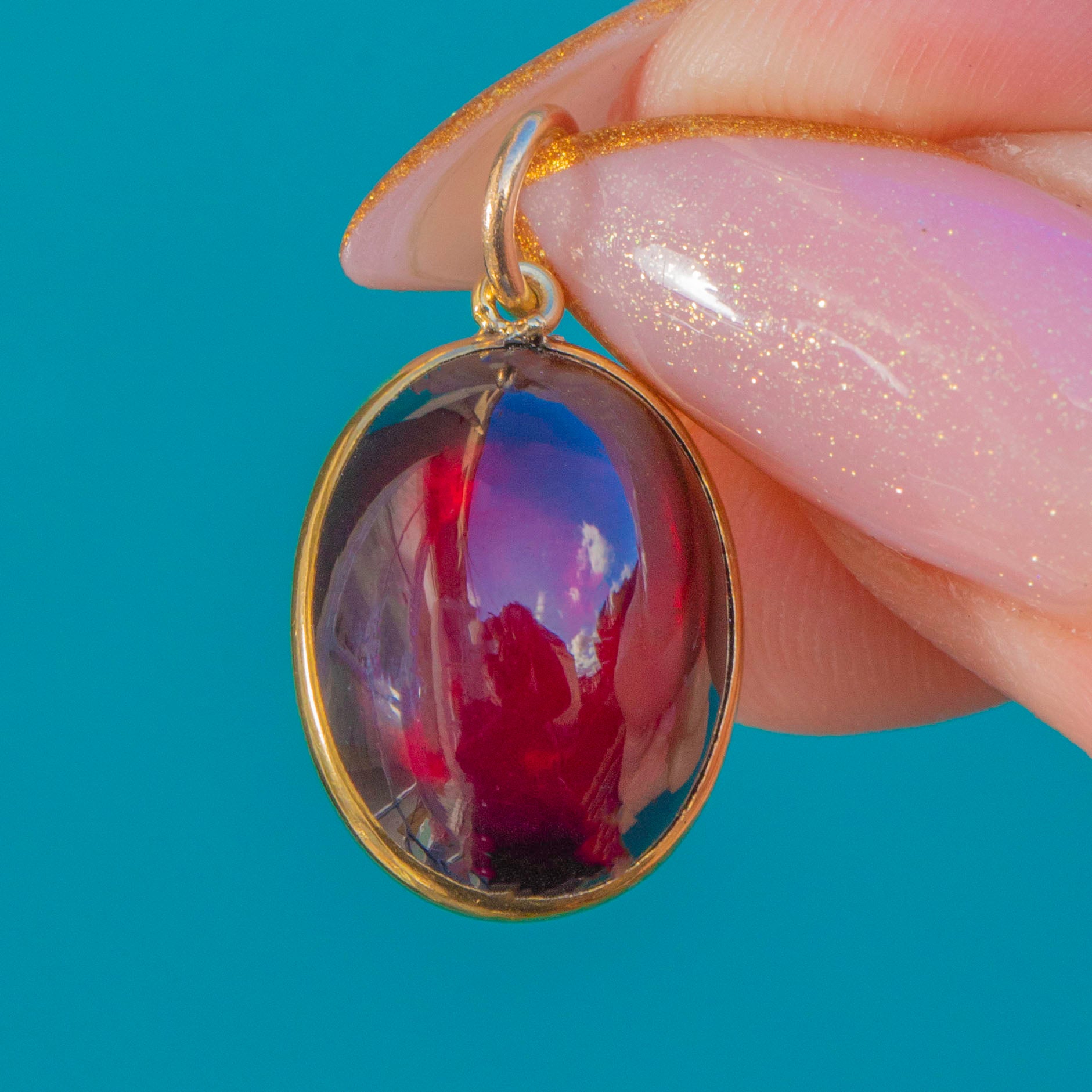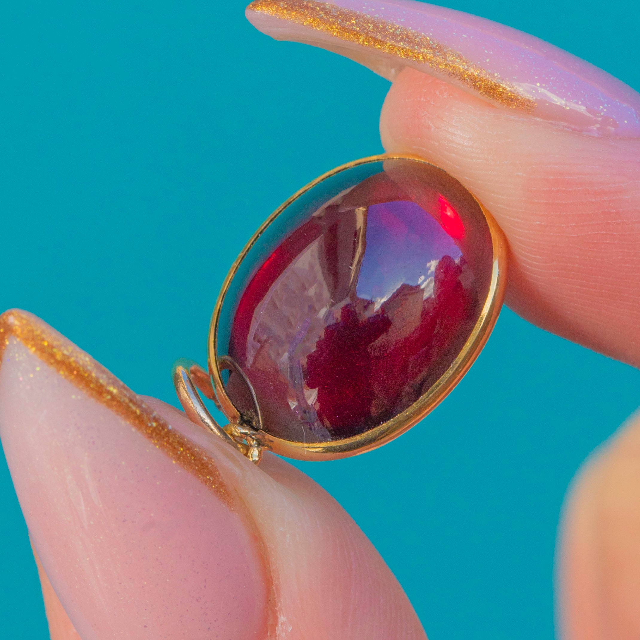 This vintage 9ct Gold charm showcases a luscious Garnet cabochon flashing rich shades of berry-red, magenta and plum. Beautifully domed with a glossy sheen, the cabochon glows with depth and warmth, catching the light with every movement.
