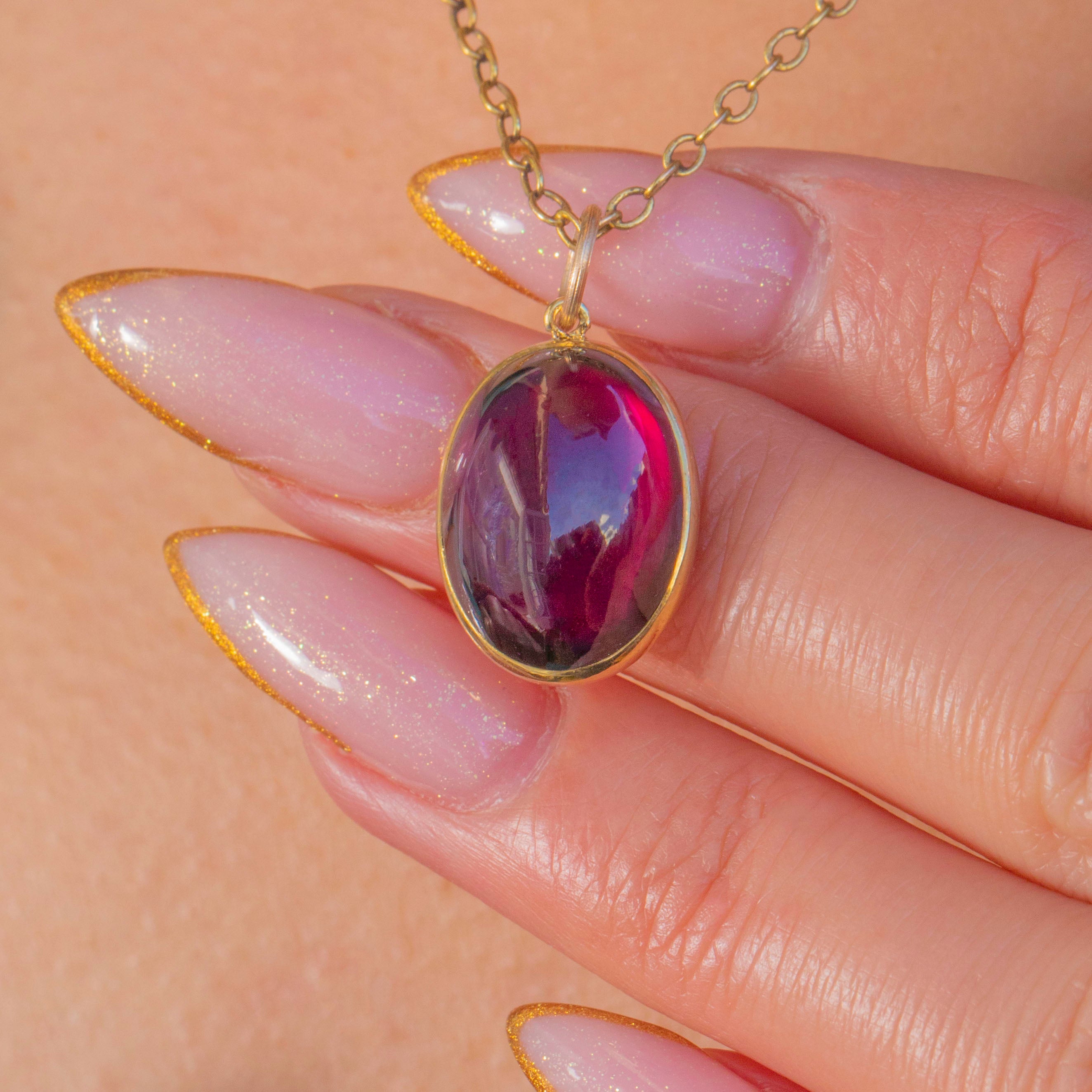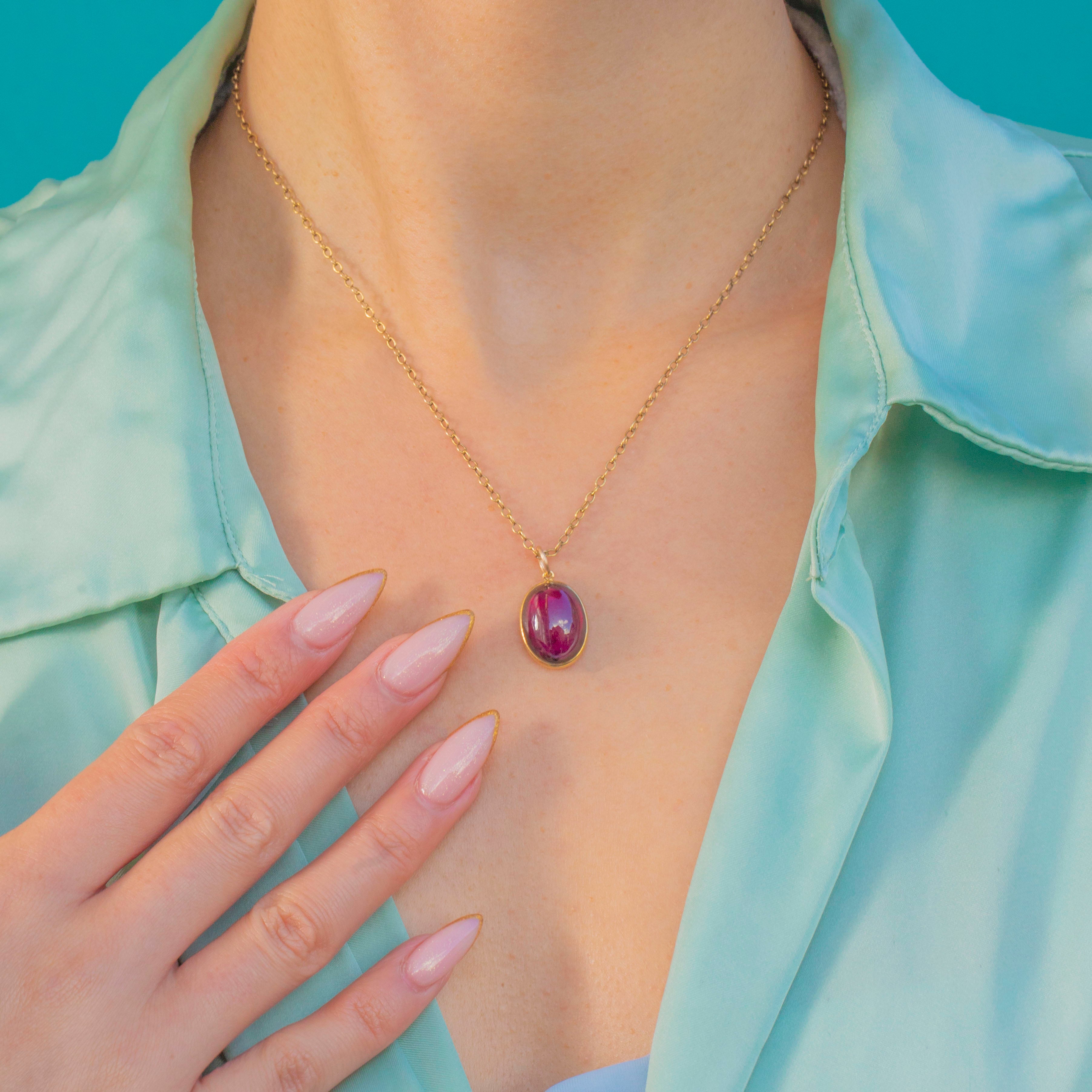 The Garnet is bezel-set in a simple oval frame with a smooth closed back, giving the piece a clean, timeless look that works perfectly on a fine chain or layered into a charm stack. With an estimated 2.20ct Garnet, this charming pendant brings a bold pop of colour to everyday outfits and special occasions alike.