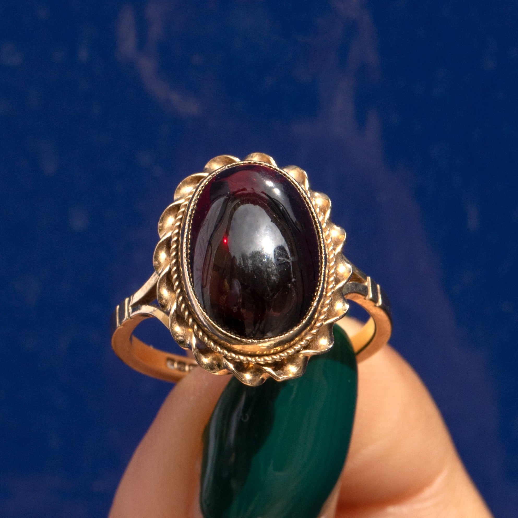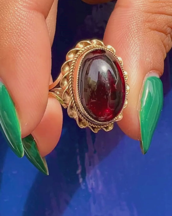 The smooth, sensual form is adorned with 9ct Gold rope borders giving this vintage Granet ring a sophisticated appeal. And when the light hits just right, it's a truly magical thing that seems to glow from within!