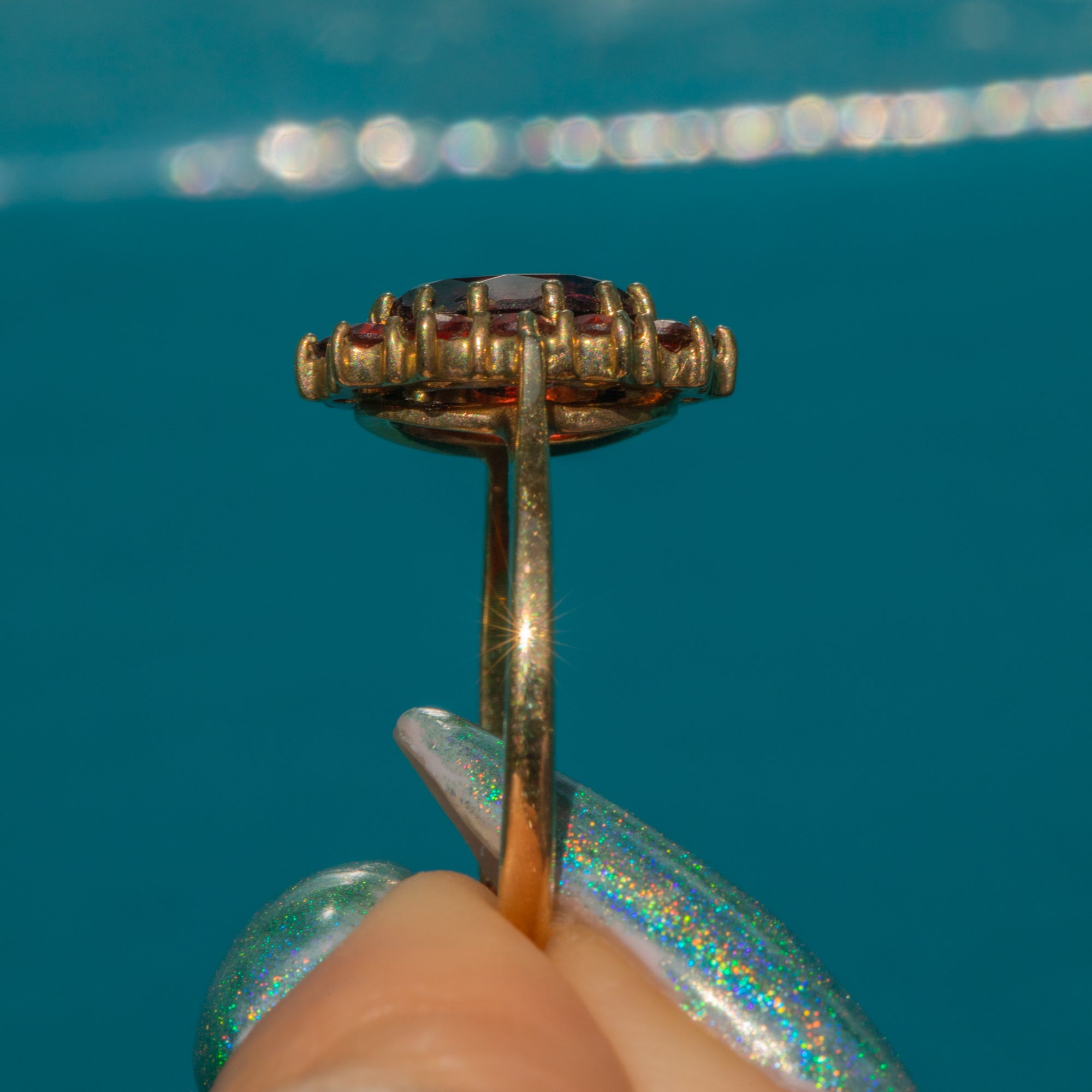 This 9ct Gold Garnet flower cluster ring is bursting with romance and seduction. Her juicy crimson hues bounce from one Garnet to the next, forming her feminine floral cluster that provides wonderful hand coverage.