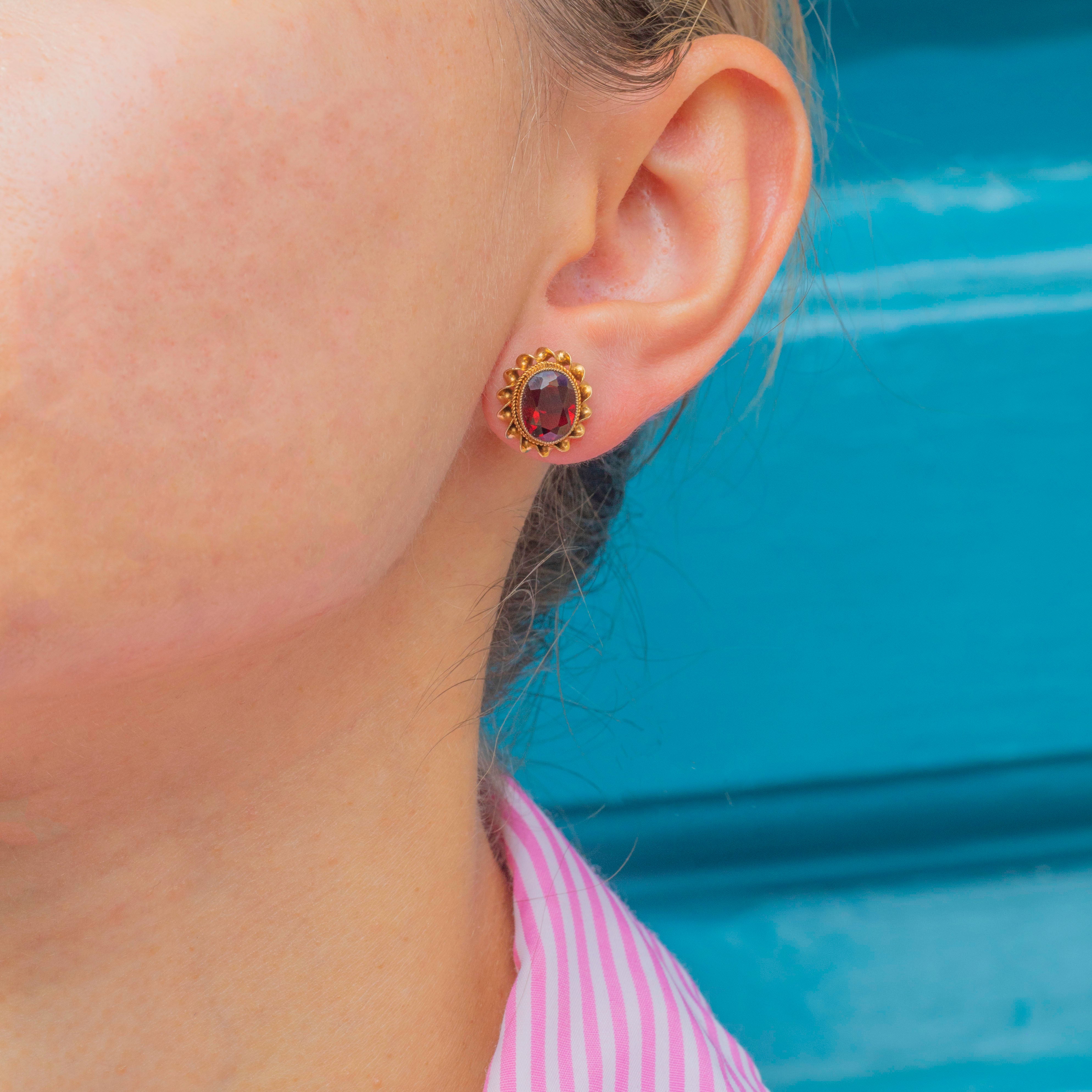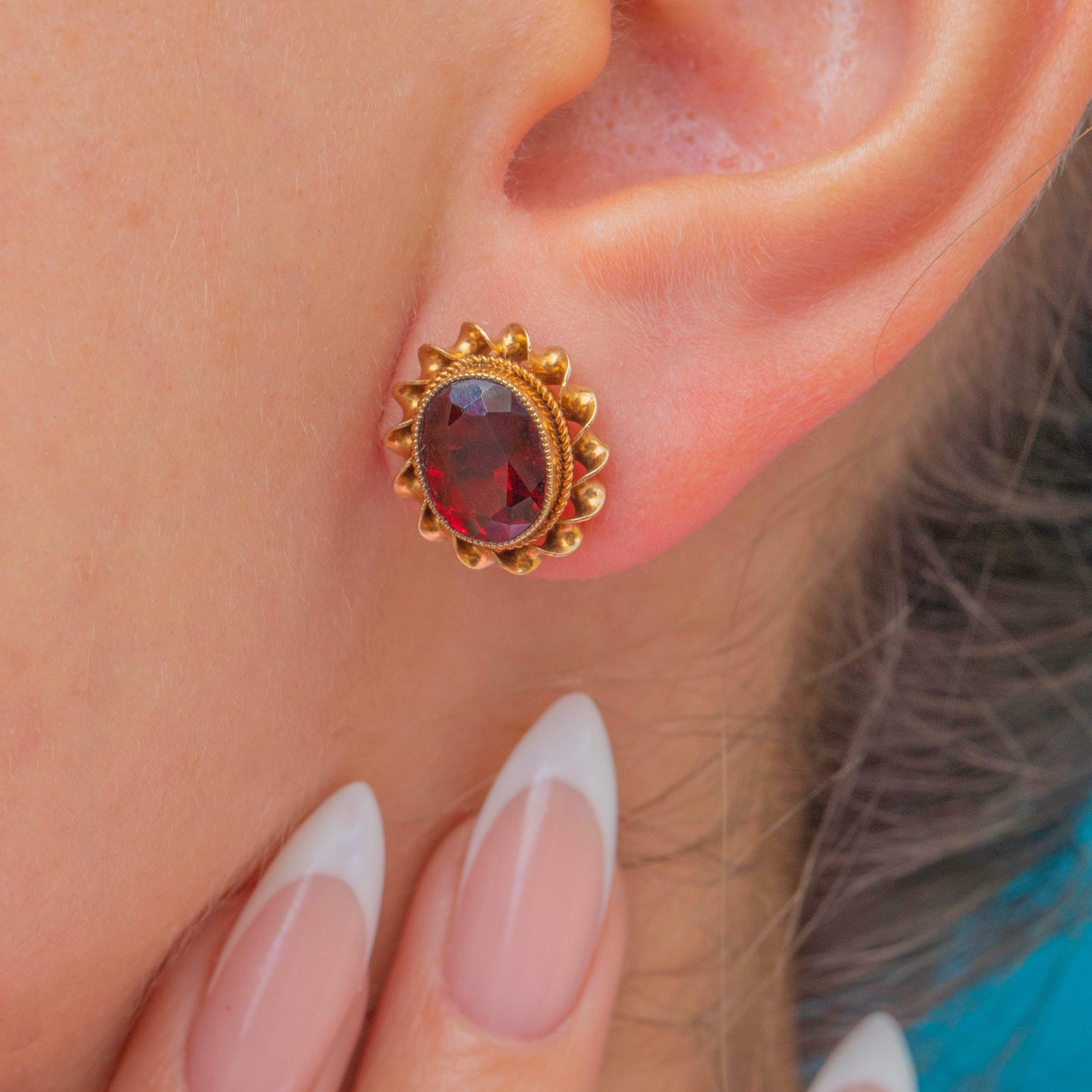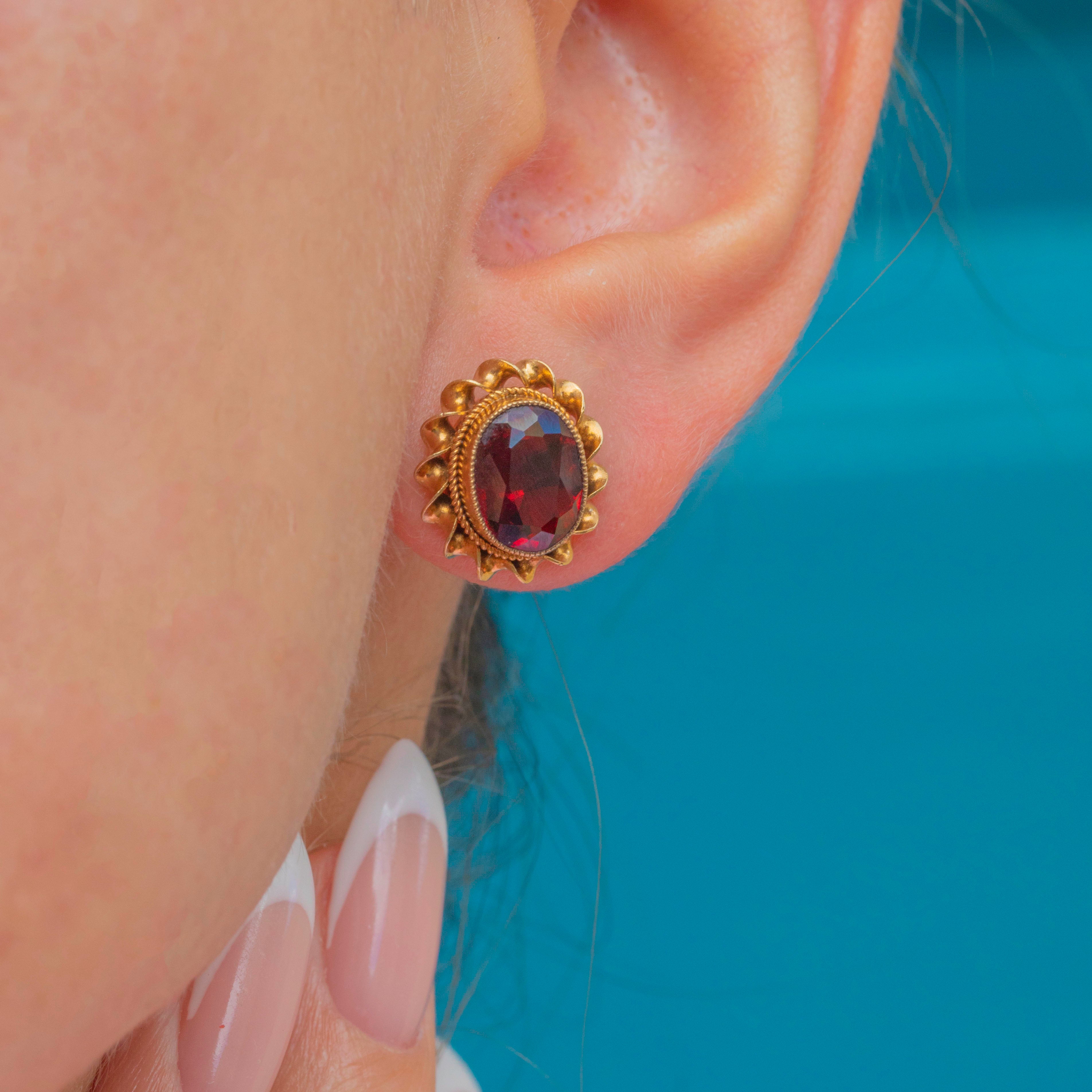 Elegant Mid-Century Vintage Garnet stud earrings in solid 9ct Gold, each gemstone framed by a twisted rope border for rich texture and sparkle. The oval Garnets display a deep, velvety red and sit proudly in their gold settings, offering timeless everyday glamour with a refined vintage finish.