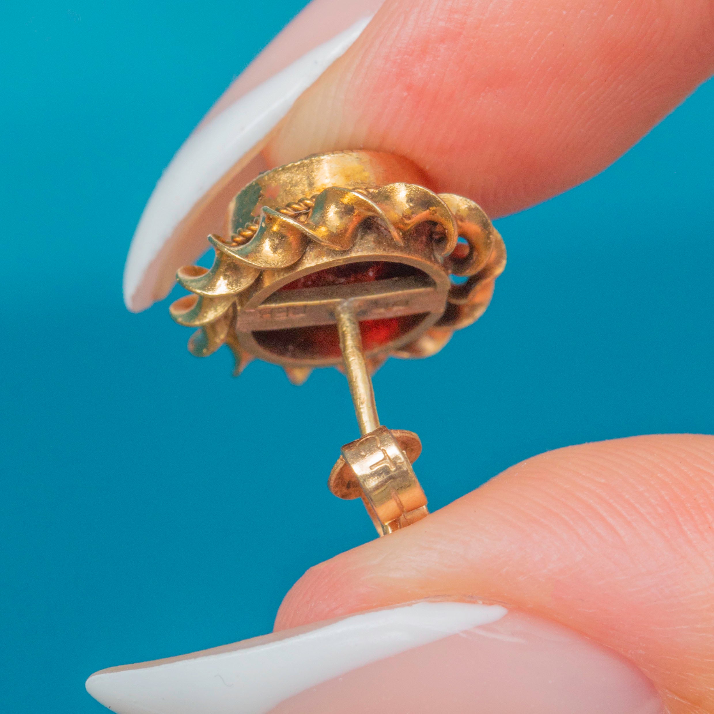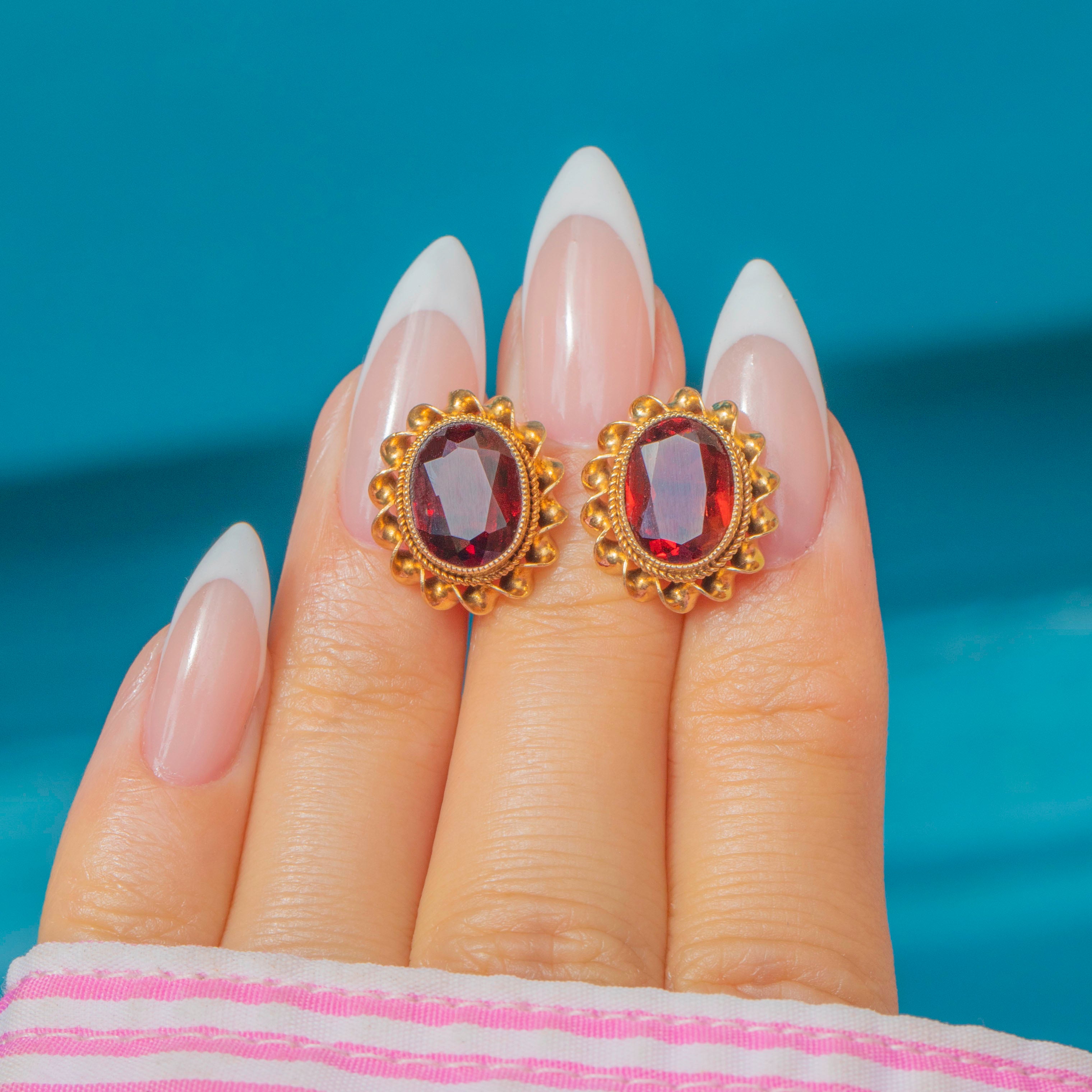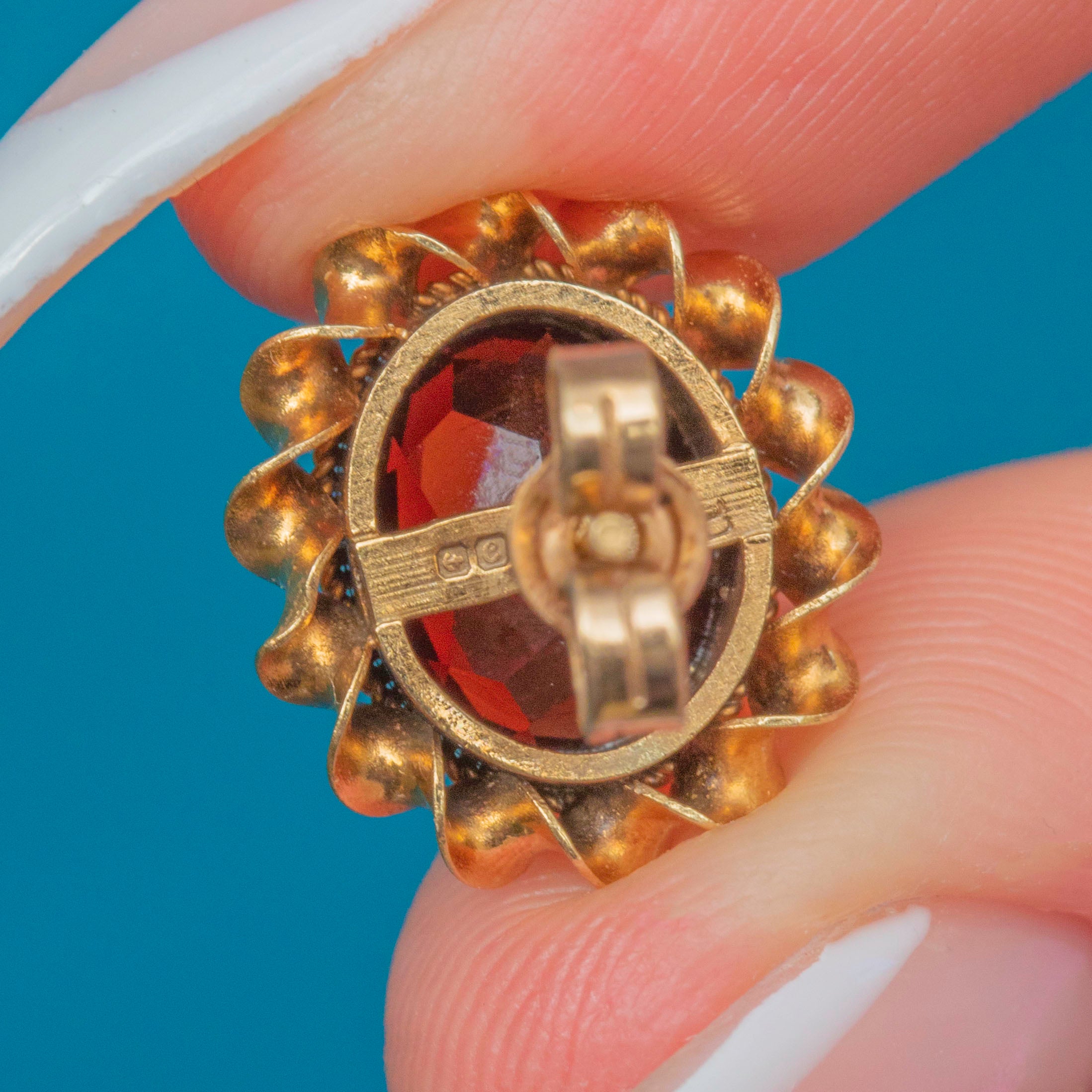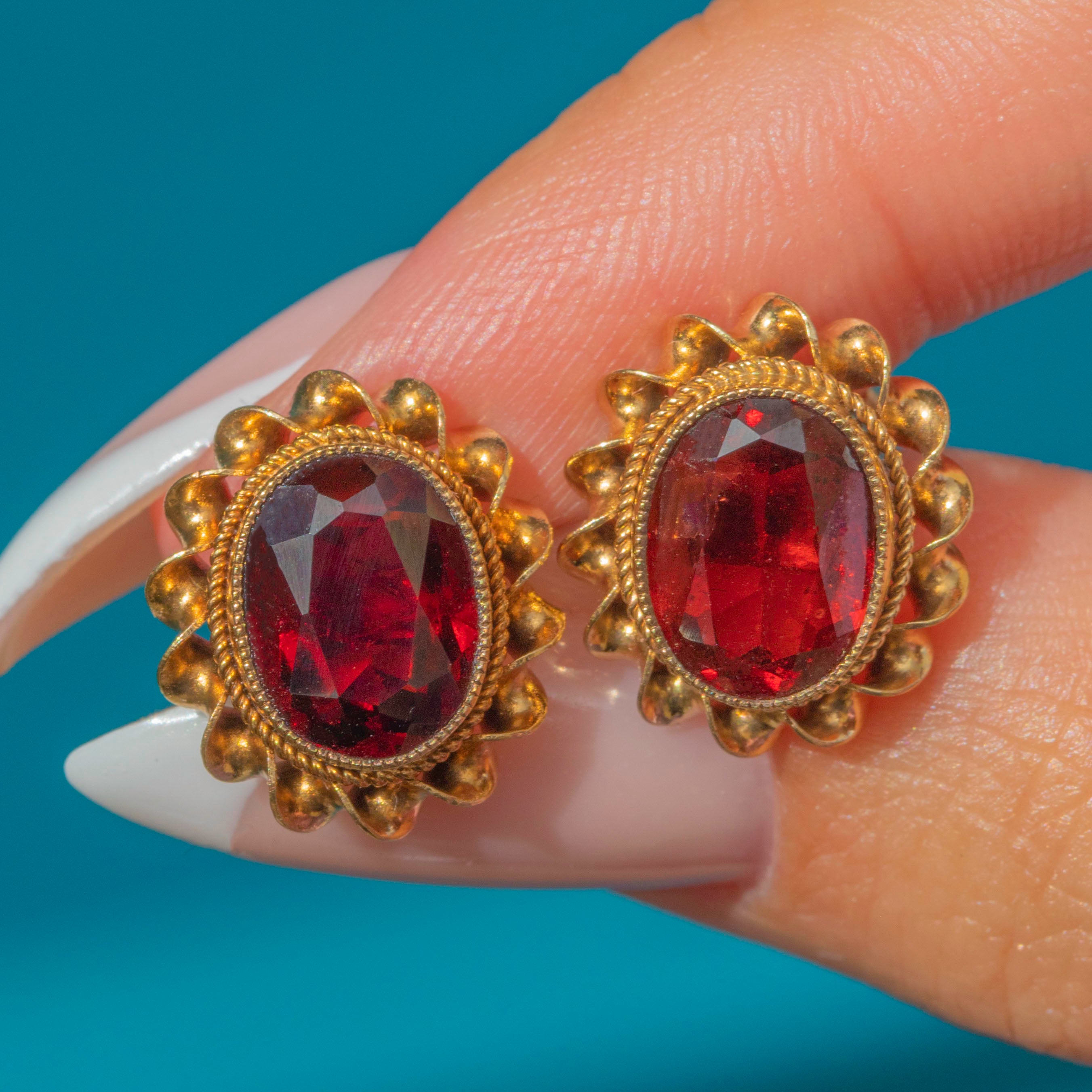 Elegant Mid-Century Vintage Garnet stud earrings in solid 9ct Gold, each gemstone framed by a twisted rope border for rich texture and sparkle. The oval Garnets display a deep, velvety red and sit proudly in their gold settings, offering timeless everyday glamour with a refined vintage finish.