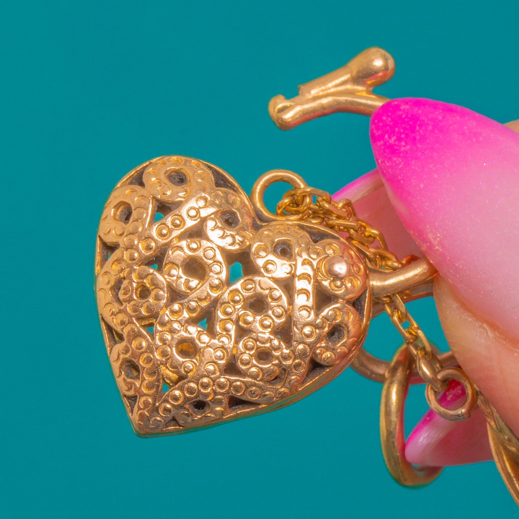 Richly romantic and wonderfully substantial, this Victorian 9ct Gold heart padlock bracelet is a timeless classic. The bracelet is composed of bold, flattened oval links intricately engraved with scrolling foliate motifs, culminating in an ornate heart-shaped padlock clasp with pierced detailing. At 20.5g, it has a deliciously weighty feel and a graceful drape on the wrist, complete with a short safety chain for that quintessential period touch.