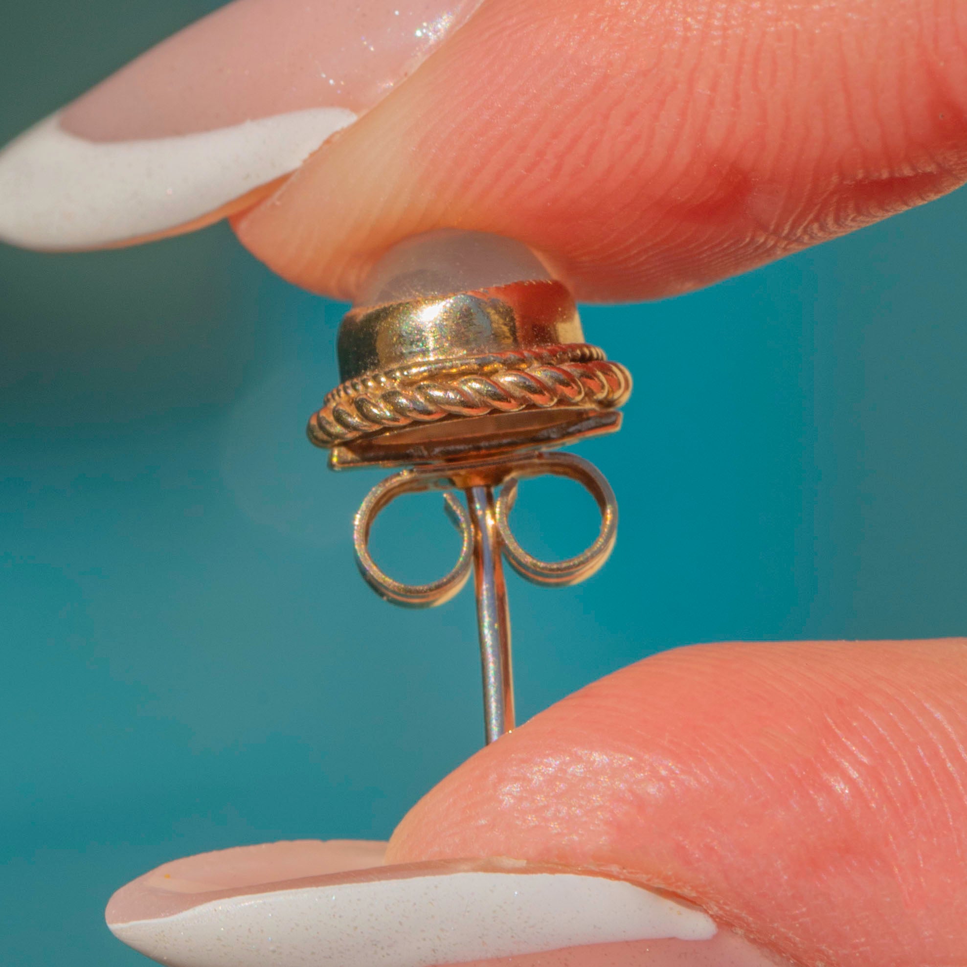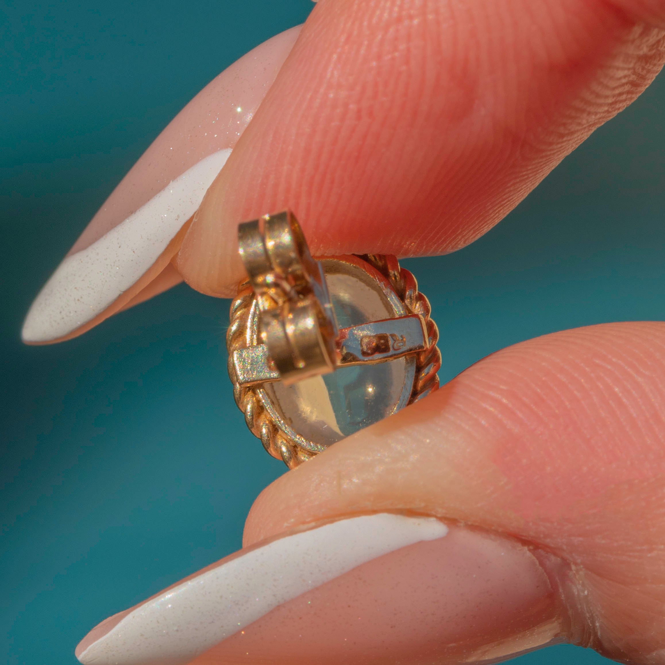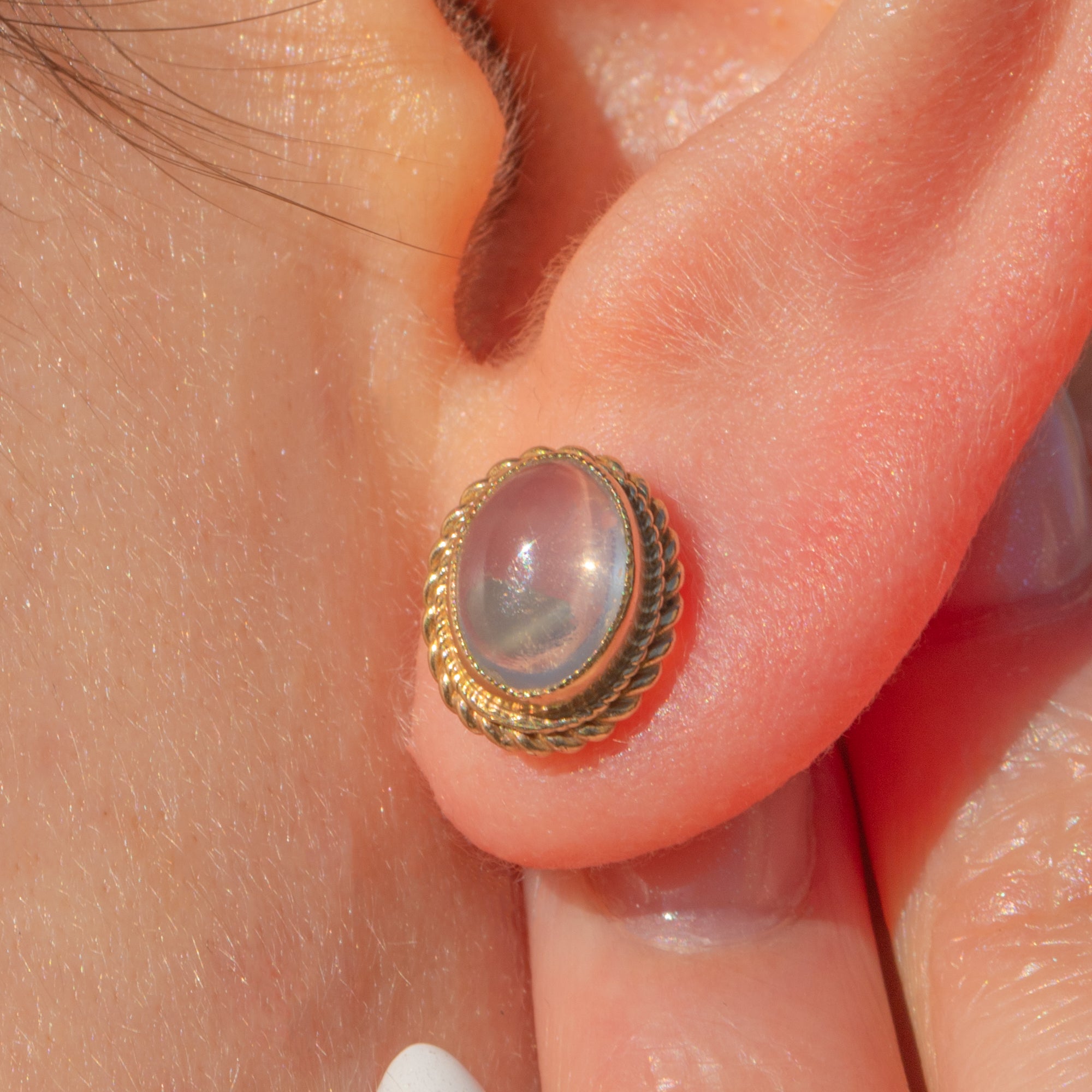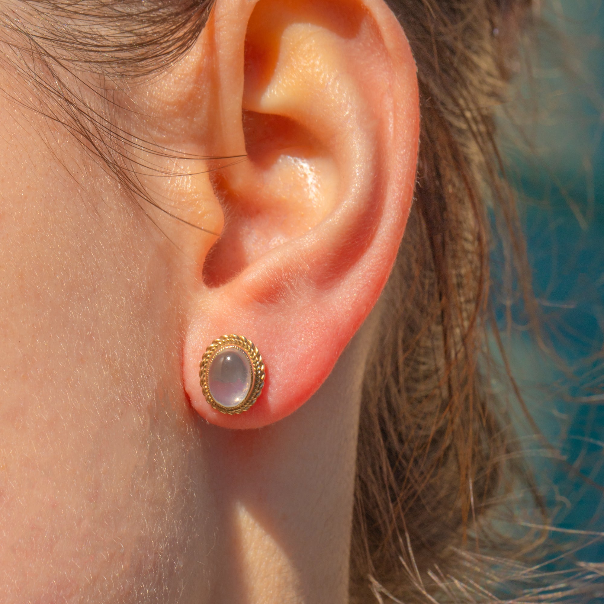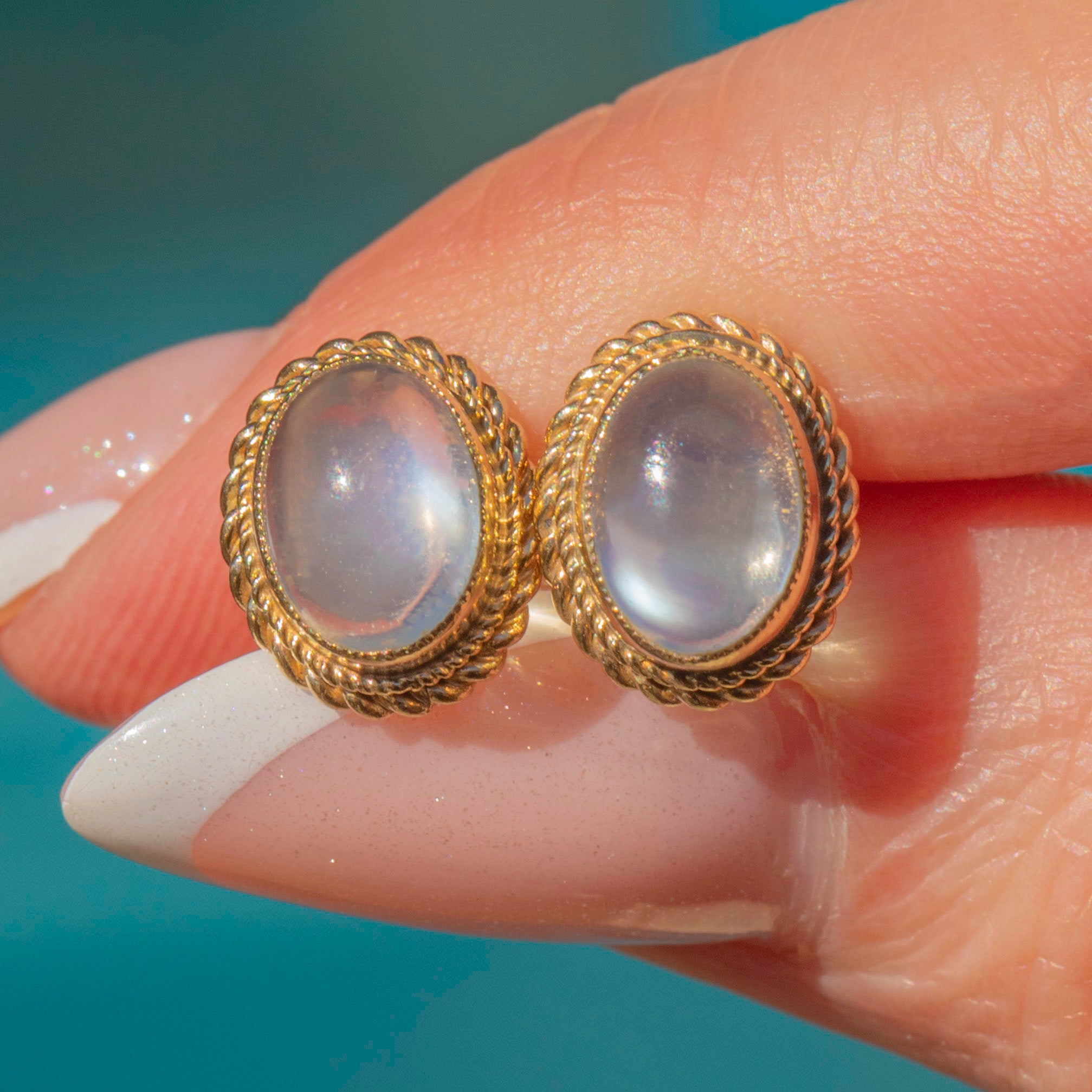 In the centre of each vintage earring sits a plump Moonstone cabochon, billowing a whimsical adularescence as they move in the light. They are encircled by buttery 9ct Gold rope borders, giving them a striking, decorative finish.
