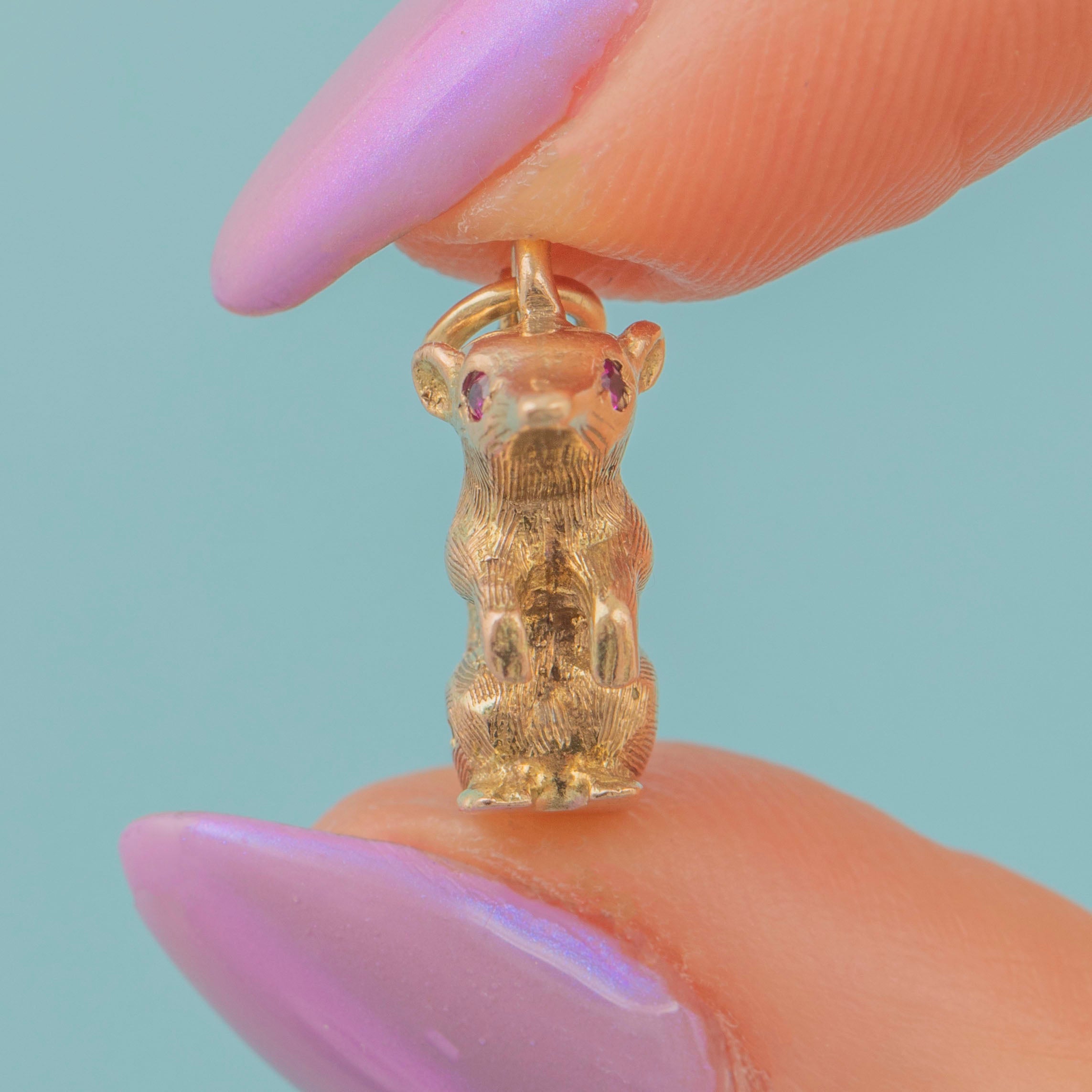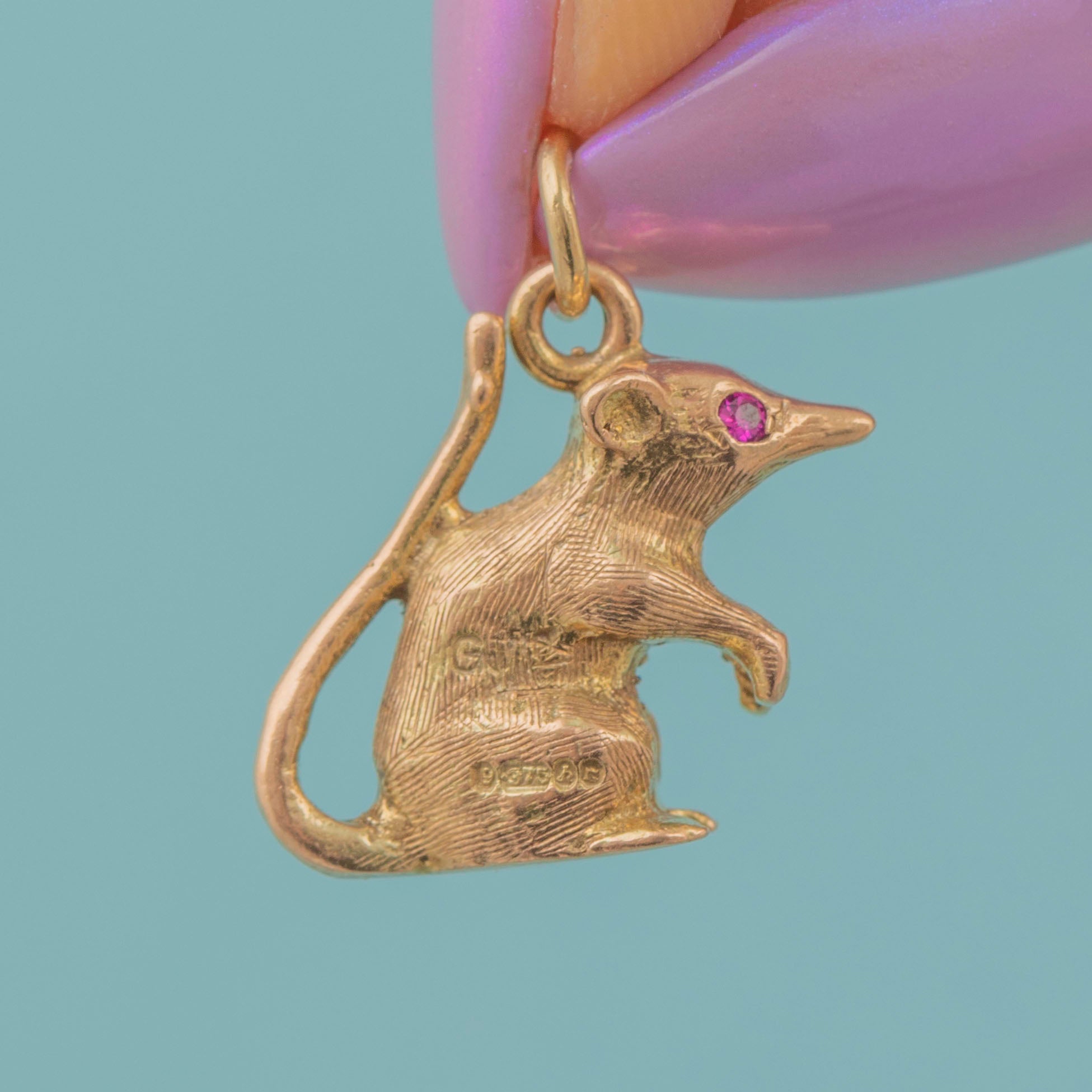 This adorable 9ct Gold mouse pendant is full of charm and character, with delicate detailing that brings it to life! Her tiny, polished body is perfectly accented by two sparkling Ruby eyes, giving it a sweet and inquisitive expression.