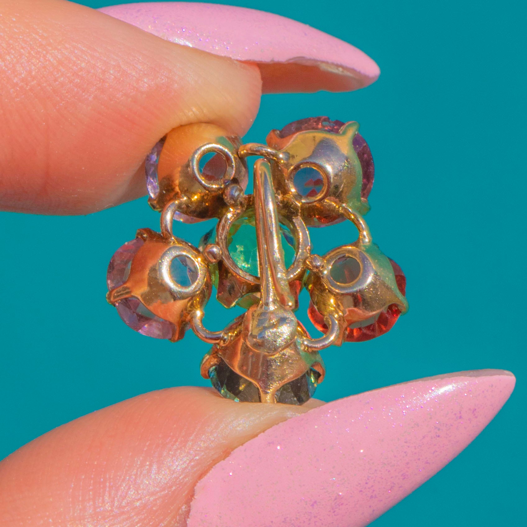 A jubilant bouquet of colour, these mid-century flower earrings are a joy to behold. Each earring centres on a lively Peridot, encircled by a halo of vibrant gemstones that shimmer in a tight floral cluster, creating a playful yet polished look that sits neatly against the lobe.