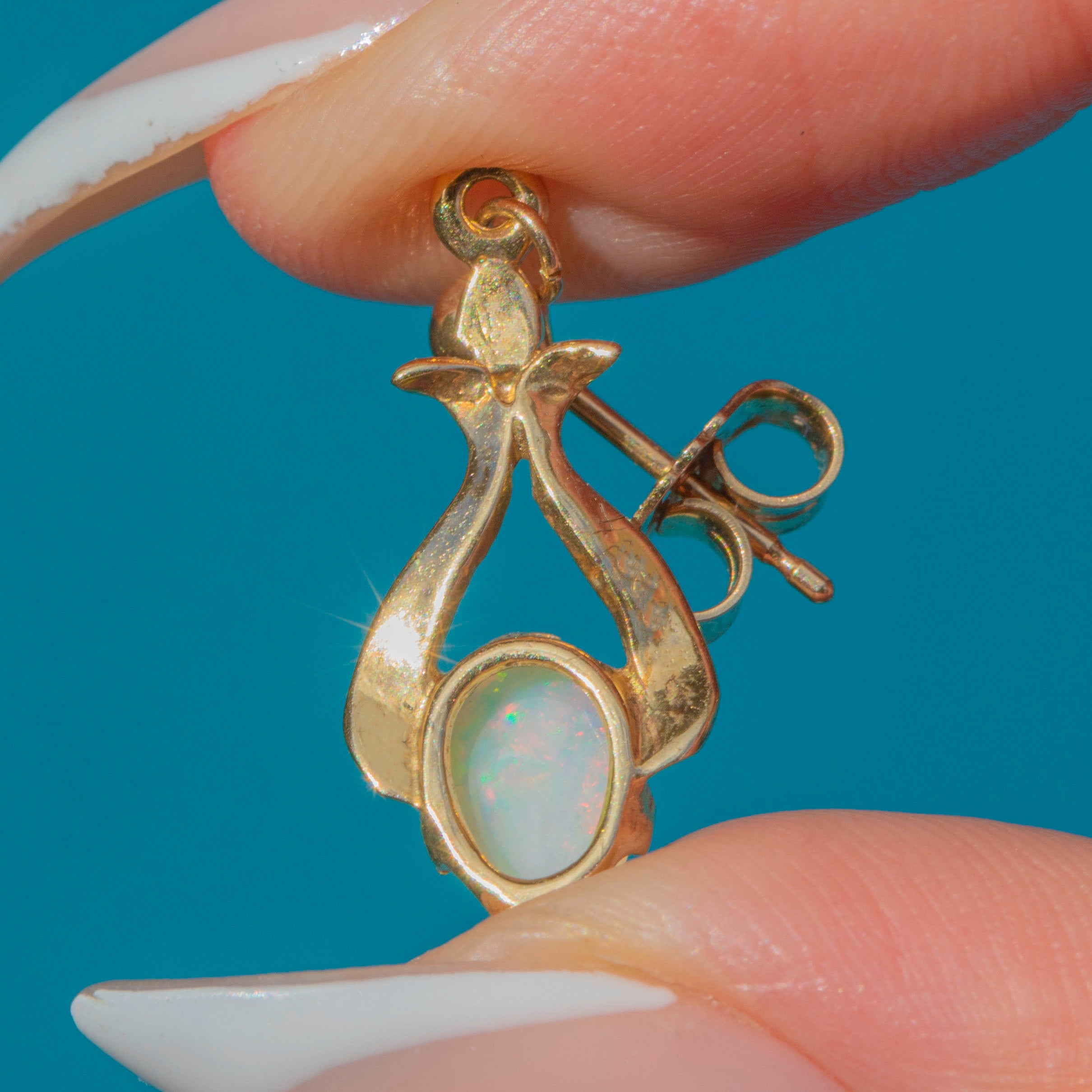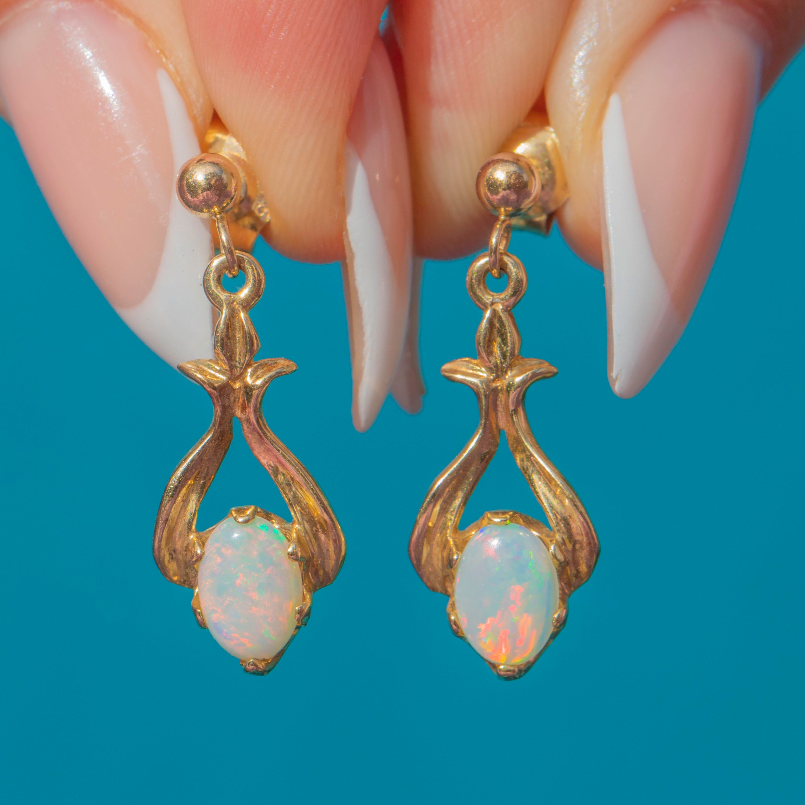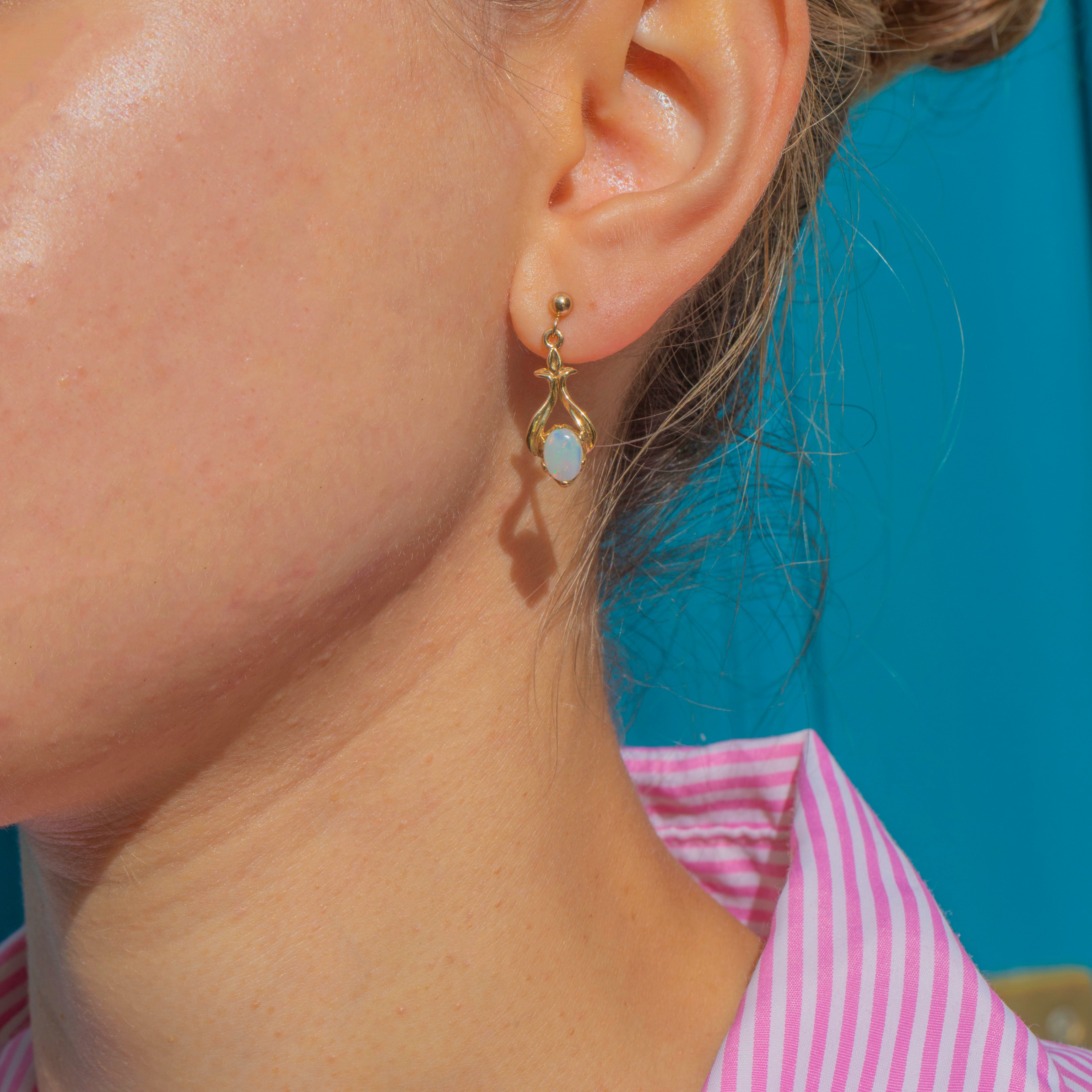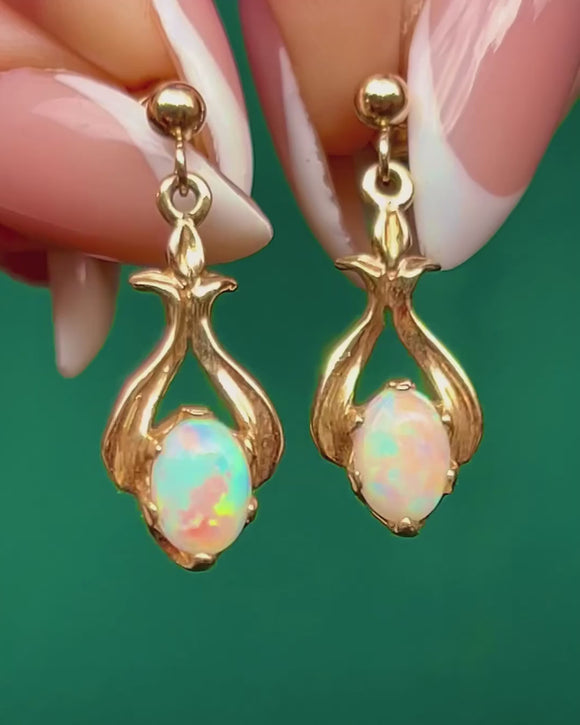 EXCELLENT: The Opals are in superb condition, displaying vibrant play-of-colour with no chips or abrasions. The Gold settings are in excellent shape with a smooth, polished finish, and the fittings are secure. Overall, these earrings have been very well cared for with minimal signs of wear.